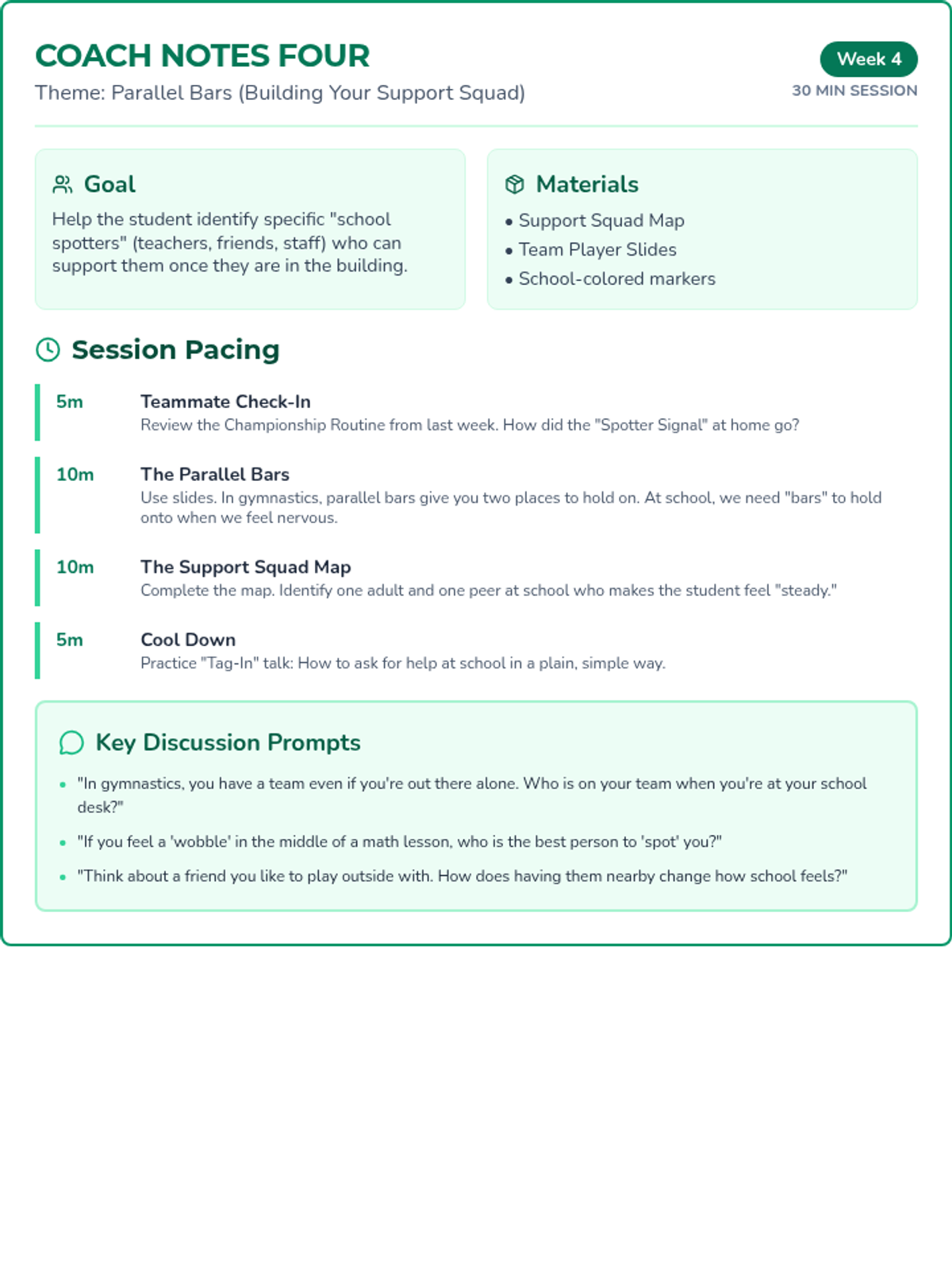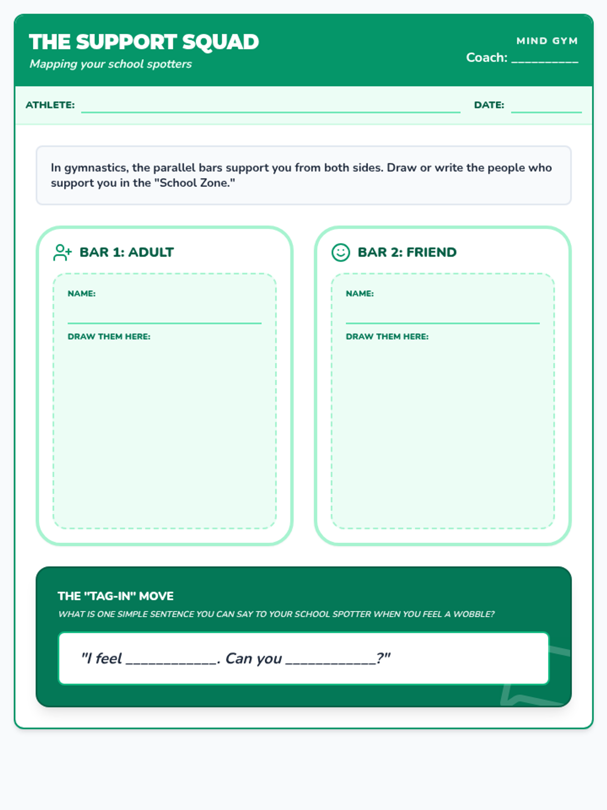 Focuses on building a 'support squad' at school. Using the metaphor of parallel bars, the student identifies people at school who can act as 'spotters' when they feel wobbly during the day.