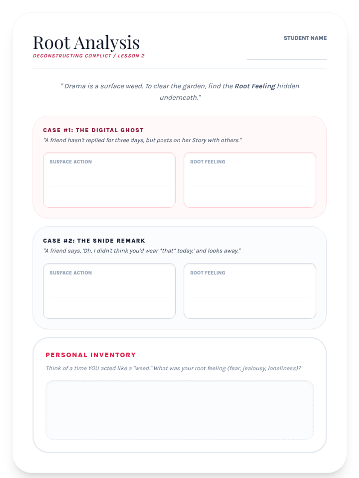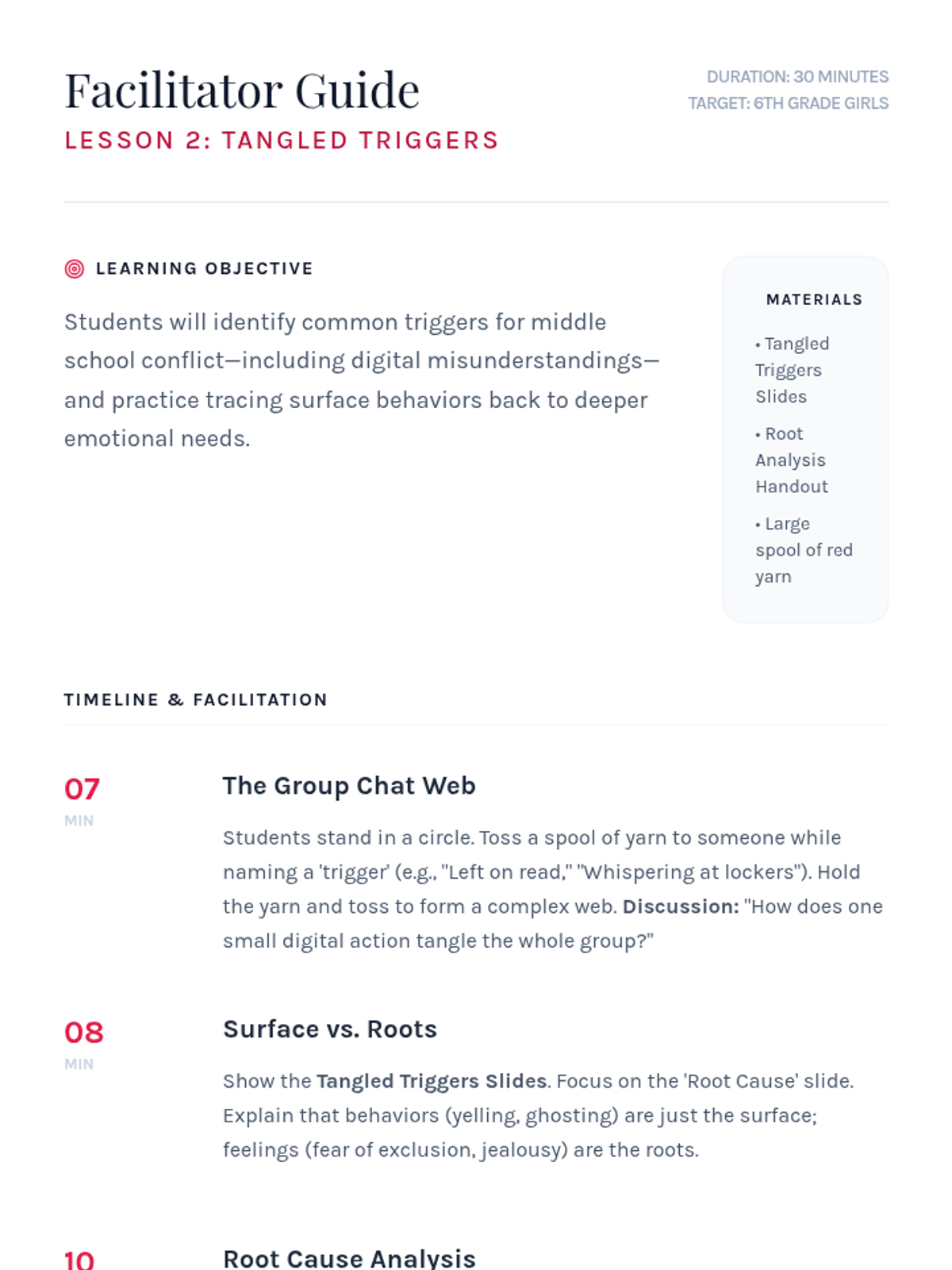 Students analyze common middle school conflict triggers, including digital drama and social hierarchy, distinguishing between surface behaviors and underlying needs.