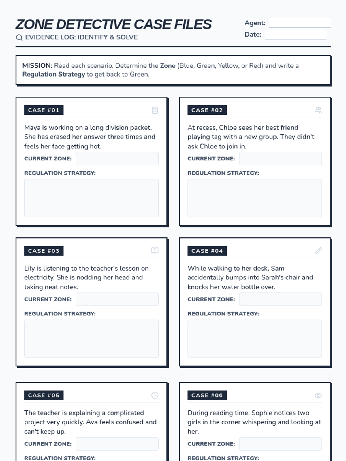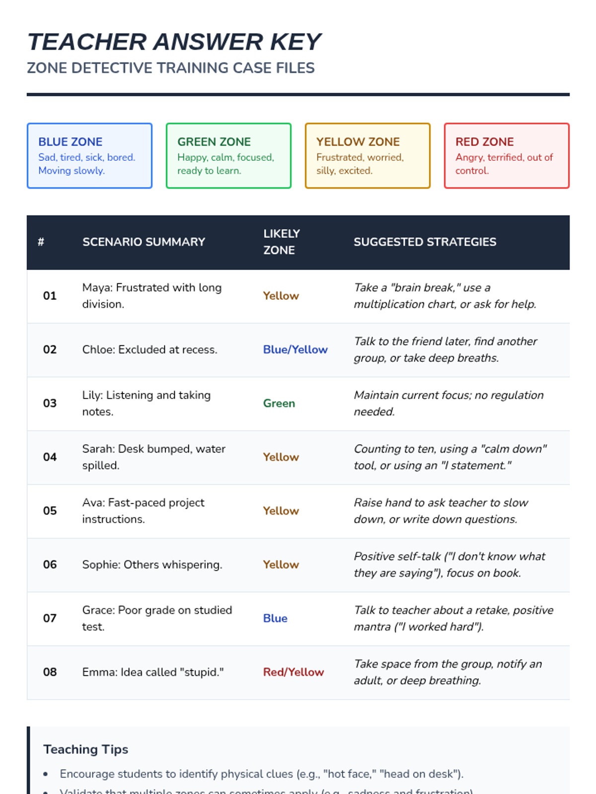 A lesson focused on identifying emotional zones and selecting appropriate self-regulation strategies for classroom and social scenarios.