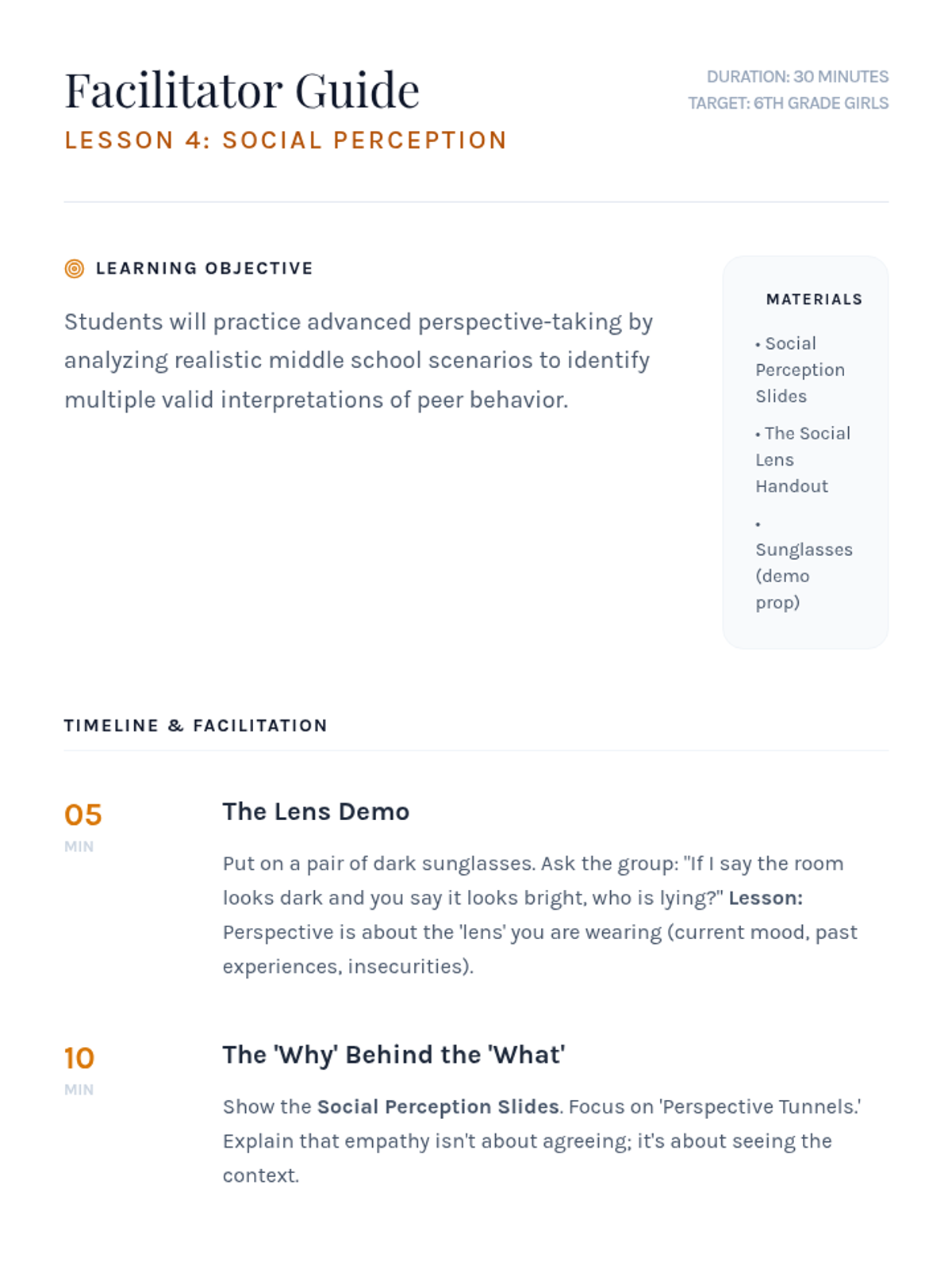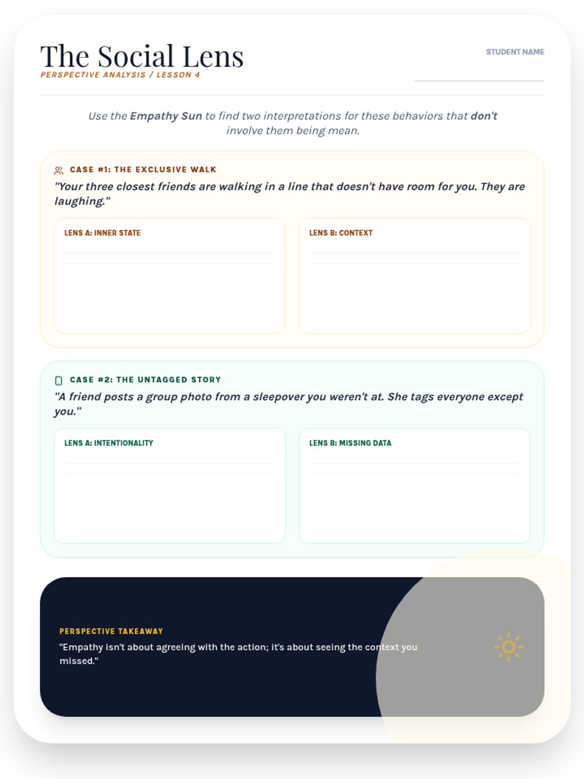 Students practice advanced perspective-taking to navigate complex social situations and understand the role of perception in peer groups.