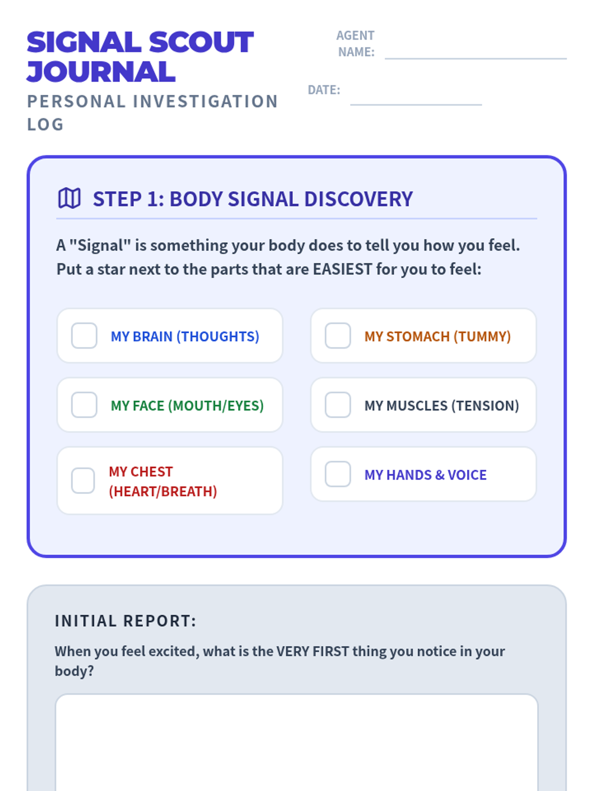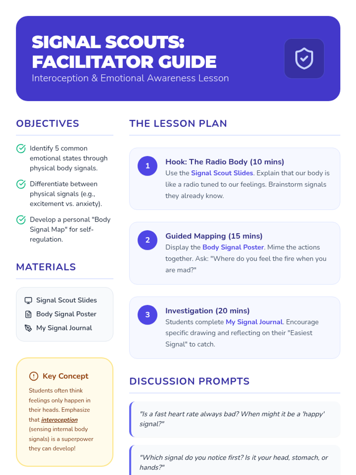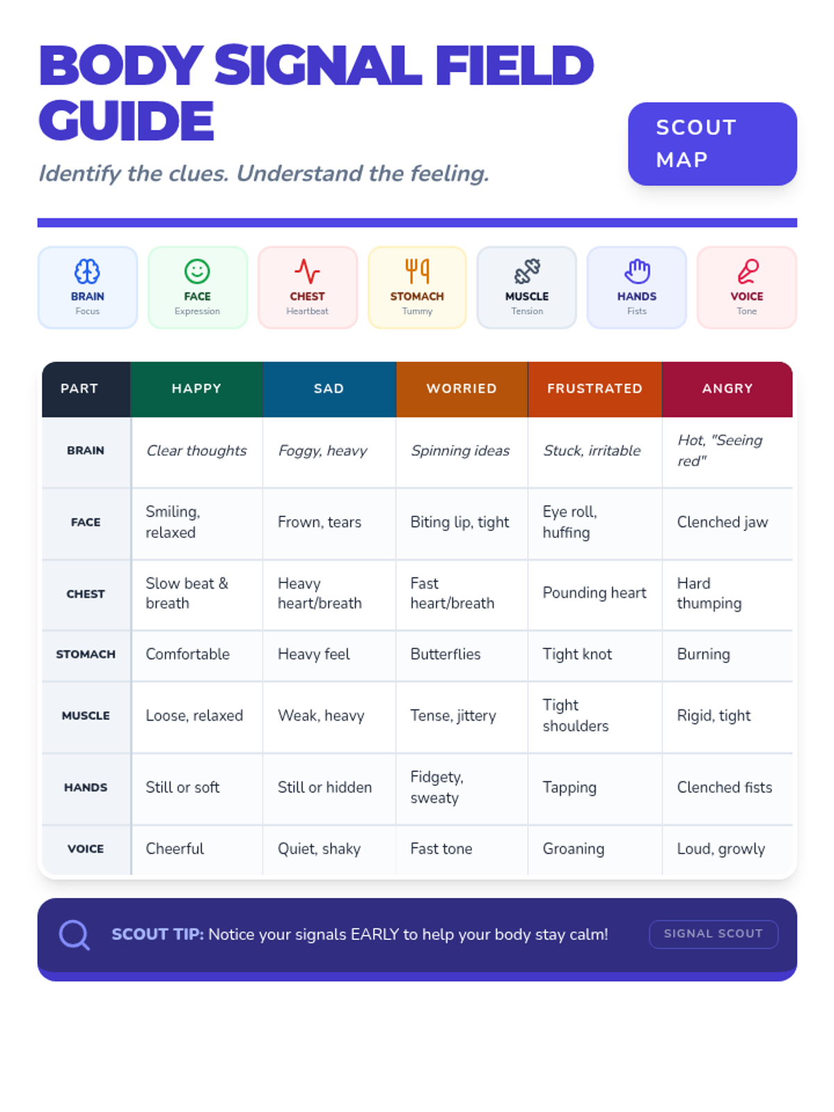 A lesson designed to help students identify and understand the physical signals their bodies send during different emotional states, using a 'Signal Scouts' theme to encourage self-awareness and emotional regulation.