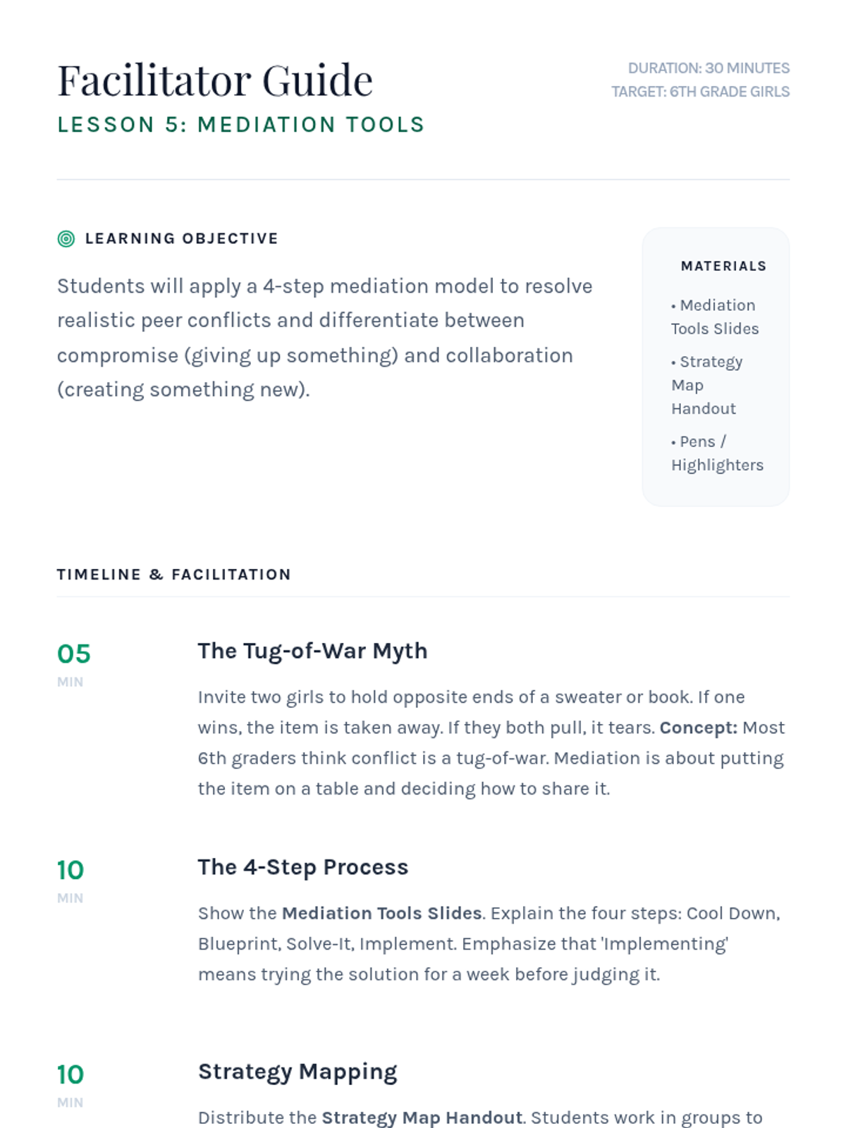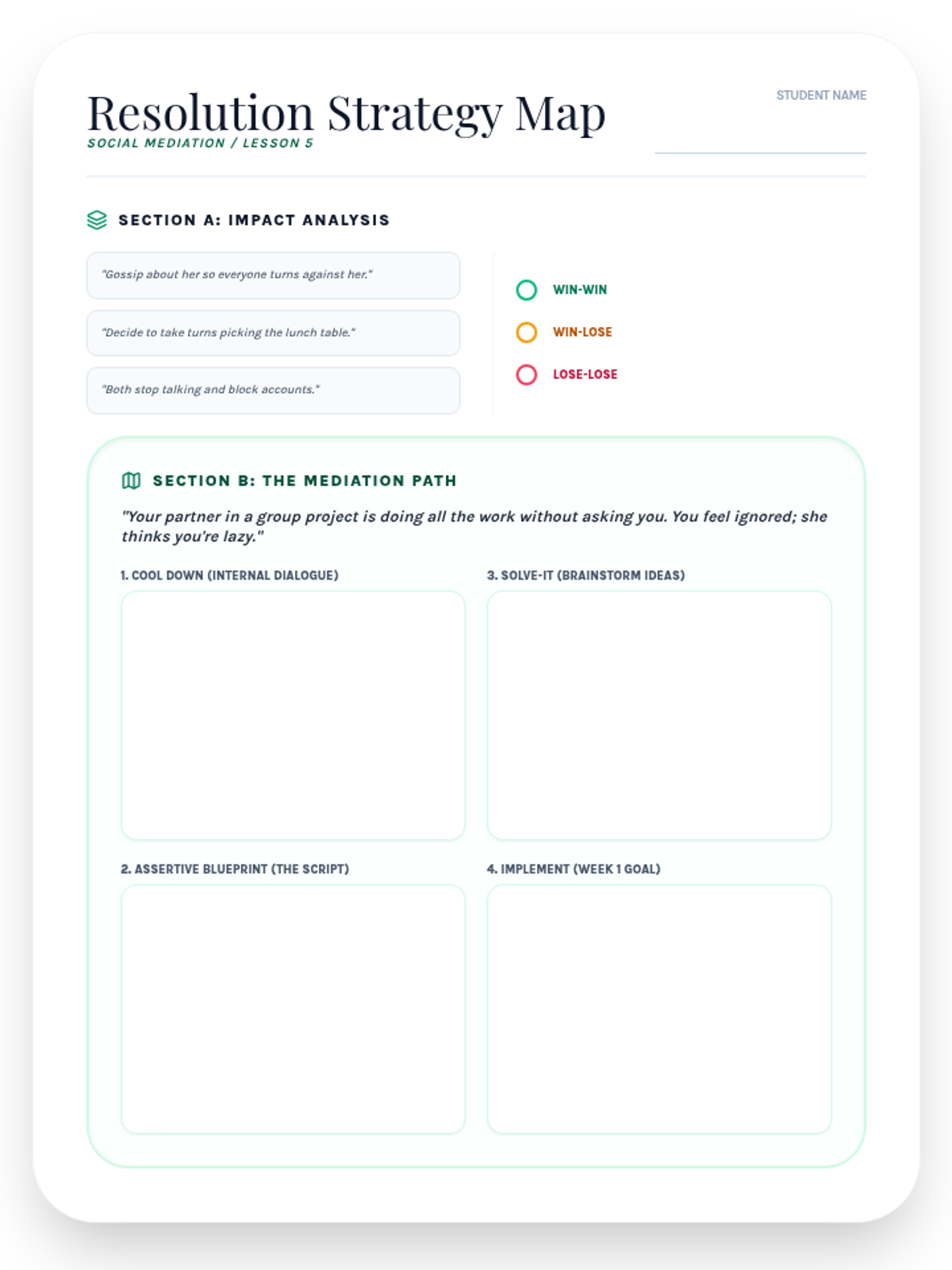 Students apply a conflict mediation model to realistic middle school scenarios, focusing on sustainable compromise and healthy boundaries.