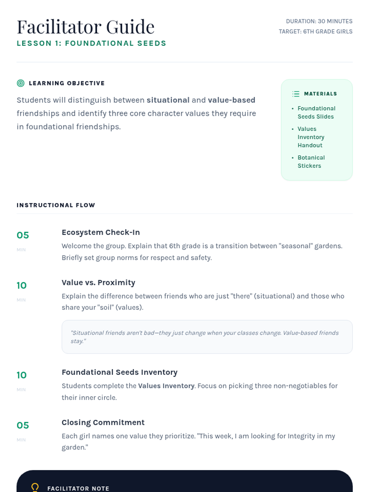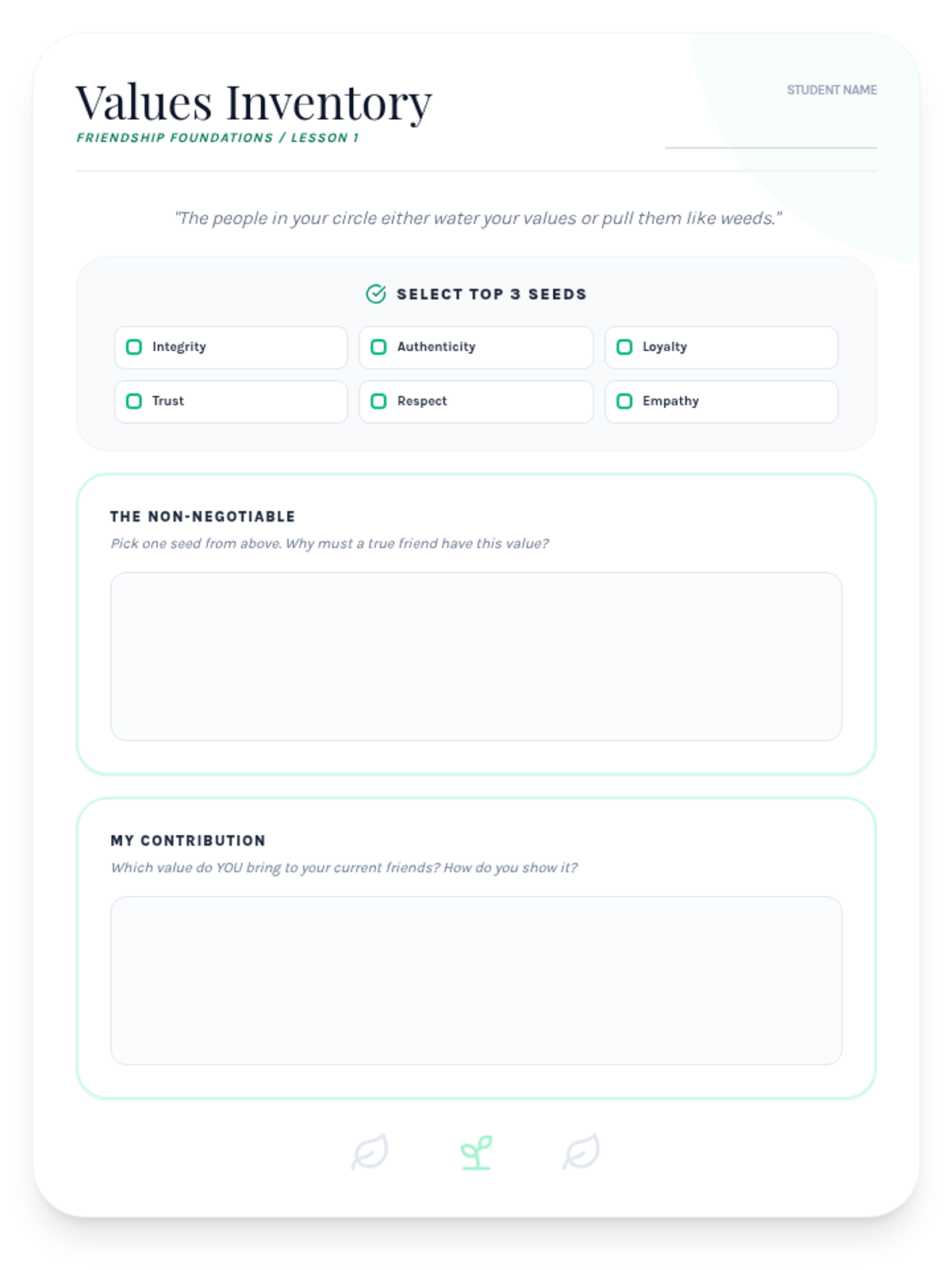 Students identify the core values that ground healthy friendships and analyze the difference between 'situational friends' and 'value-based friends.'