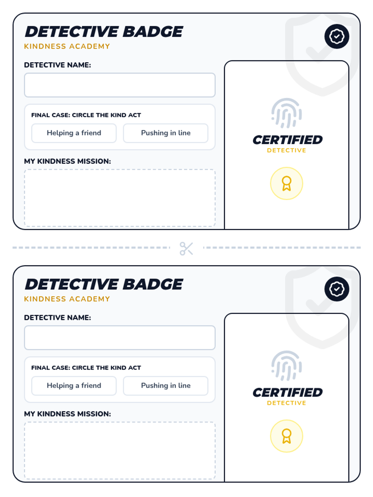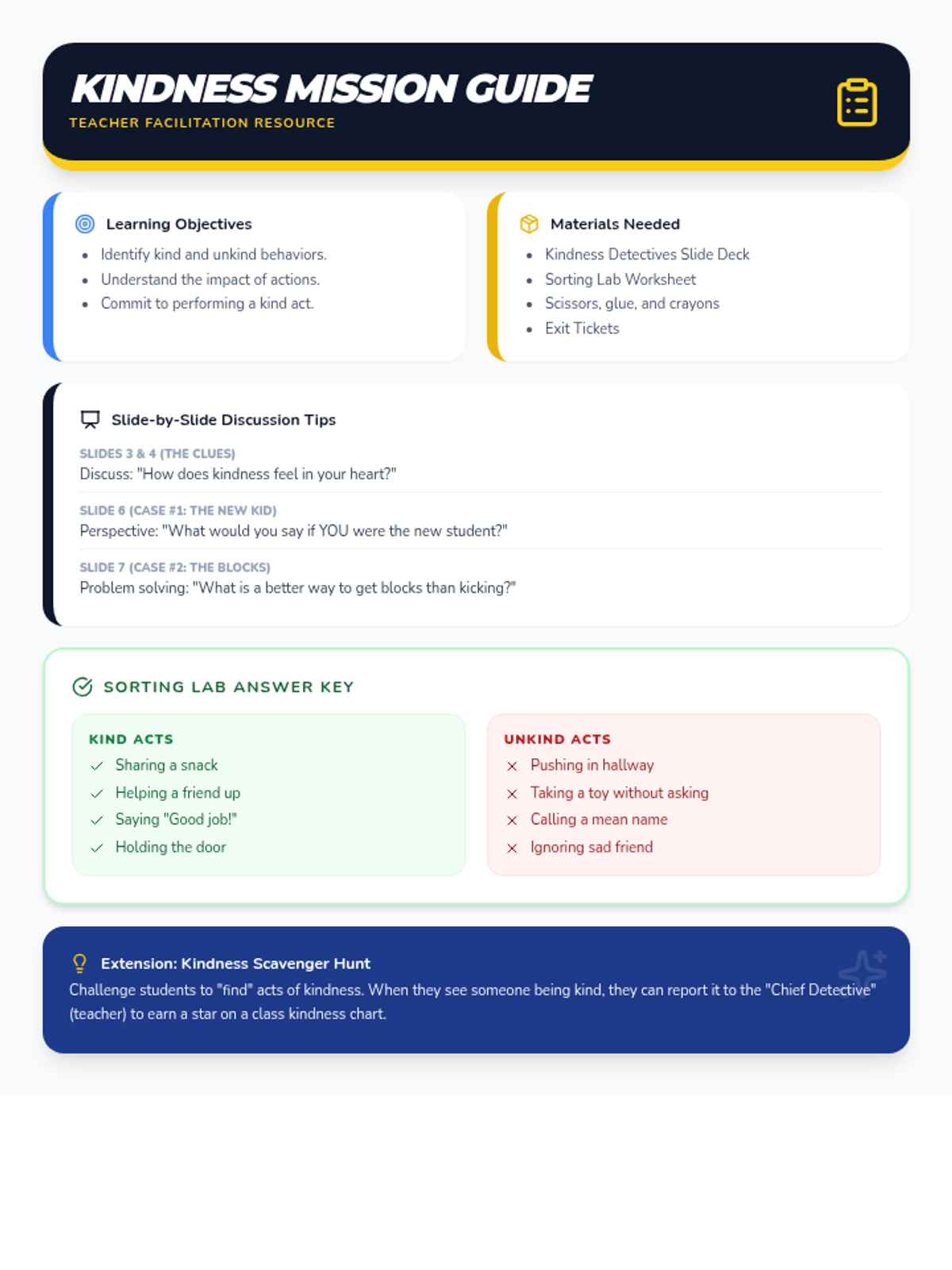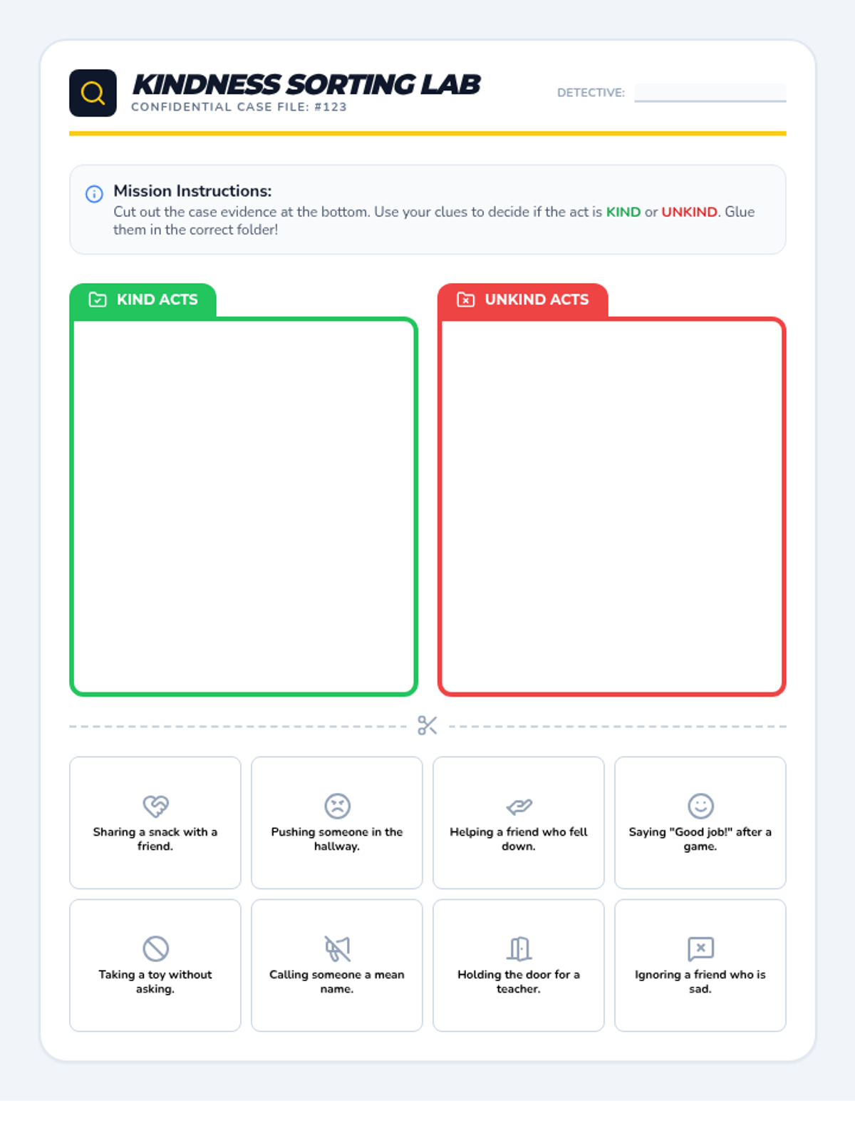 A detective-themed lesson for K-2 students focused on identifying and distinguishing between kind and unkind behaviors through interactive games and a hands-on sorting activity.