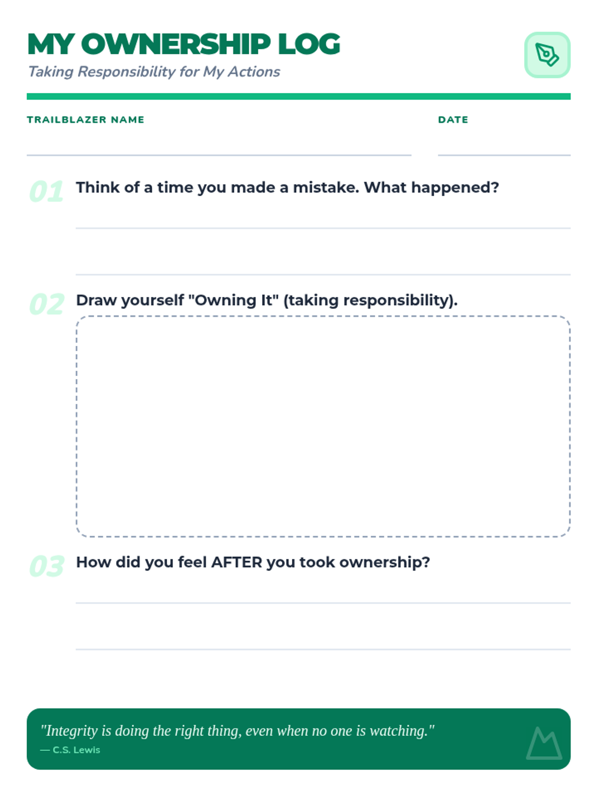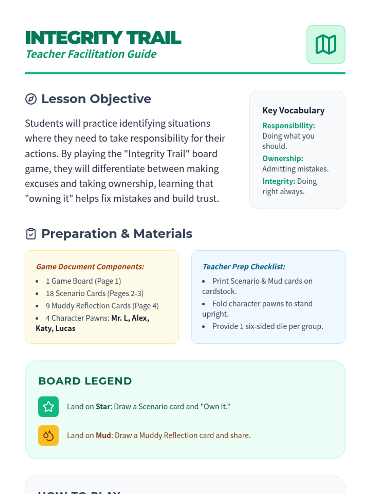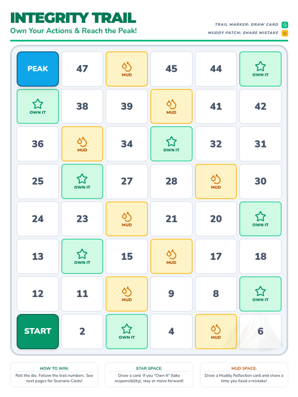 A character-building lesson centered around a board game where students navigate real-life scenarios to practice taking ownership of their actions and choices.