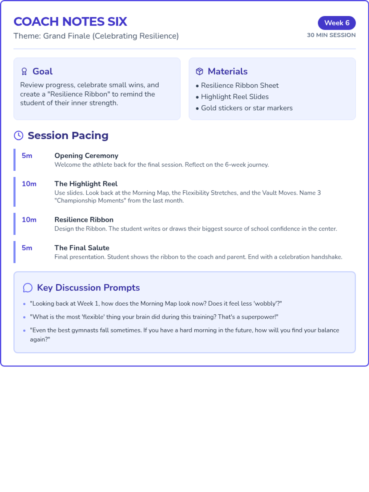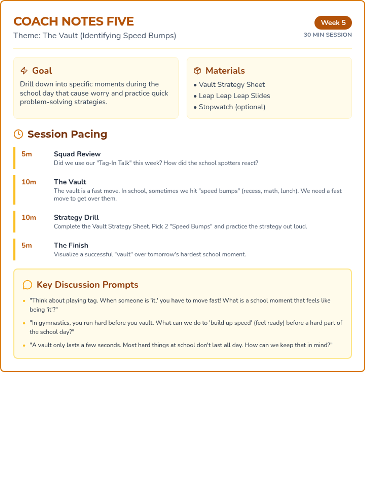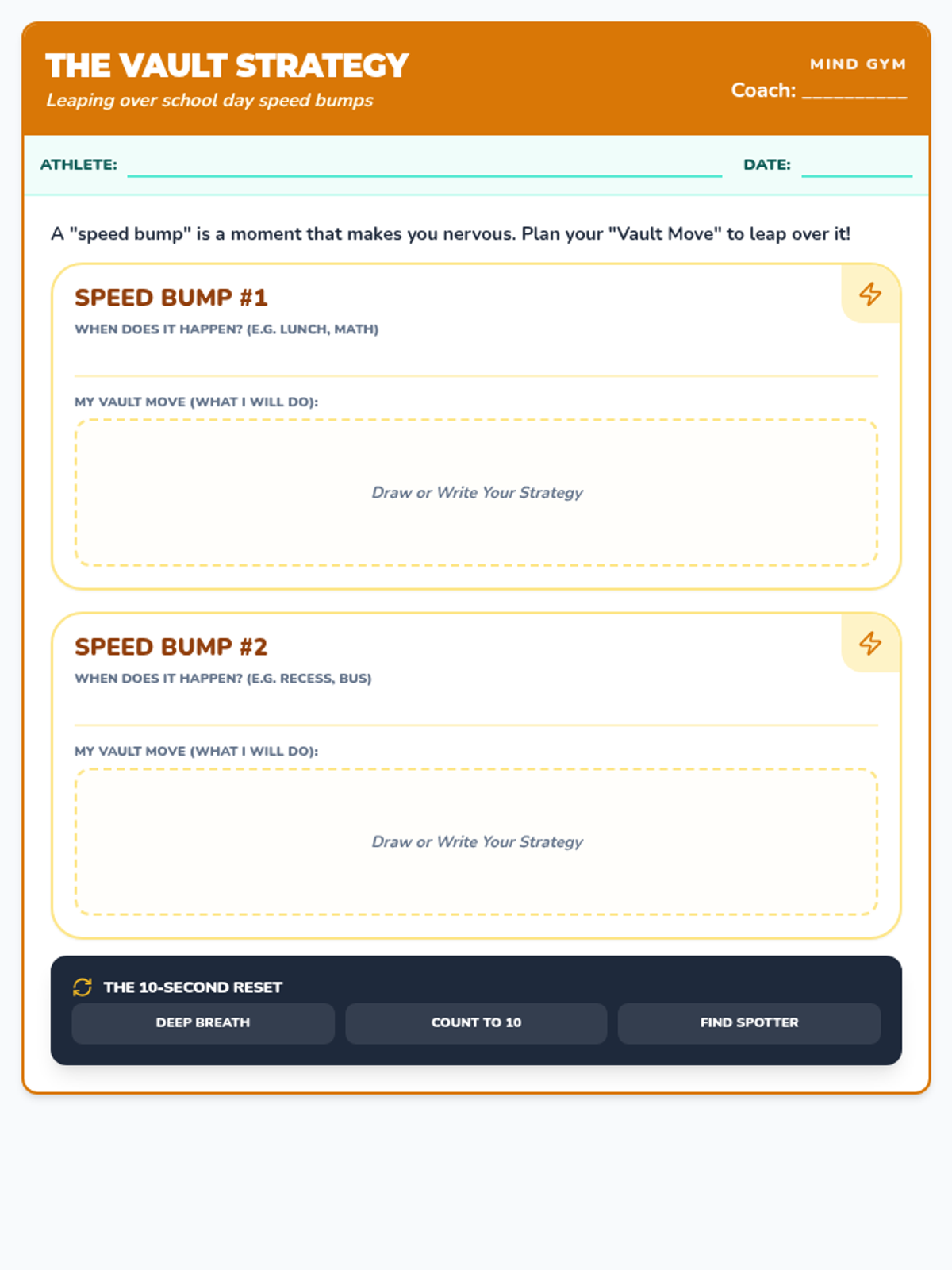 Focuses on specific school-day challenges that might be causing morning anxiety. Using 'the vault' metaphor, the student learns to identify 'speed bumps' and practices 'vaulting' over them with quick strategies.