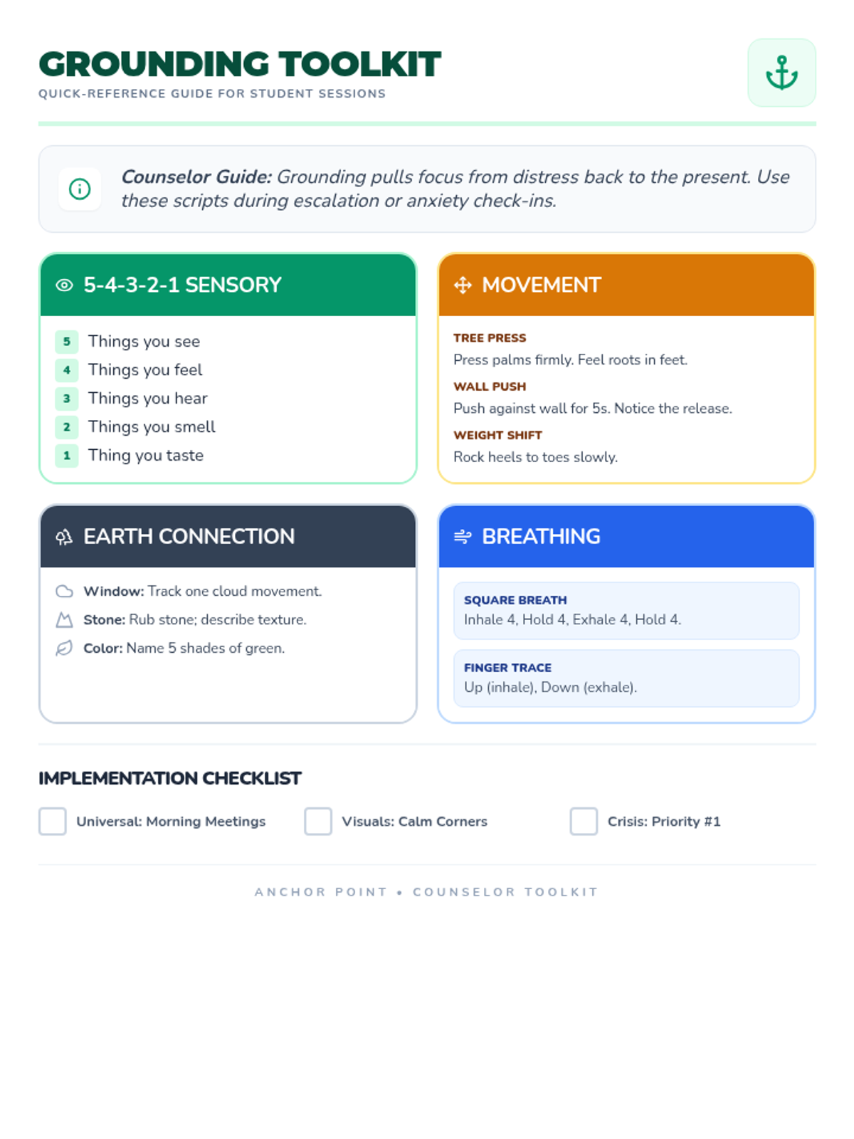 A comprehensive training session for school counselors on teaching effective grounding techniques to students, focusing on sensory, movement, nature-based, and breathing strategies.
