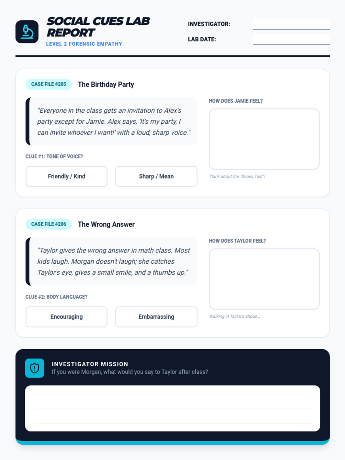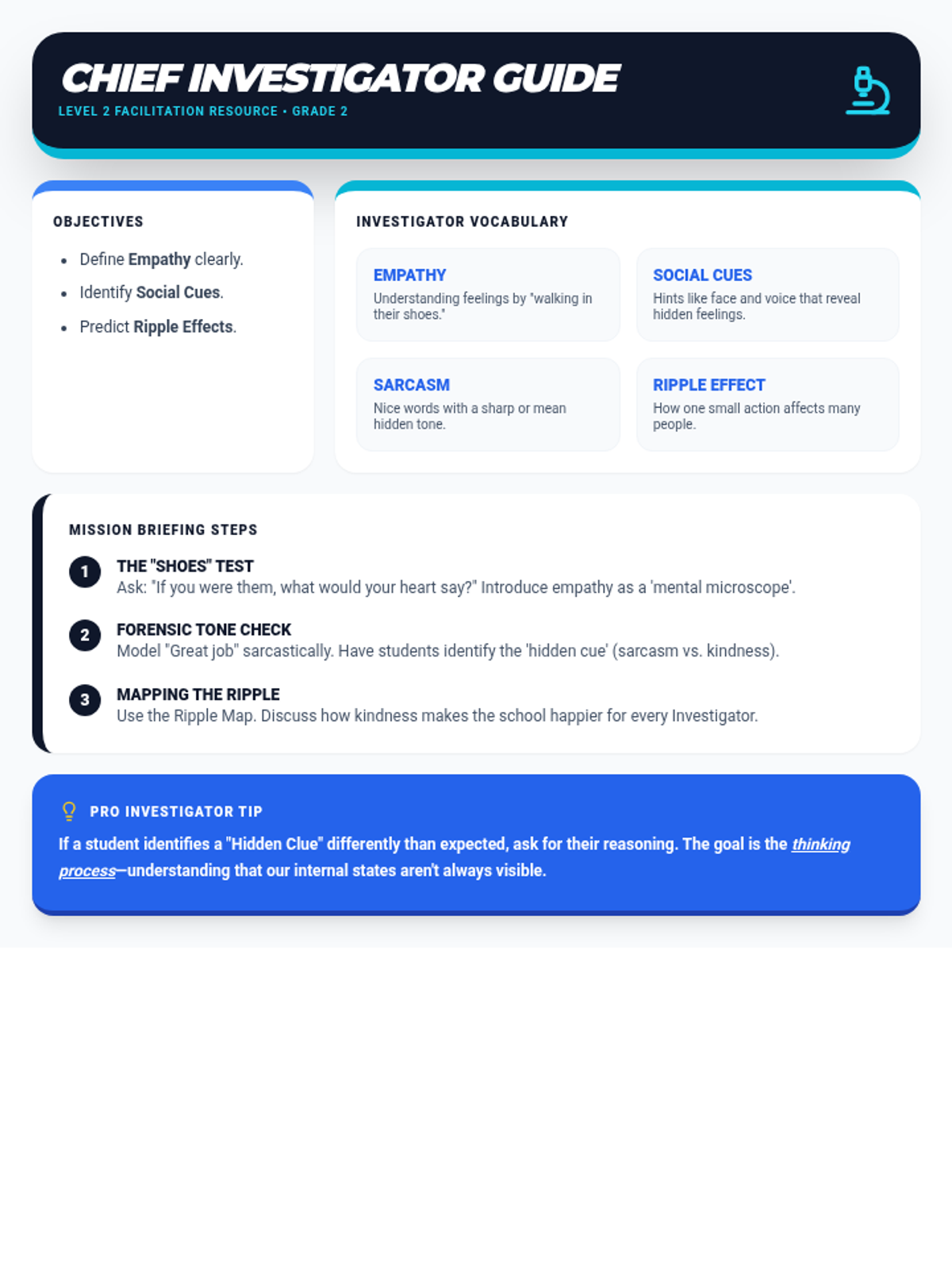 A forensic-themed lesson for 2nd grade students that delves deeper into social cues, empathy, and the "ripple effect" of kind and unkind actions.