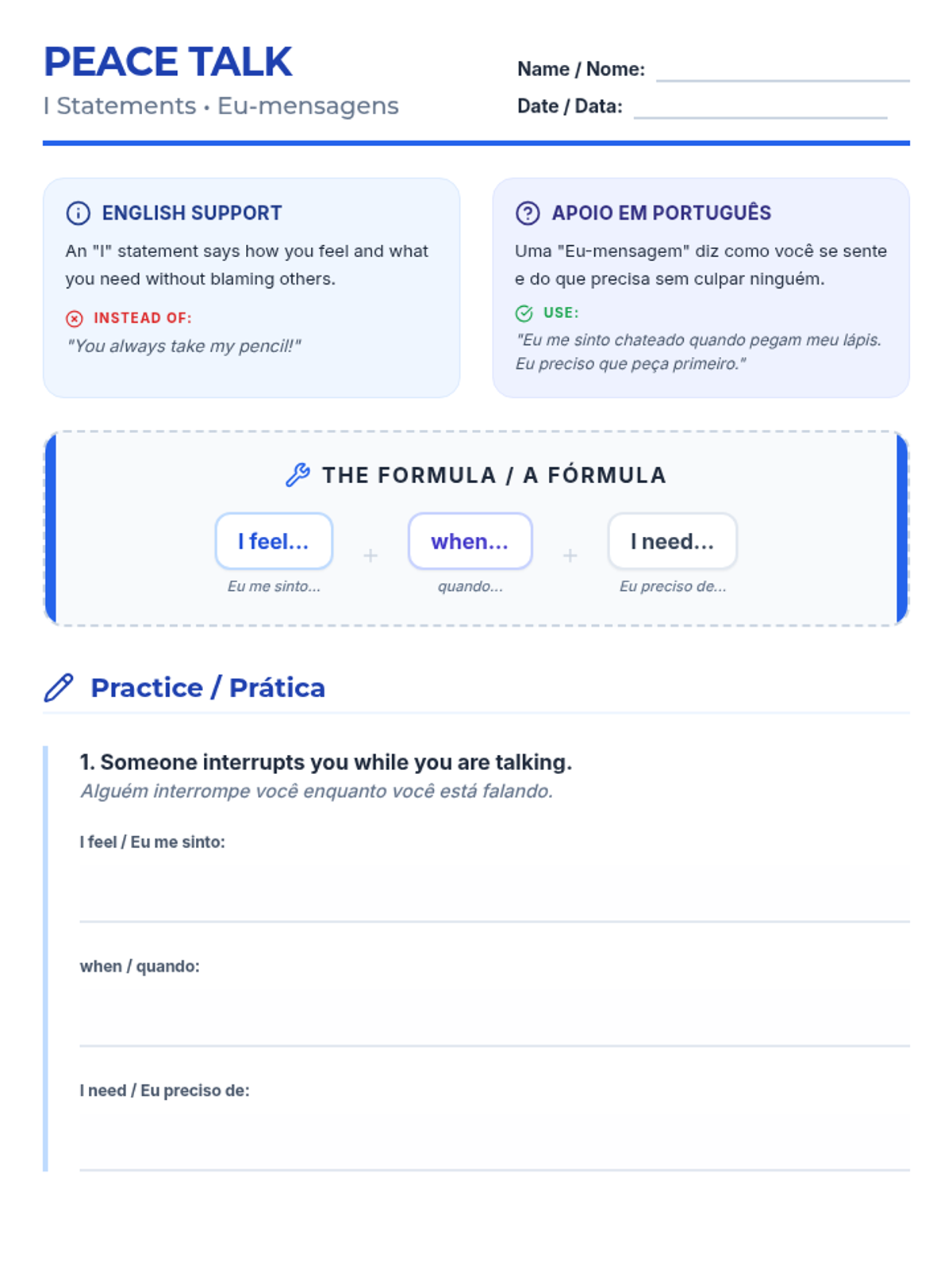 A lesson designed to help newcomer Portuguese students and native English speakers master the art of assertive communication using 'I' statements in classroom settings.