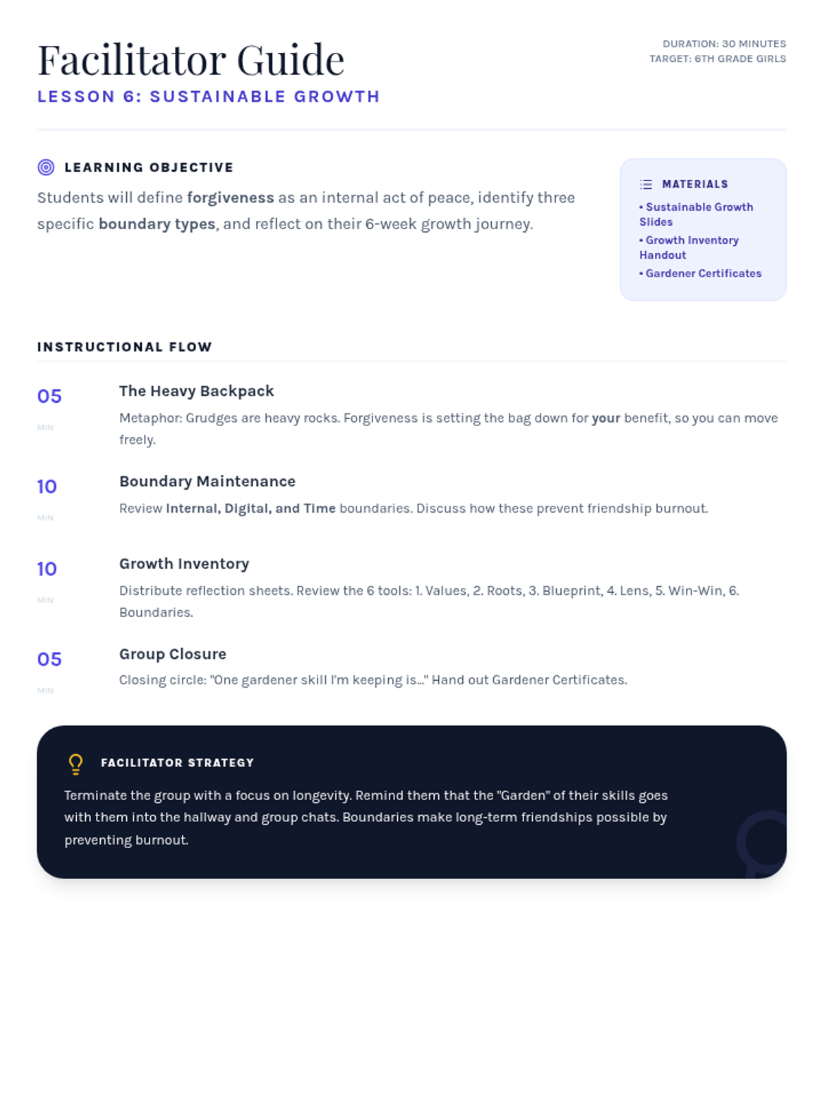 The final session focuses on maintaining healthy social boundaries, the role of forgiveness in growth, and group closure.