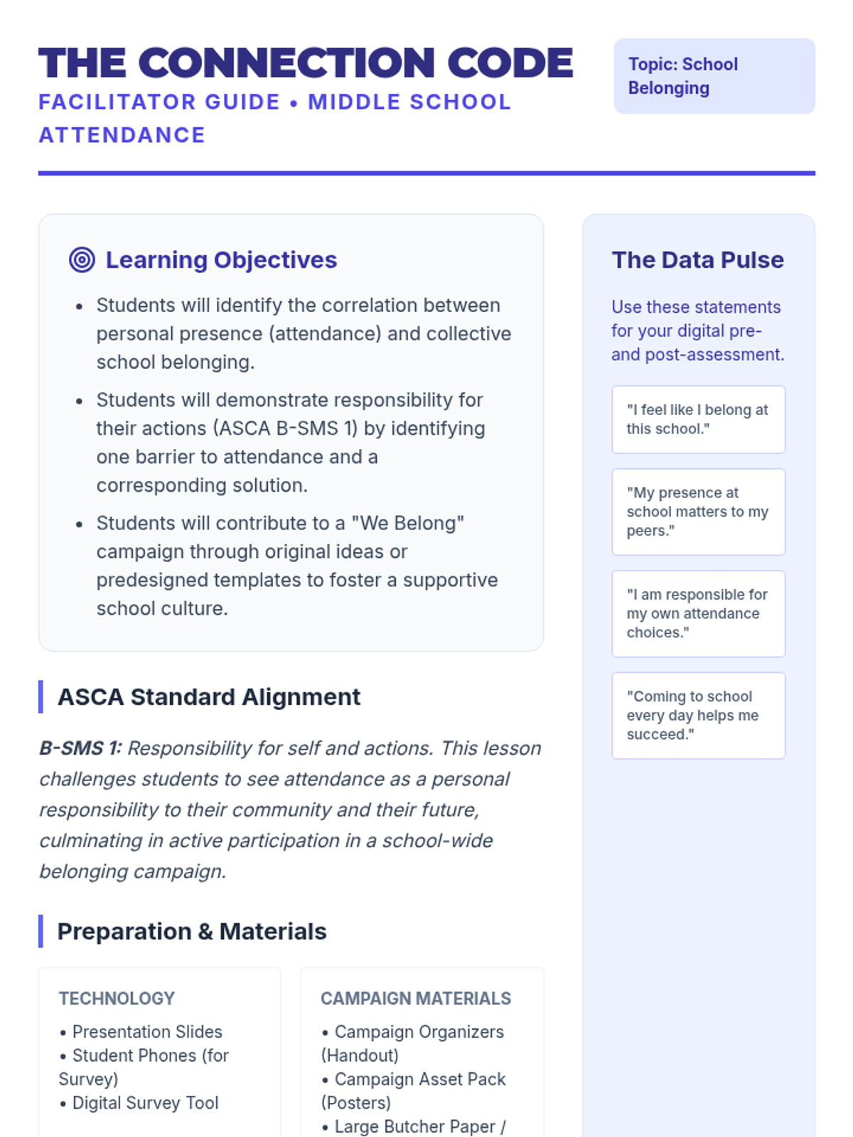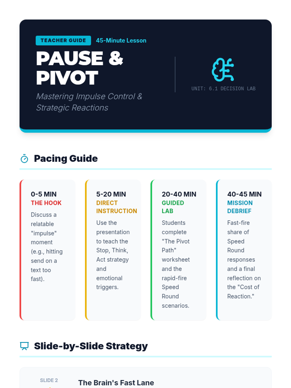 A 45-minute social-emotional learning lesson for 6th graders on impulse control and decision-making using the 'Stop, Think, Act' strategy. Students explore the connection between emotions and quick reactions through a visual presentation and a dual-path decision-making worksheet.