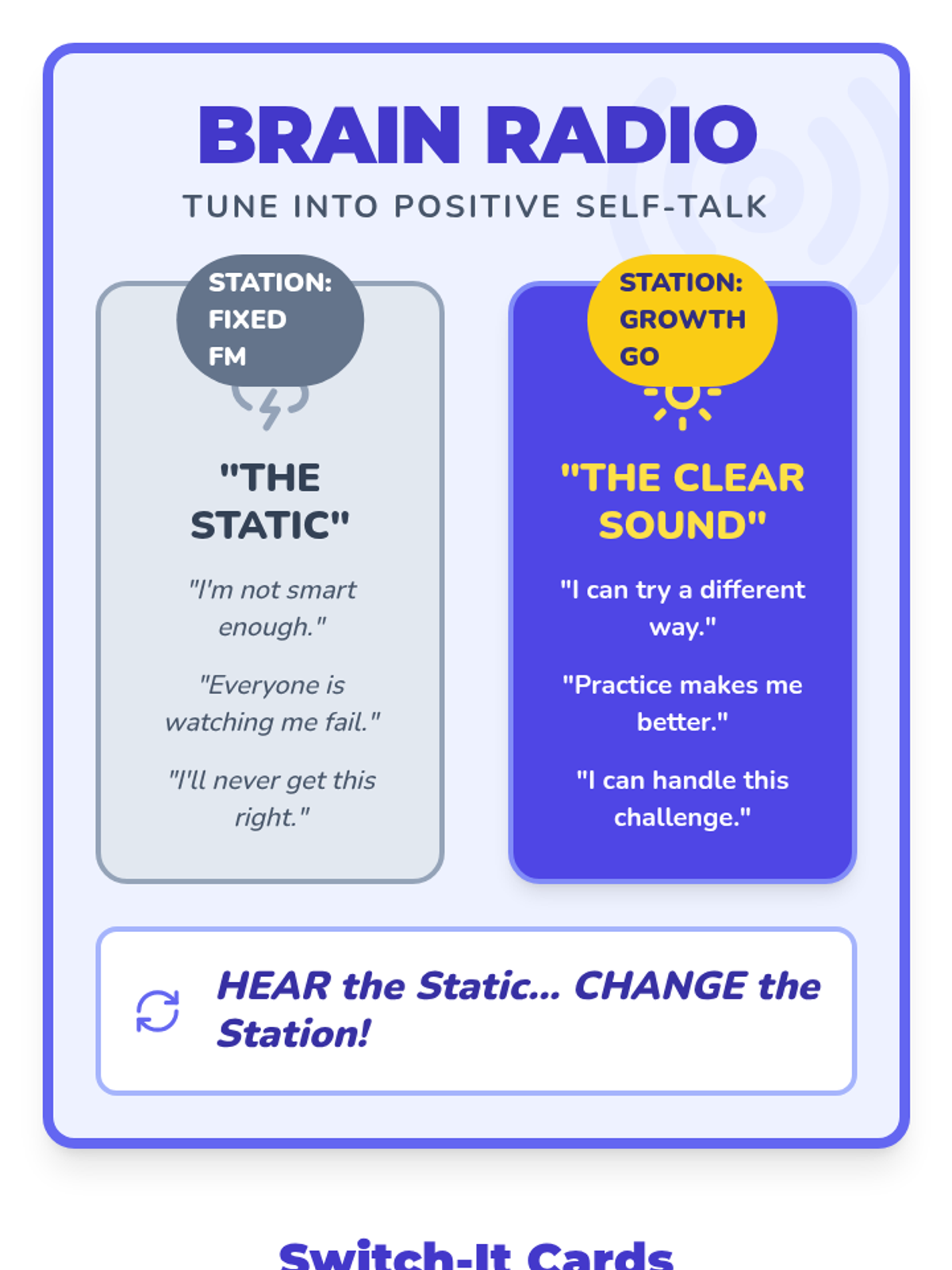 Teaches students to identify 'Fixed' vs. 'Growth' thoughts using a radio metaphor to 'tune in' to positive self-talk.