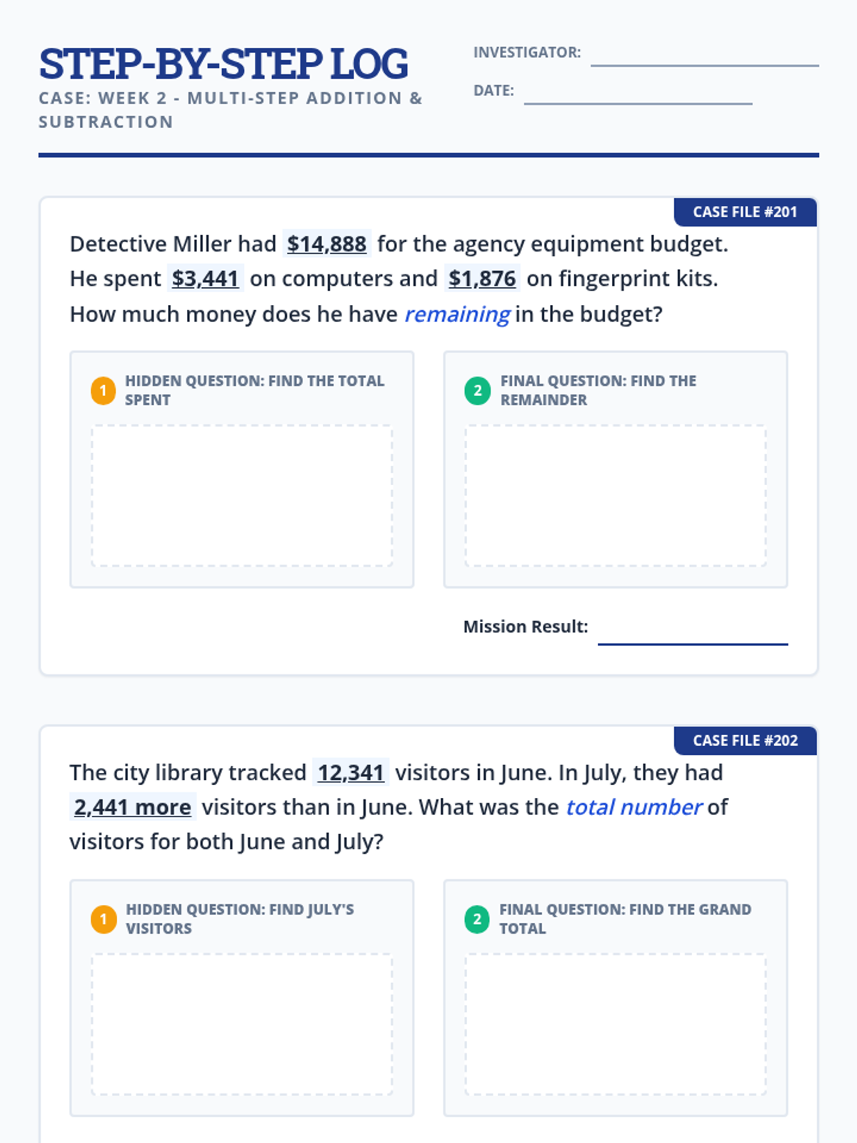 Focus on multi-step addition and subtraction problems involving money, distance, and population.