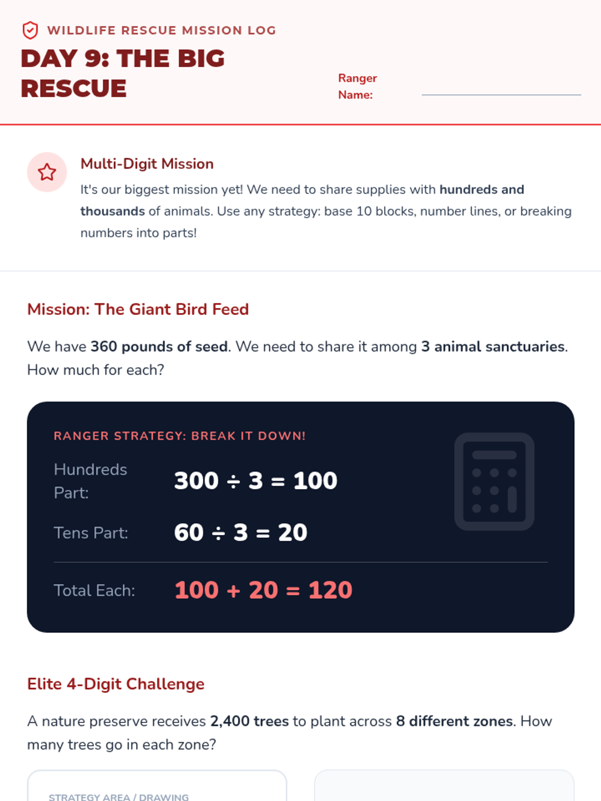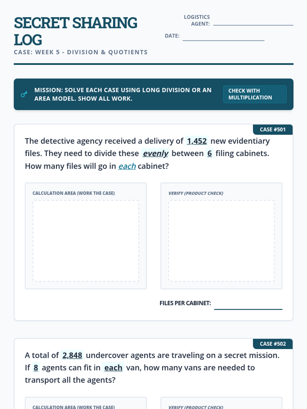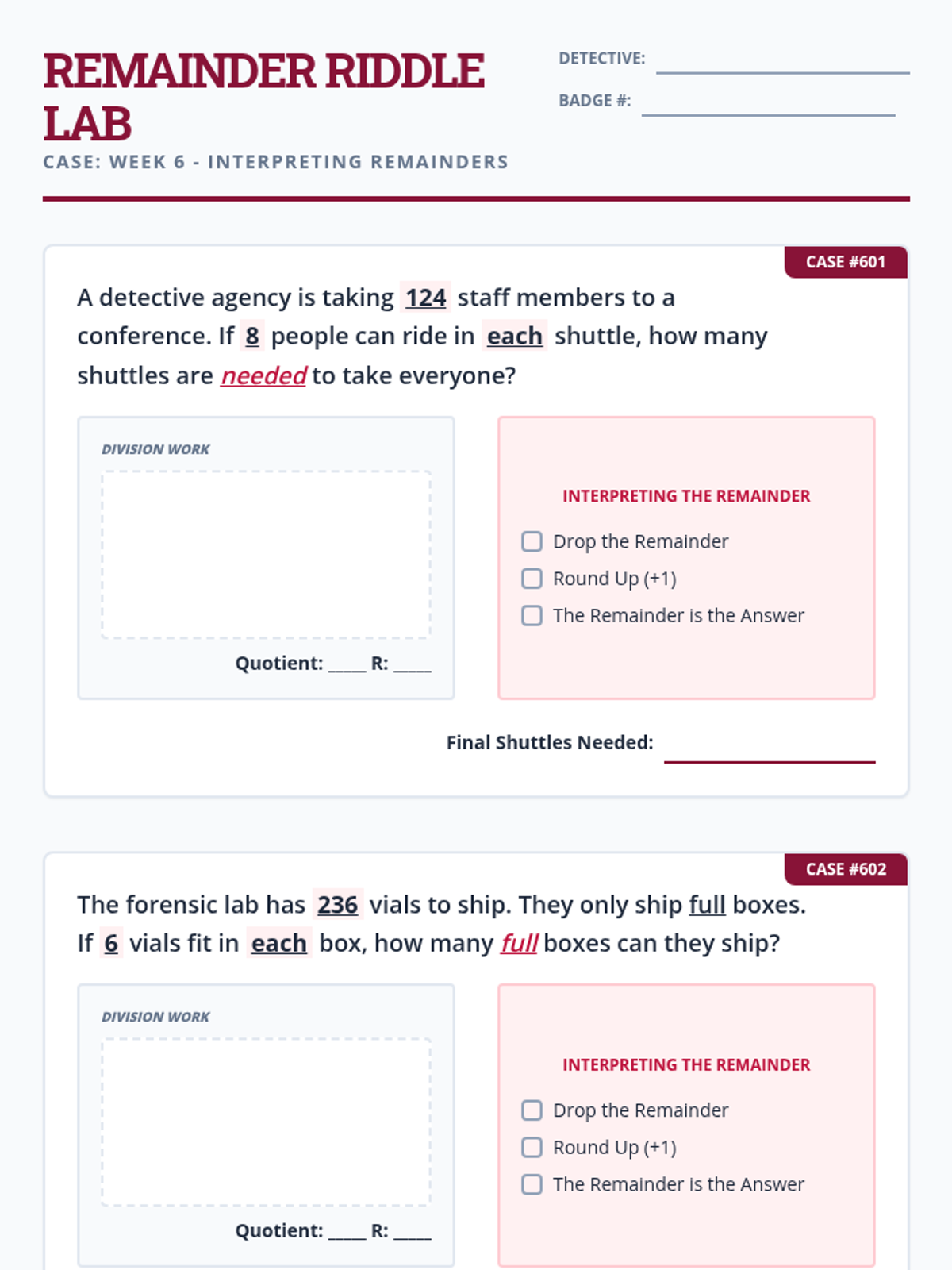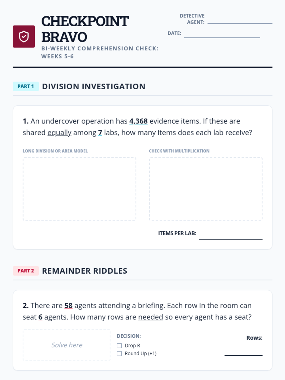 Interpreting remainders in context (Round up, discard, or fraction). Includes Bi-Weekly Check 2.