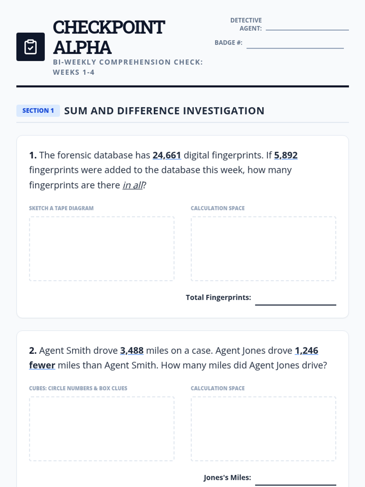 Introduction to word problem strategies (CUBES, Tape Diagrams) using multi-digit addition and subtraction.