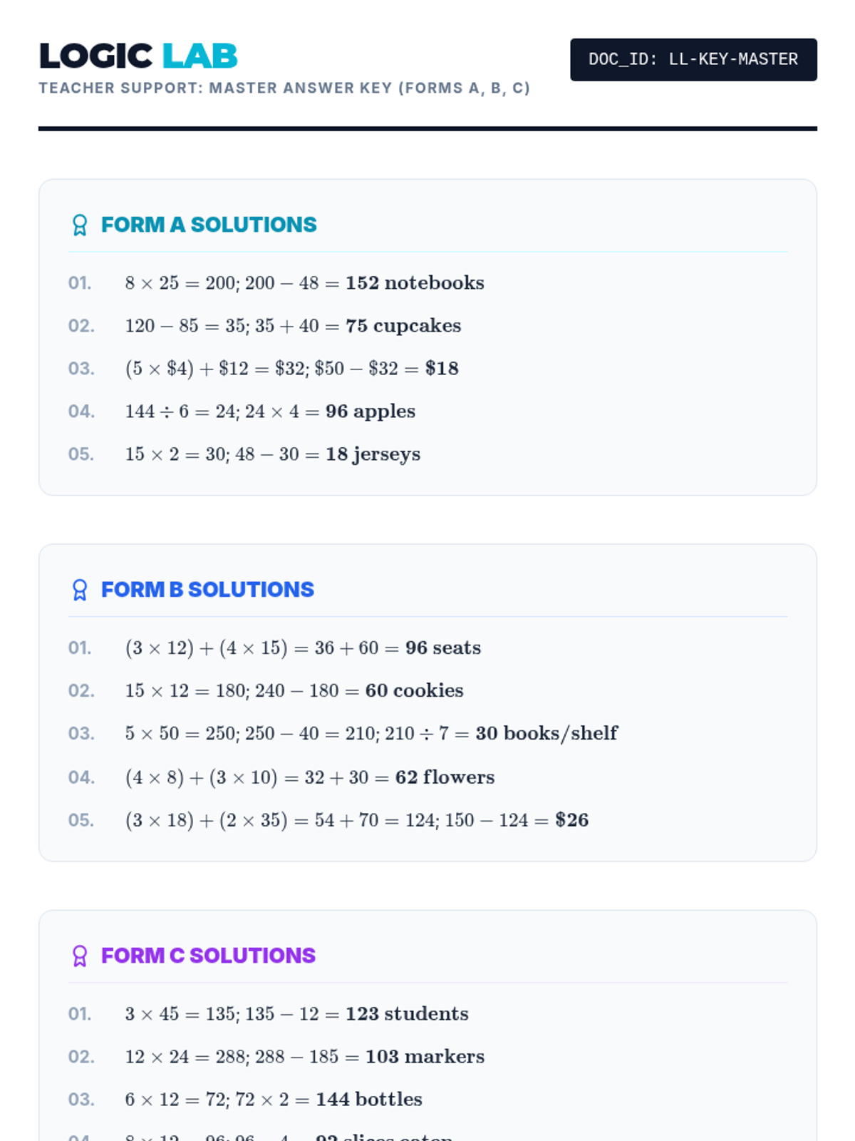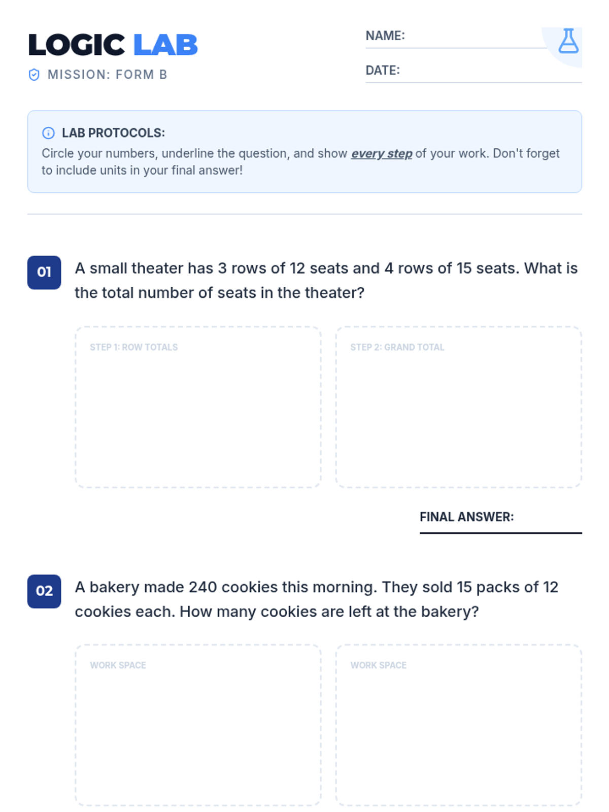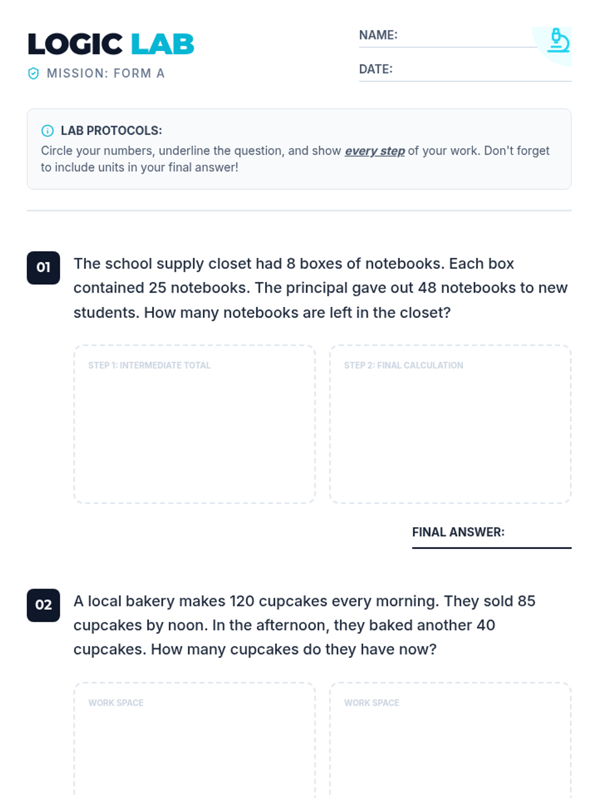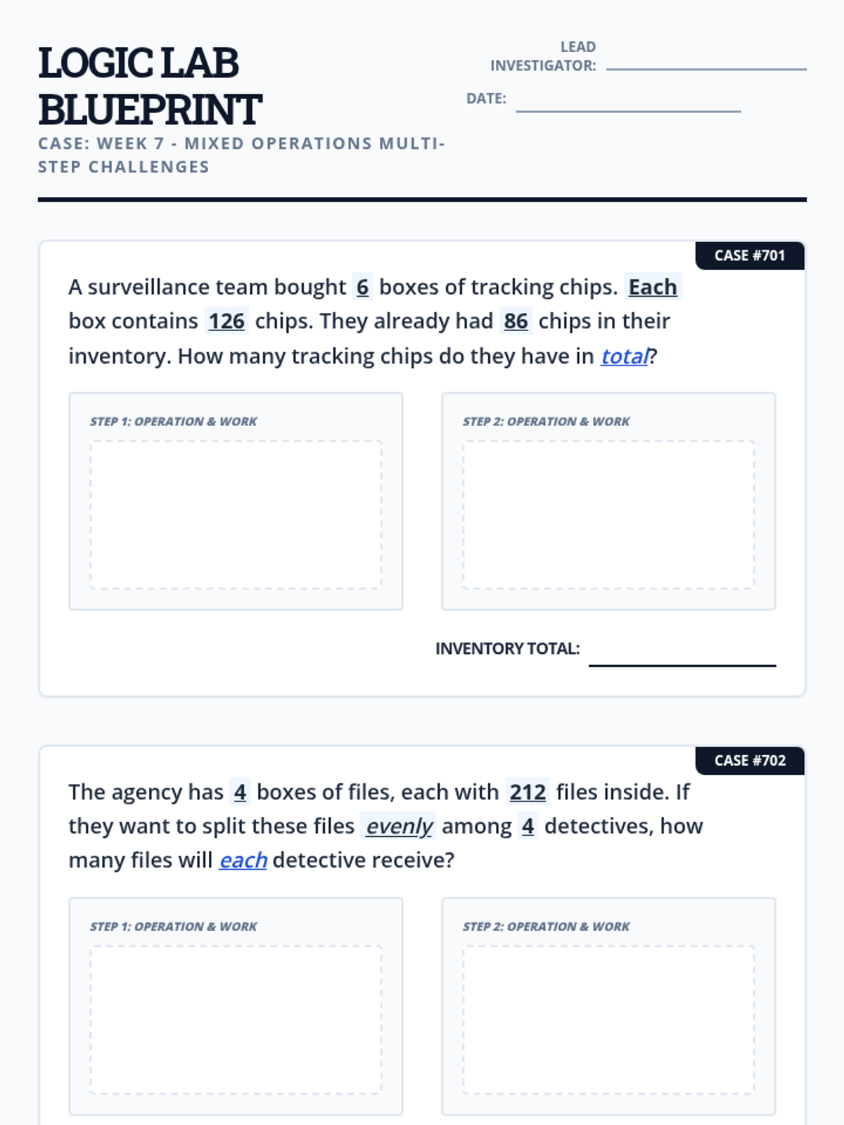Mixed operations multi-step word problems involving all four operations.