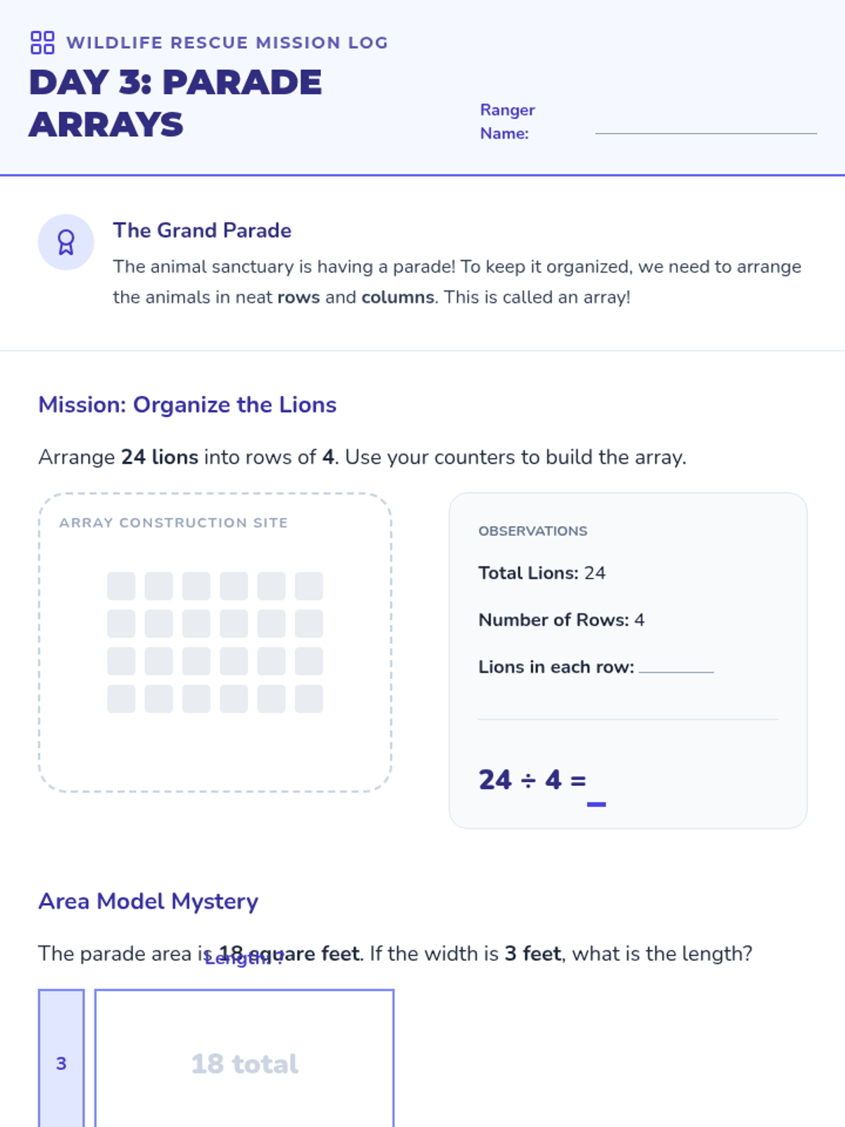 Students use counters and area models to visualize division as rows and columns in an animal parade.