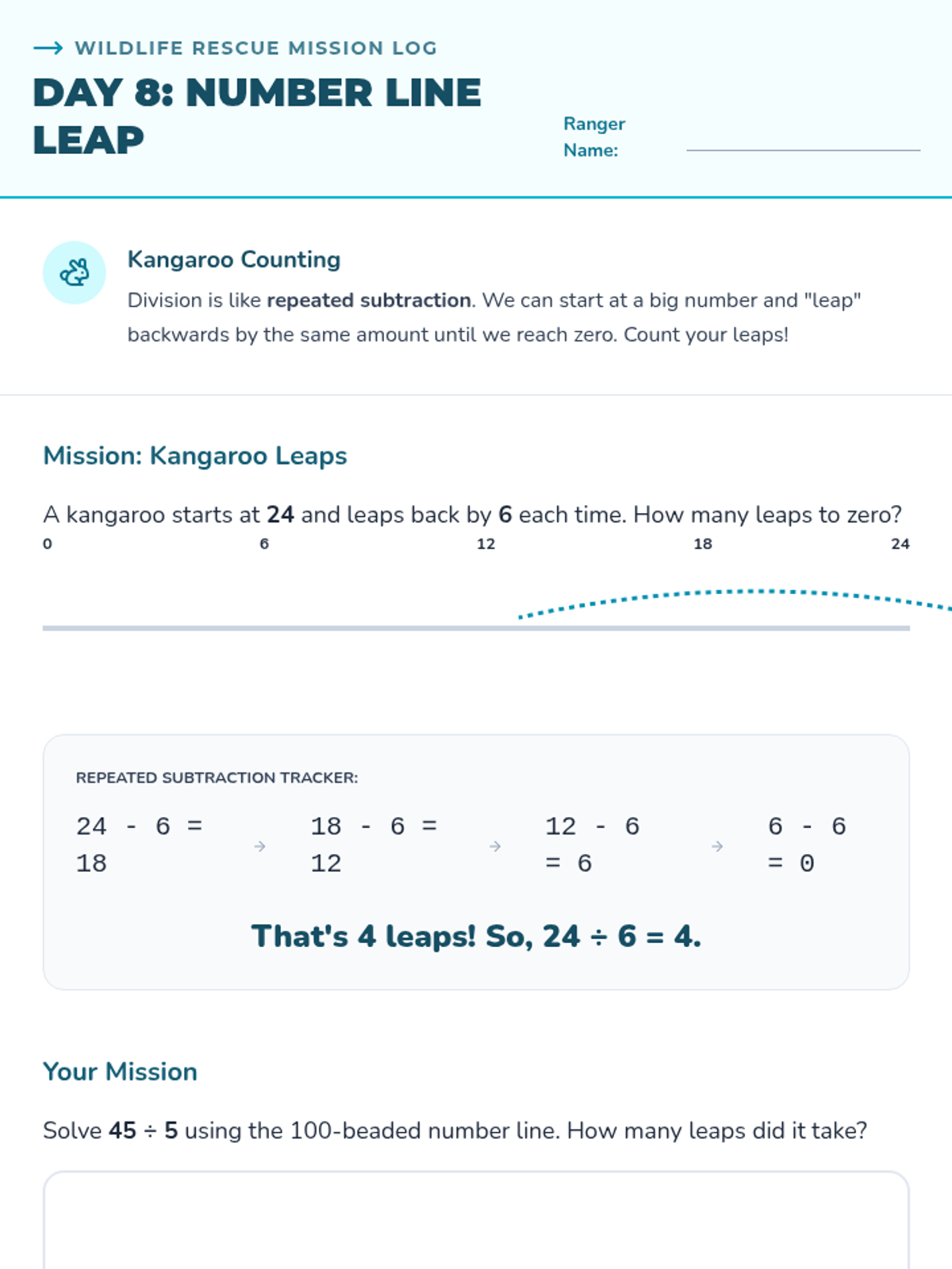 Using the 100-beaded number line to visualize division as repeated subtraction and leaps.
