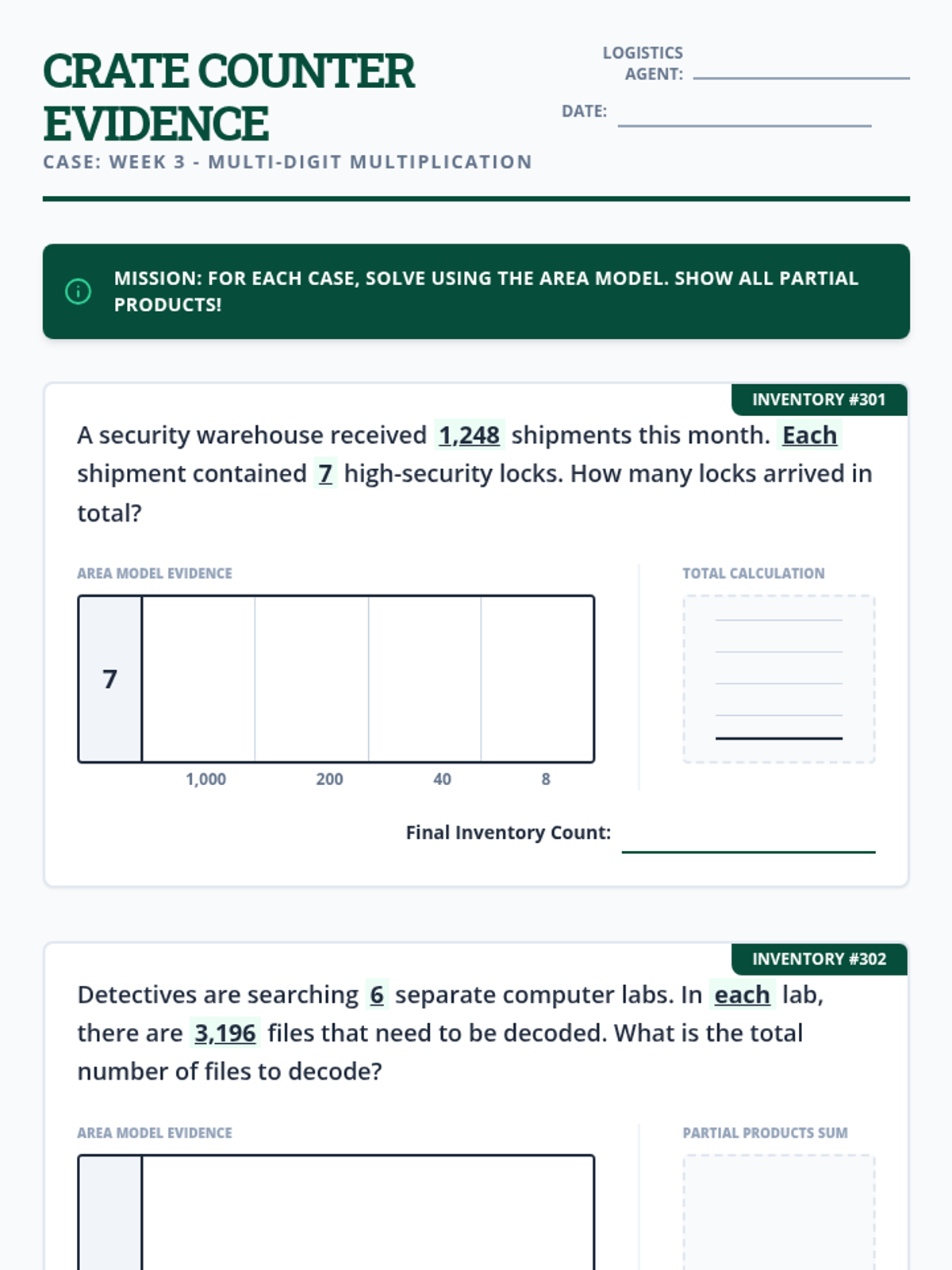Multiplication word problems involving multi-digit numbers (4-digit by 1-digit) and area models.