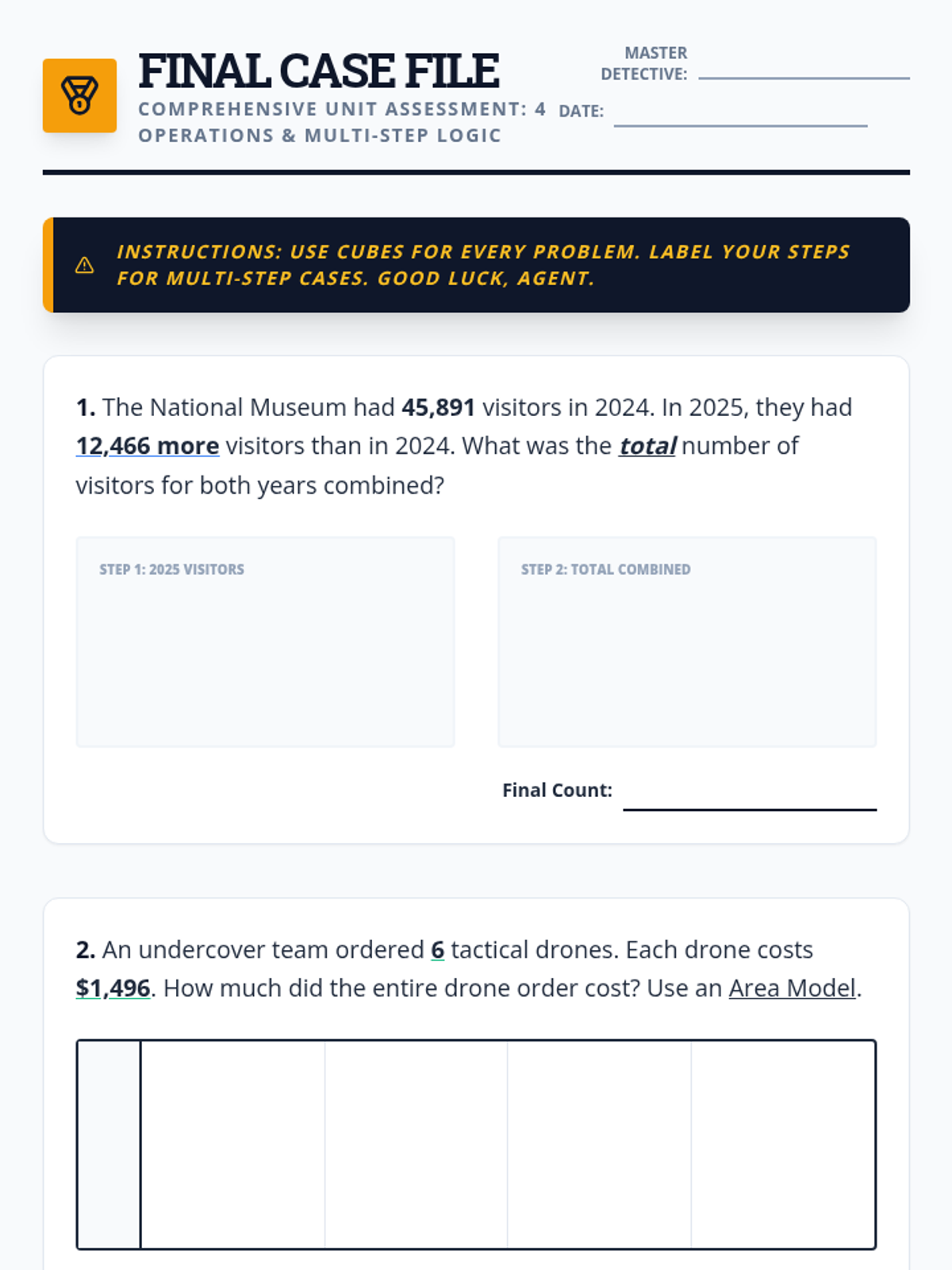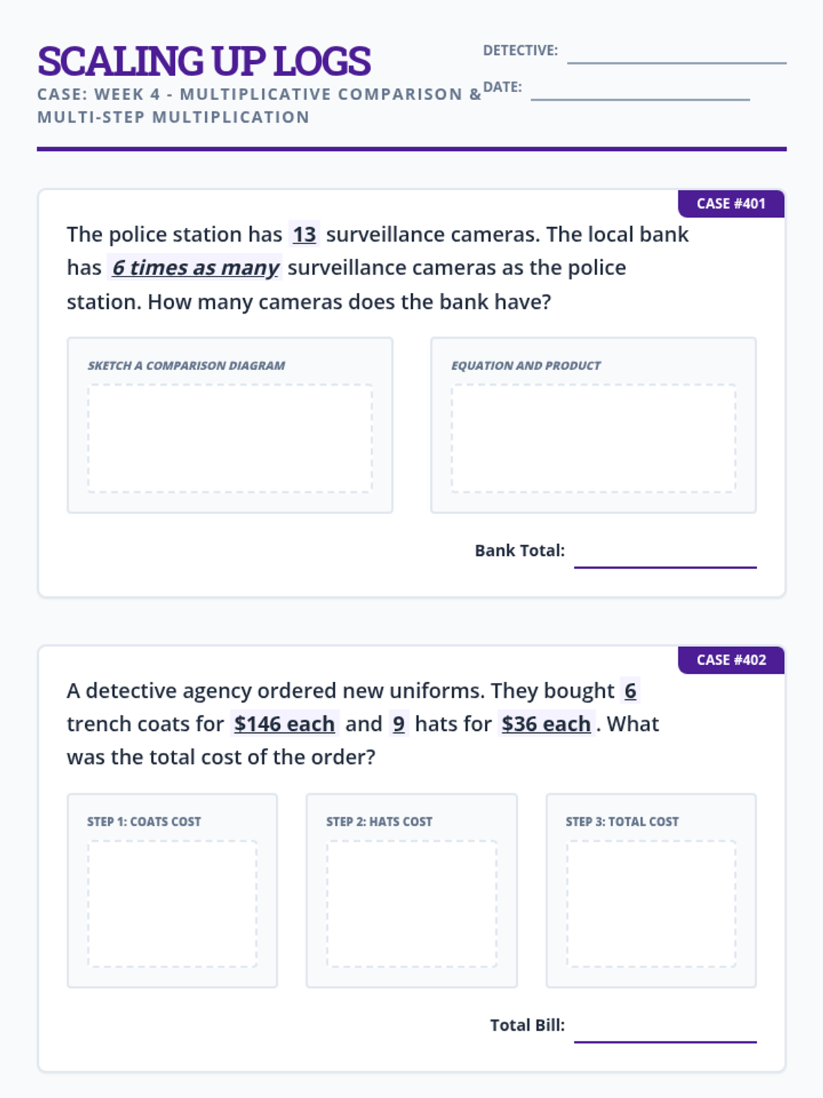 Understanding multiplicative comparison and multi-step multiplication problems. Includes Bi-Weekly Check 1.