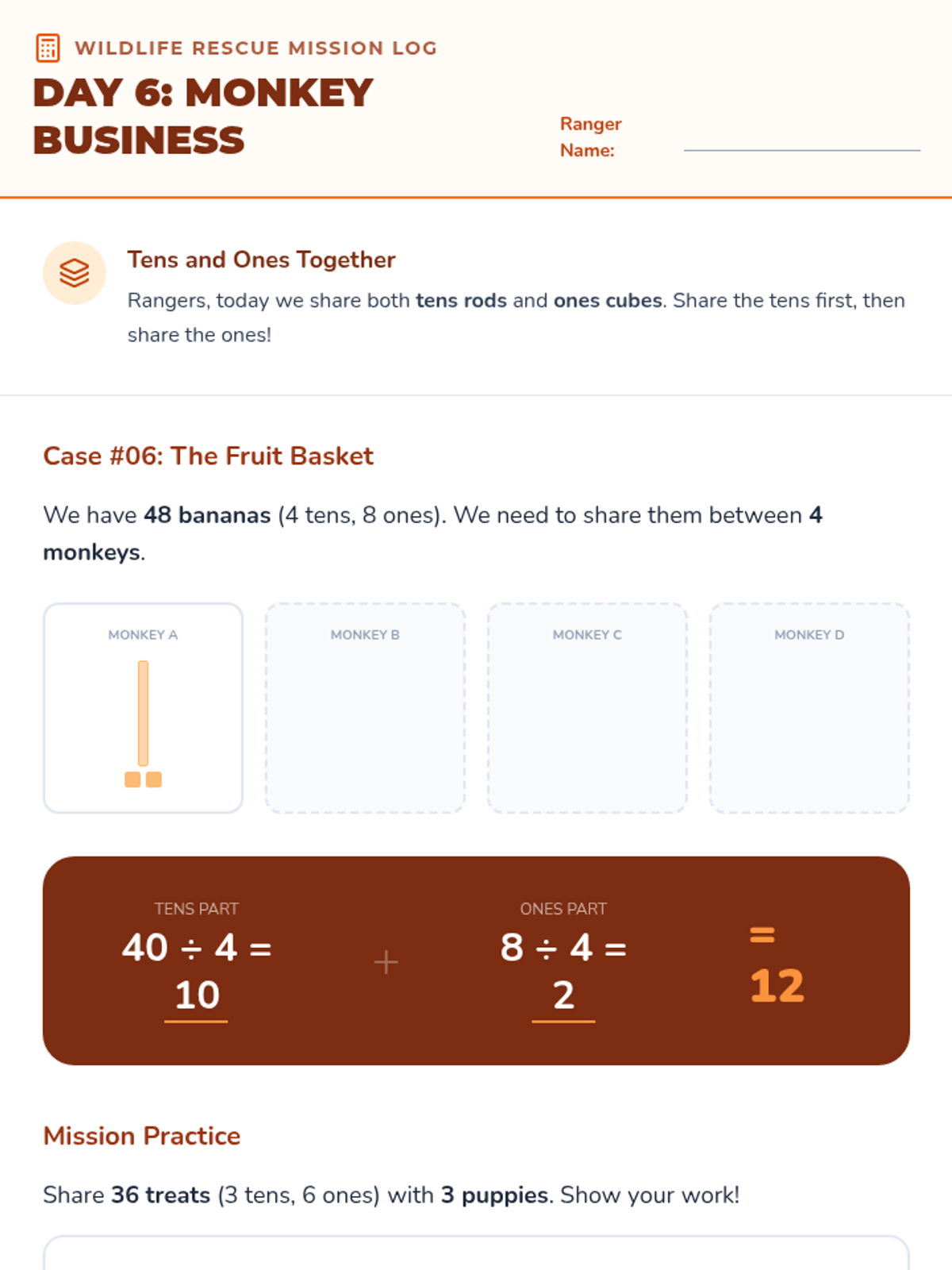 Students explore division as 'equal sharing' using counters to distribute snacks to hungry animals. Includes a baseline pre-assessment.