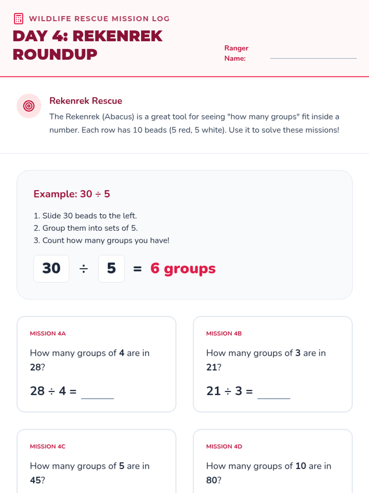 Students build division fact fluency and strategy using the 100-bead Rekenrek to find 'how many groups'.