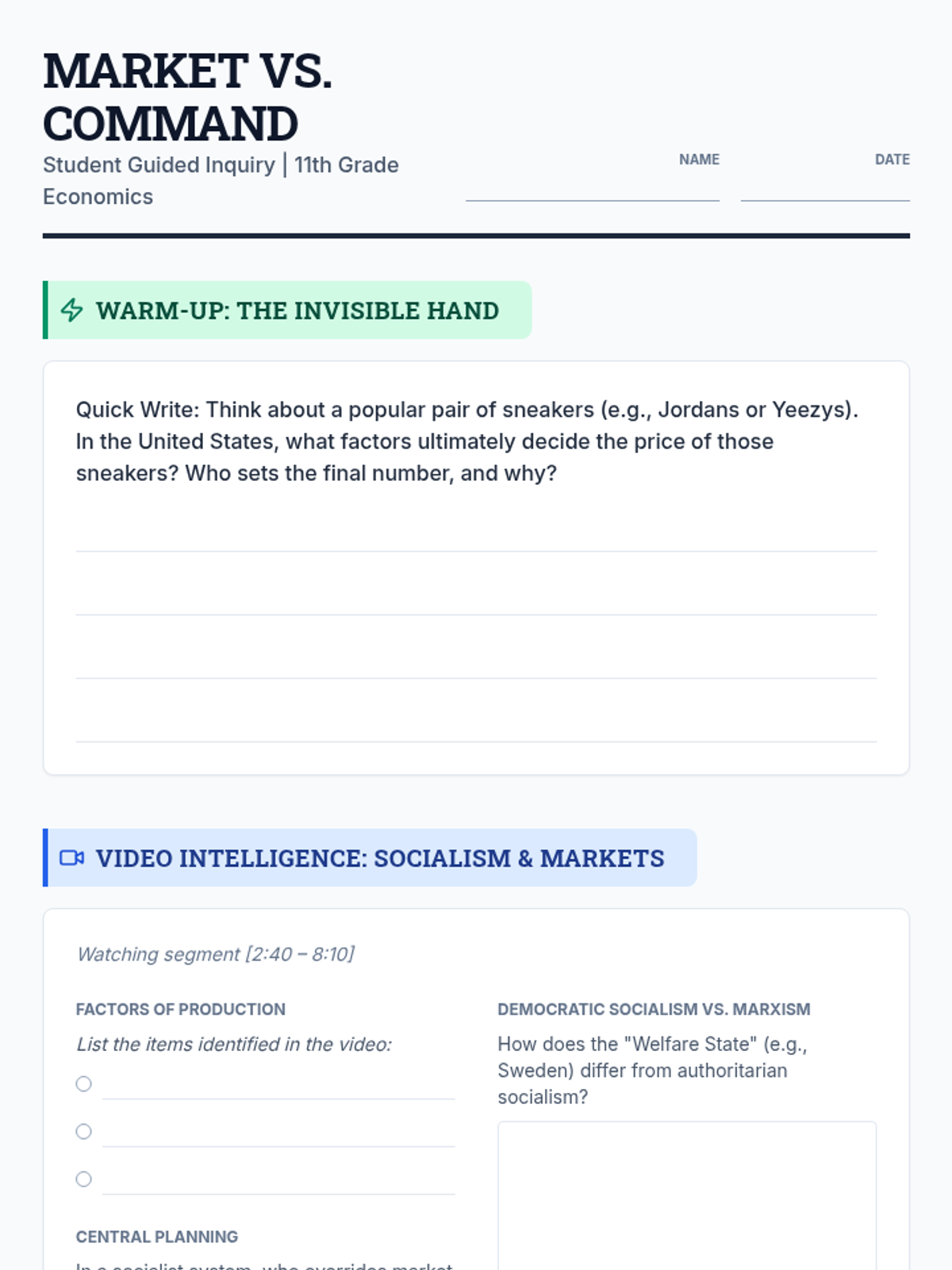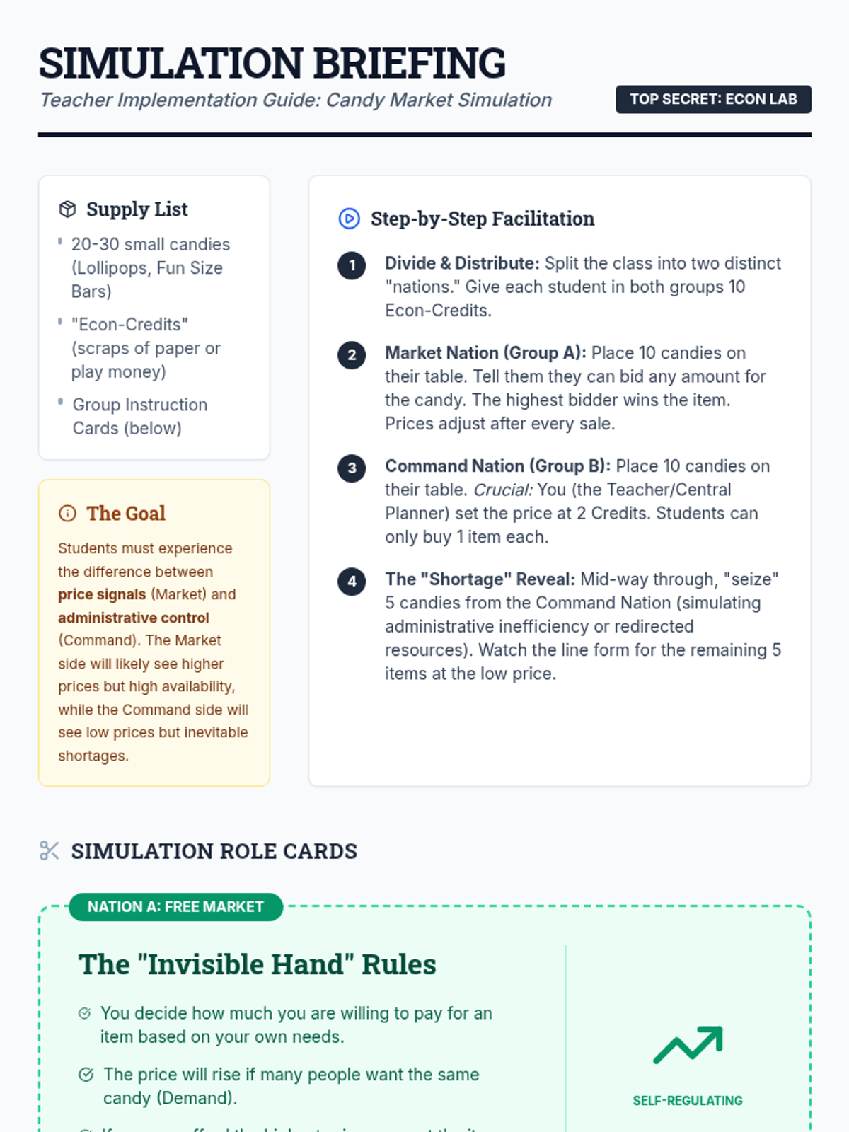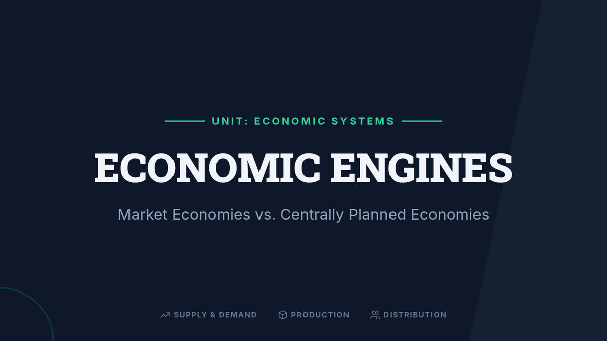A comparative study of economic systems, focusing on the differences between Market Economies and Centrally Planned (Command) Economies. Students will explore the 'Invisible Hand' theory, watch a deep dive on socialist economic structures, and participate in a candy-trading simulation to witness shortages and surpluses first-hand.