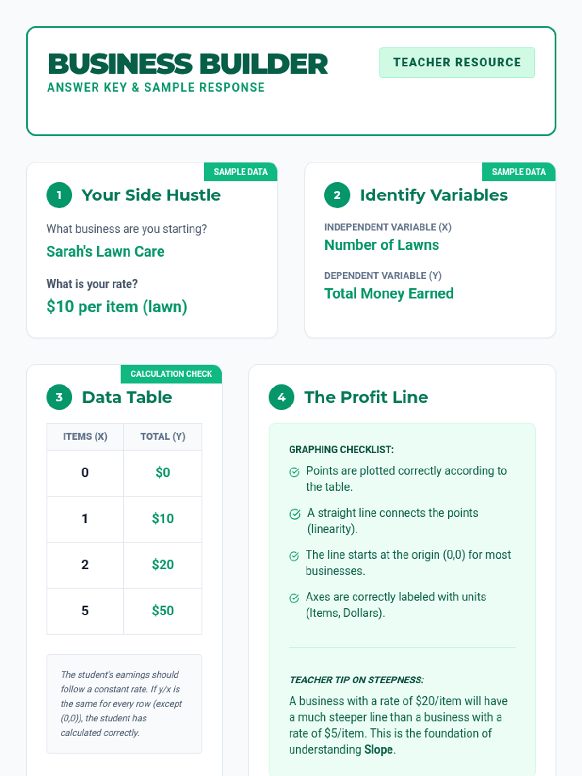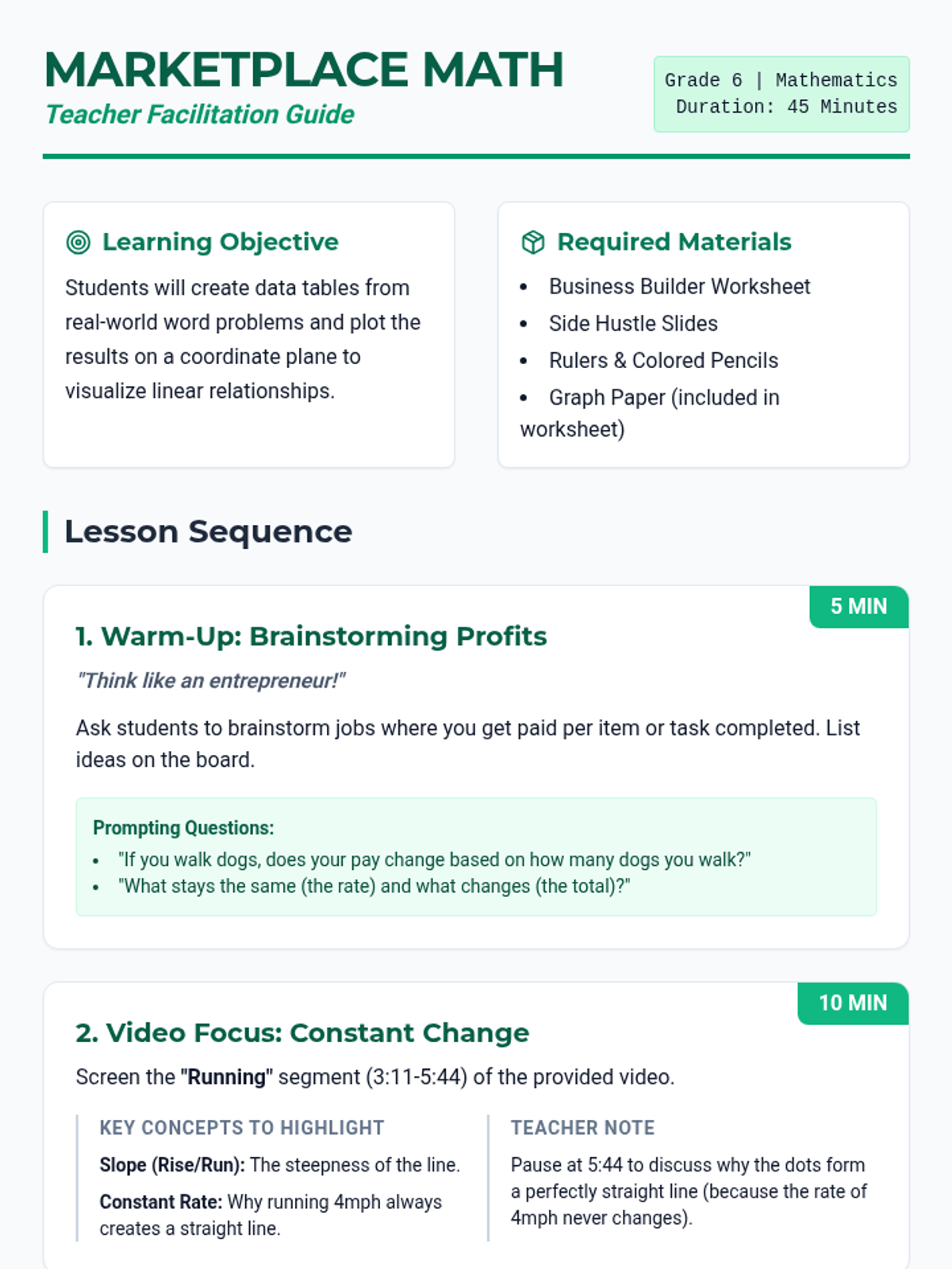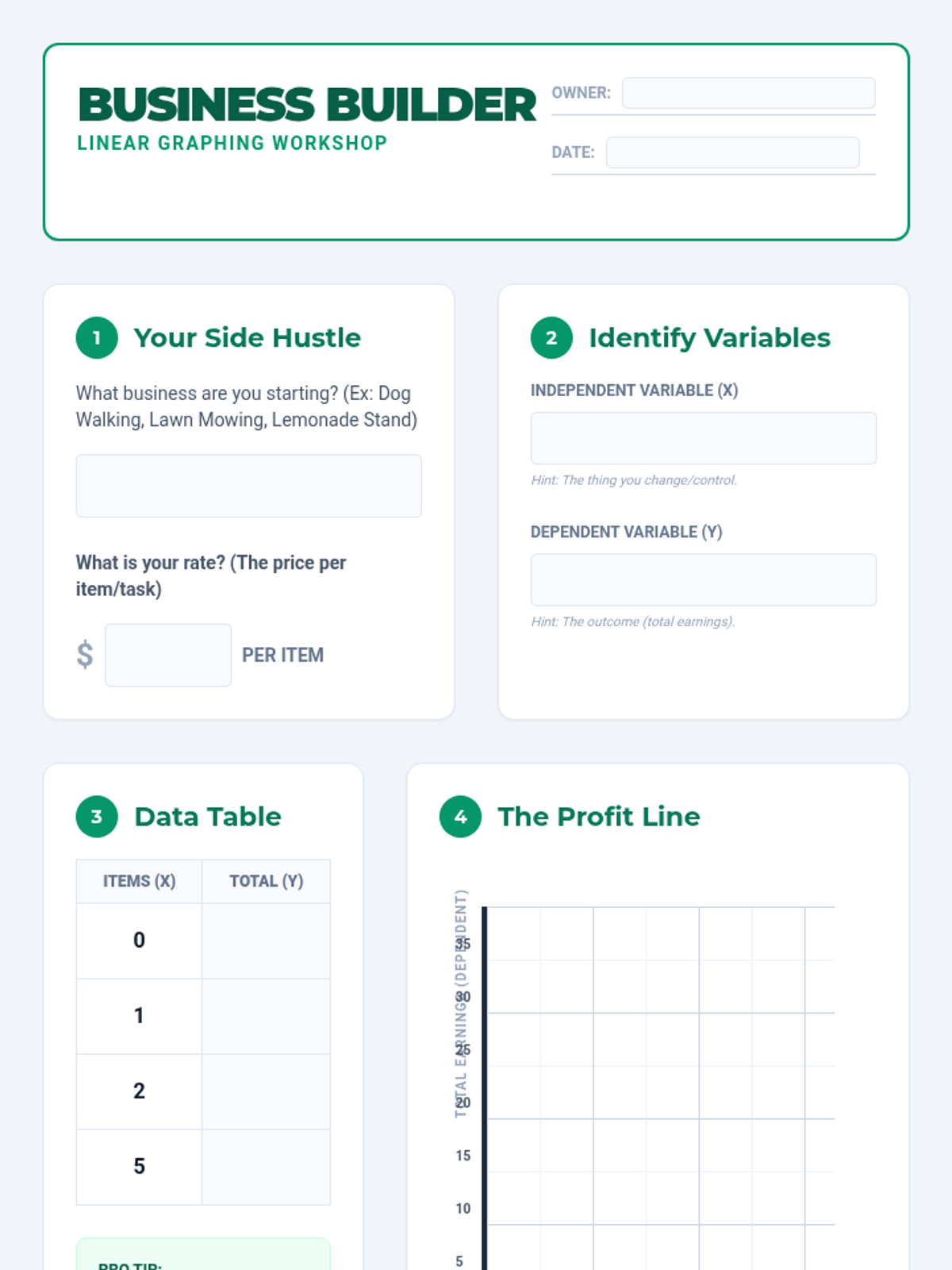 A 6th-grade math lesson where students learn to identify independent and dependent variables, create data tables from real-world scenarios, and graph linear relationships using a 'business owner' theme.