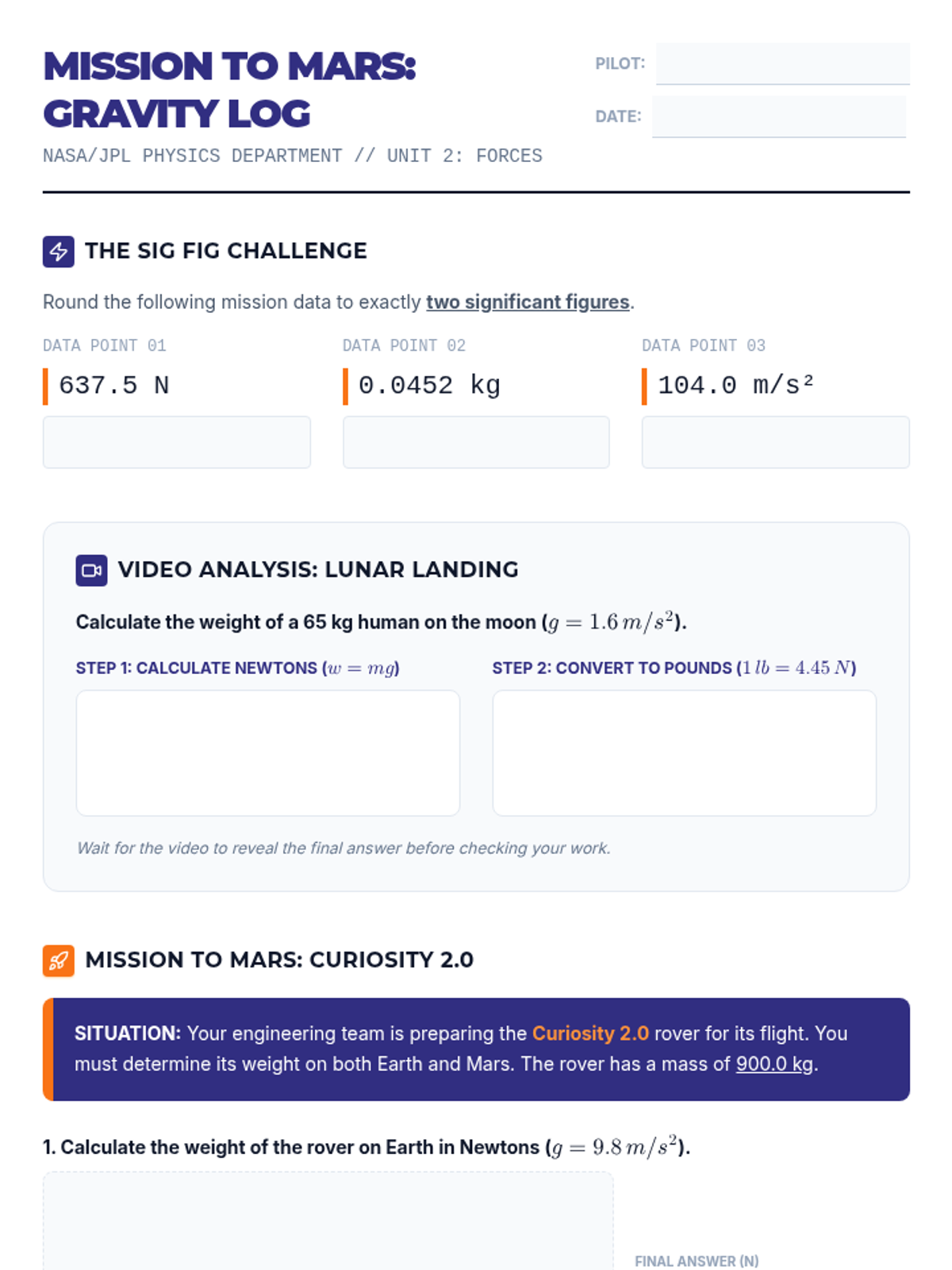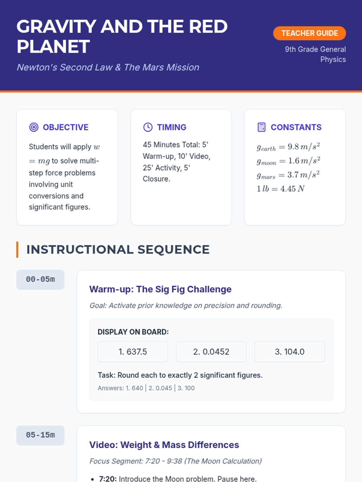 Students will master the relationship between mass and weight by calculating forces on different celestial bodies, specifically focusing on a Mars rover mission. This lesson emphasizes unit conversions between Newtons and pounds and the critical importance of significant figures in scientific computation.