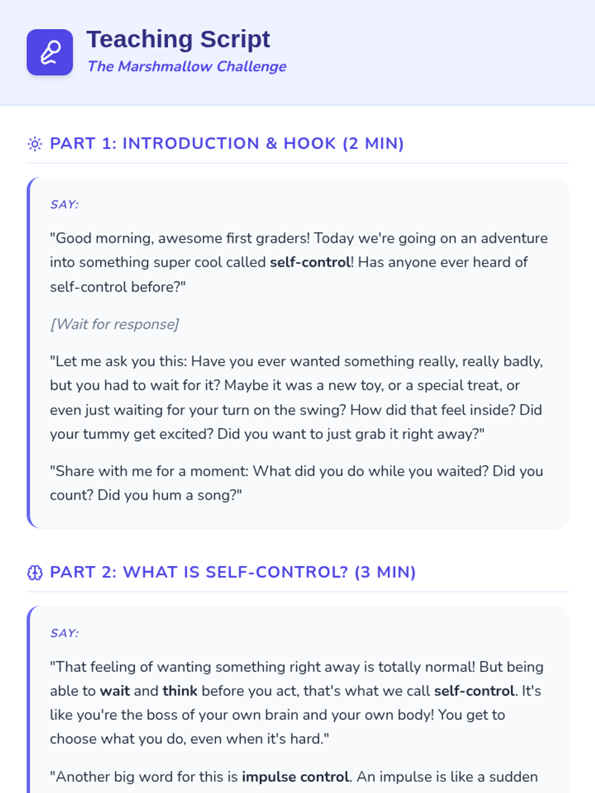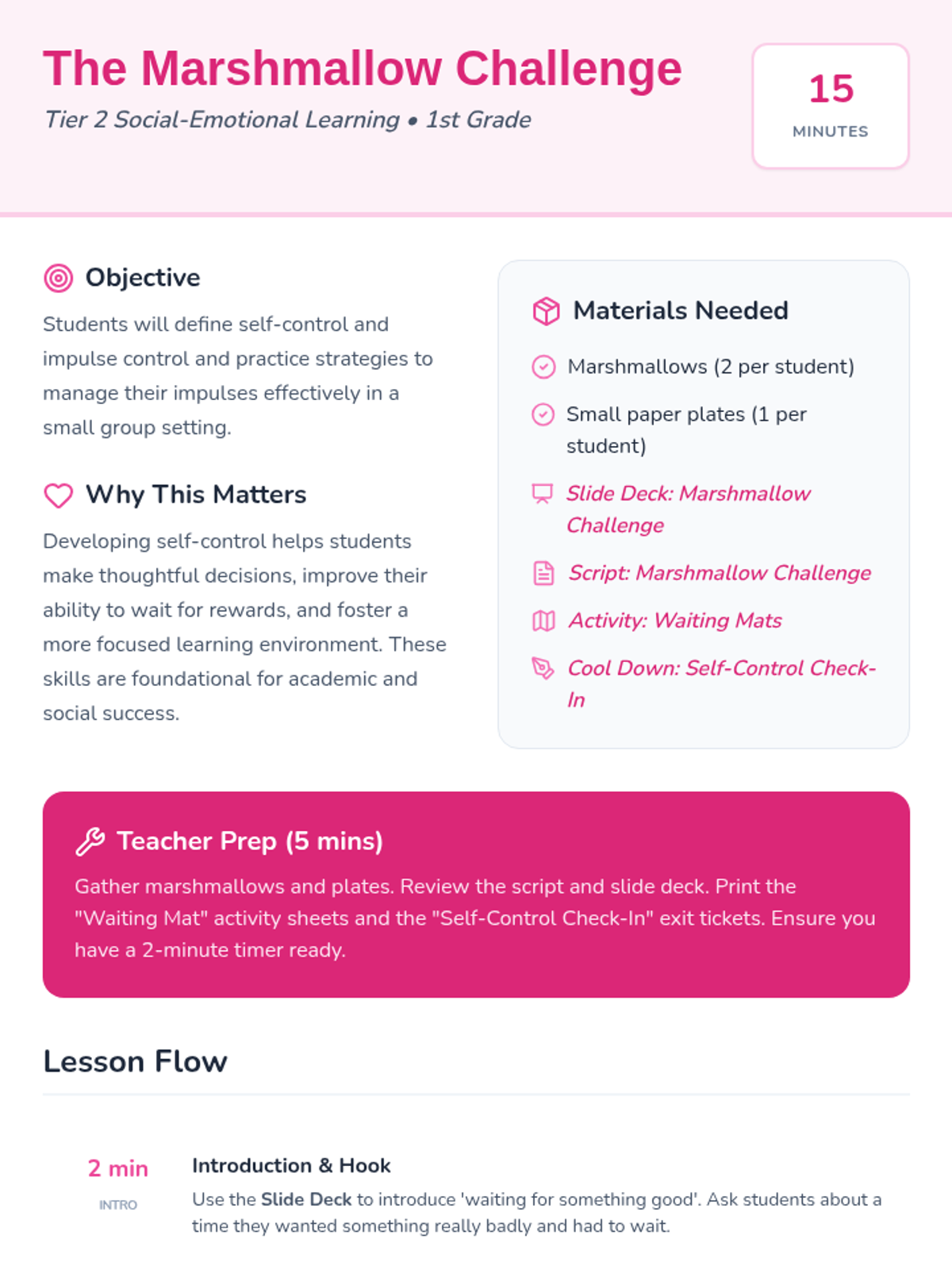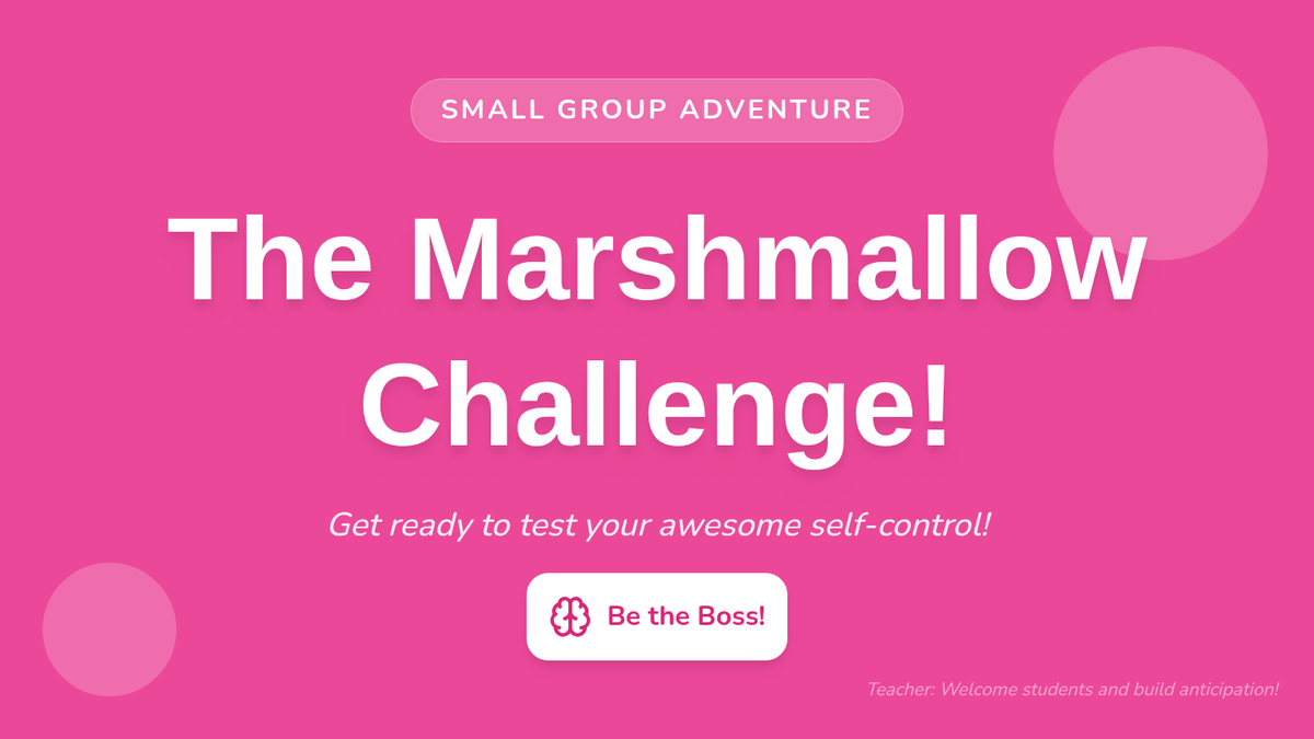 A Tier 2 social-emotional learning lesson for 1st graders focused on developing self-control and impulse management through the classic marshmallow test.