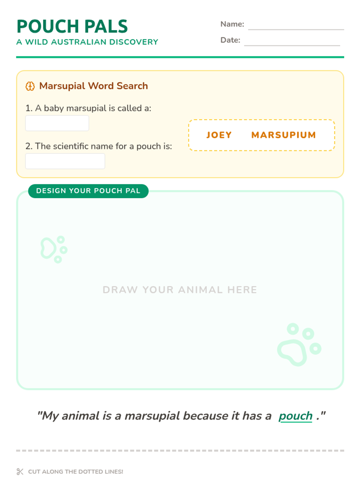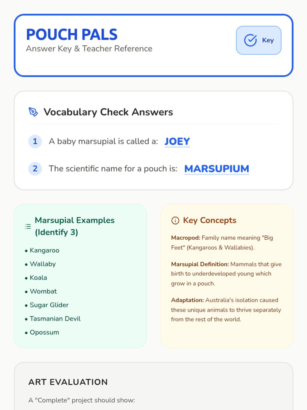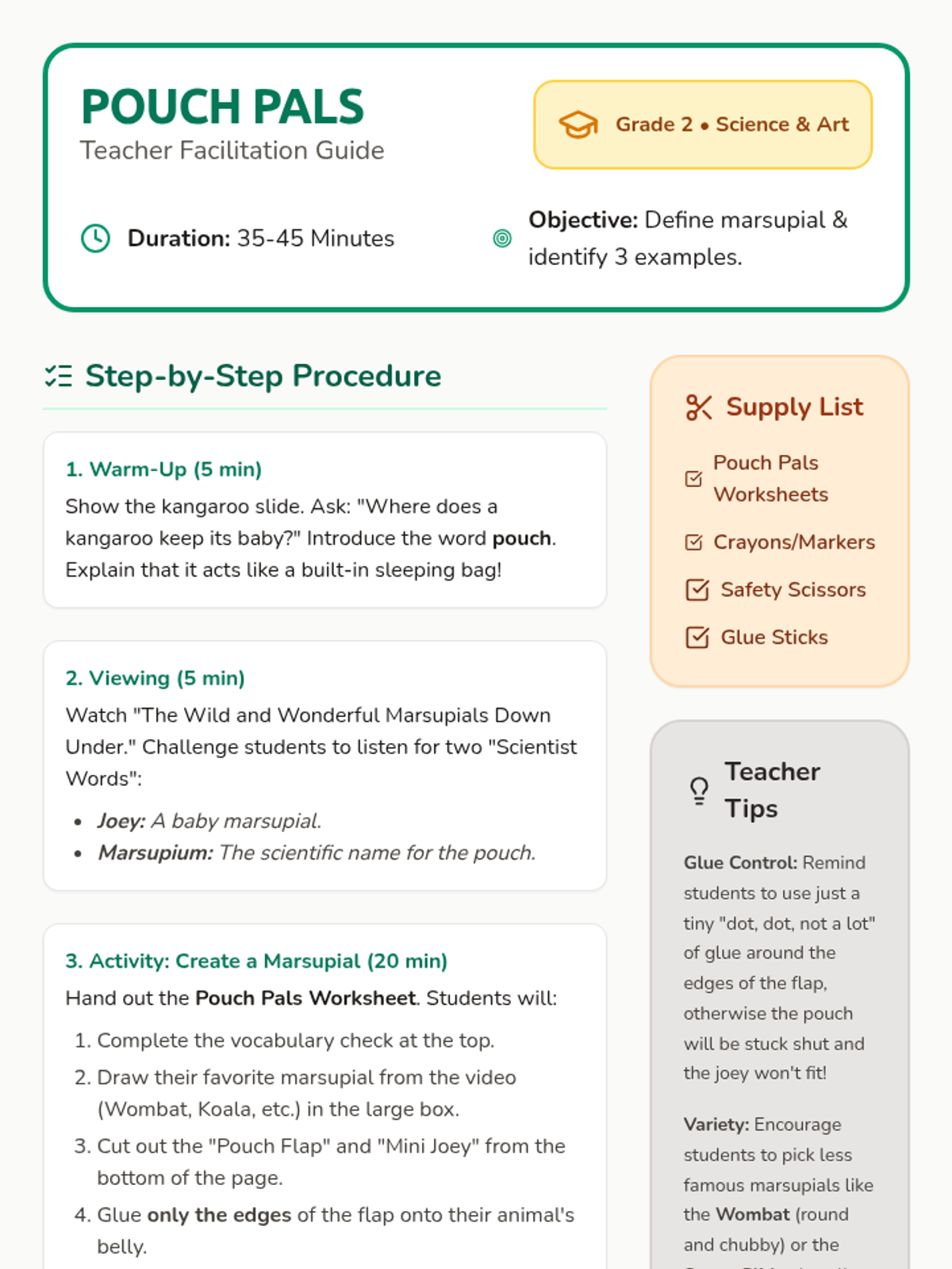 Students will learn the definition of marsupials, identify key vocabulary like 'joey' and 'marsupium', and create a 3D-effect art project of an Australian marsupial with a functional paper pouch.