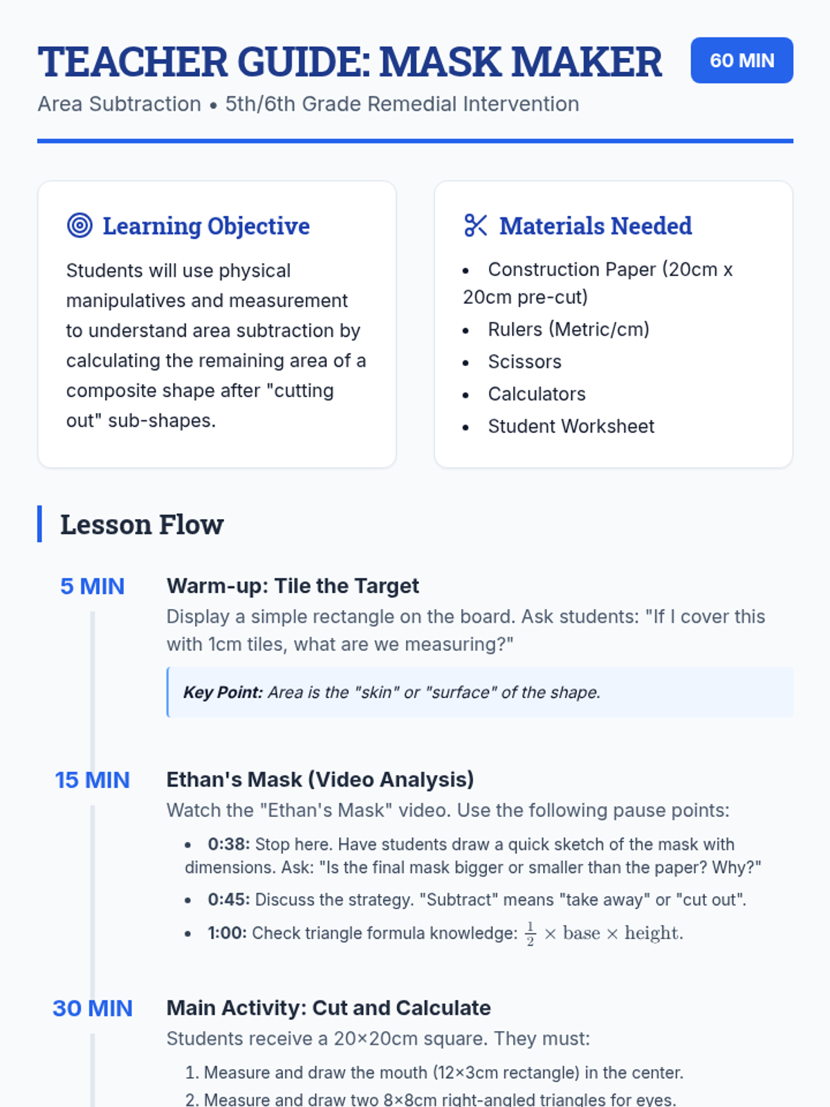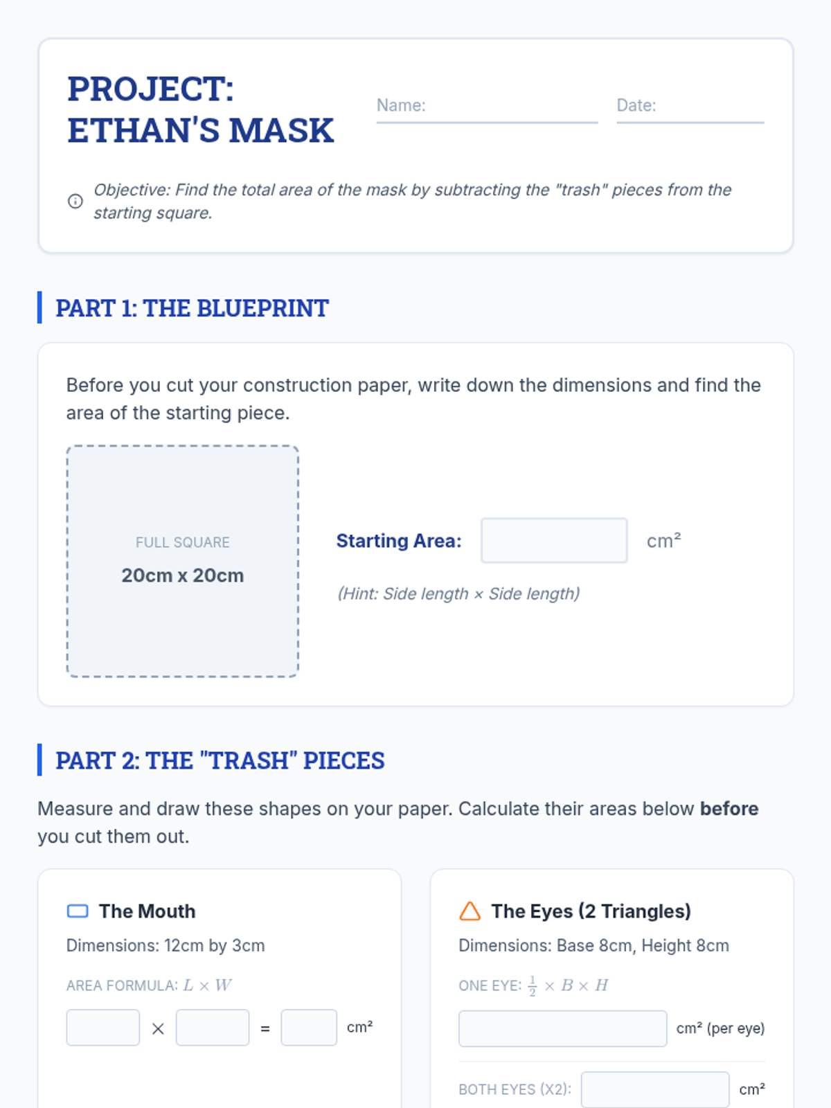 A hands-on remedial lesson for 5th/6th graders using physical construction paper to explore area subtraction through the creation of a geometric mask. Students calculate the area of 'trash' pieces (eyes and mouth) and subtract them from the total area to find the remaining surface area.