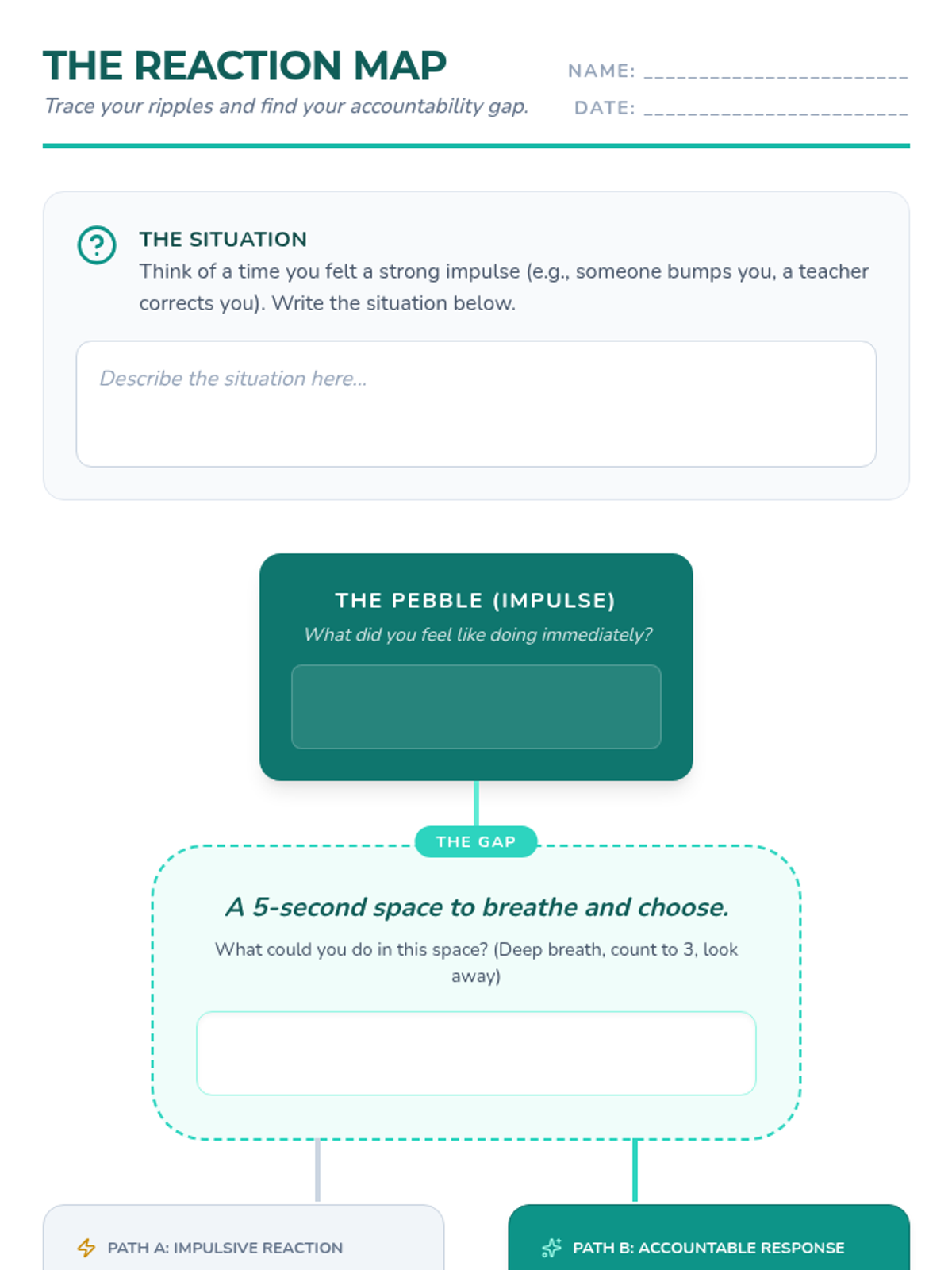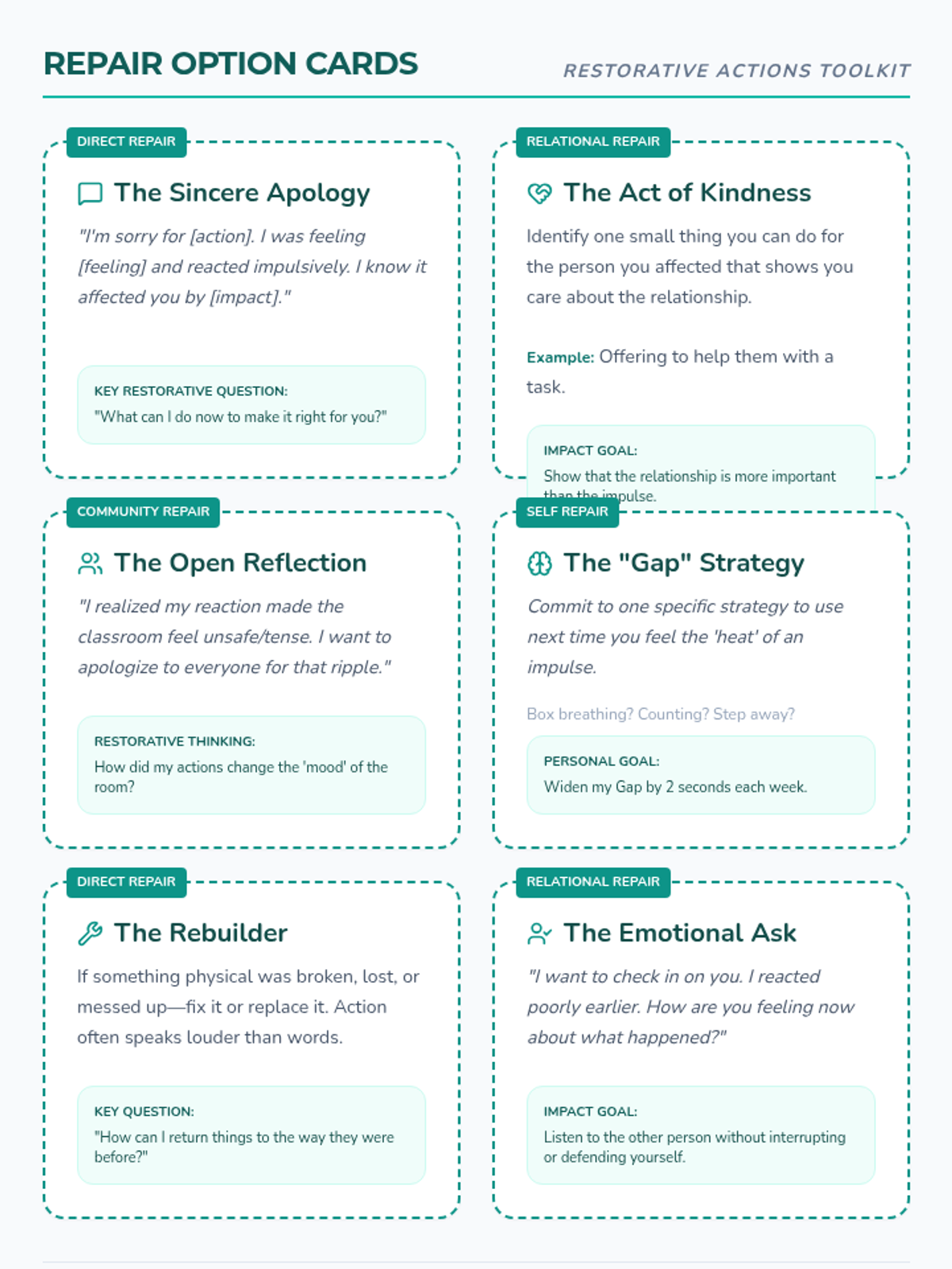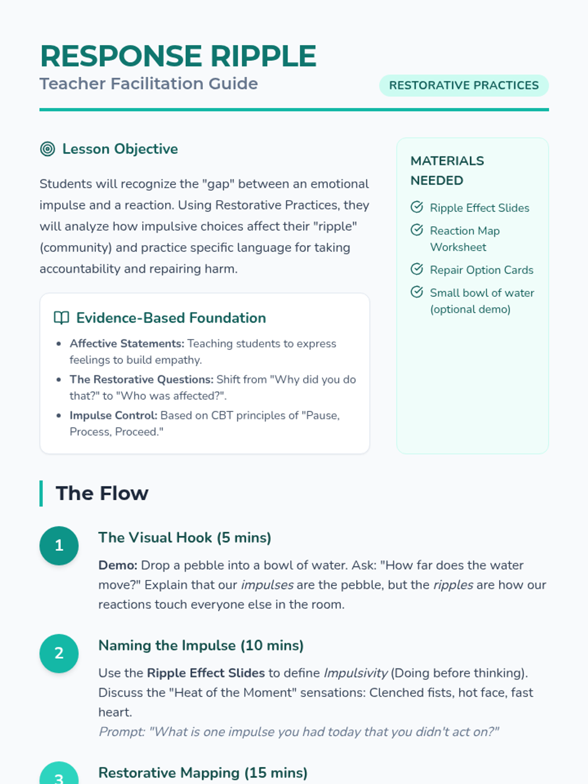 A Restorative Practices-based lesson for 6th graders focused on identifying impulsive emotional reactions, understanding their impact on others, and taking accountability through meaningful repair.