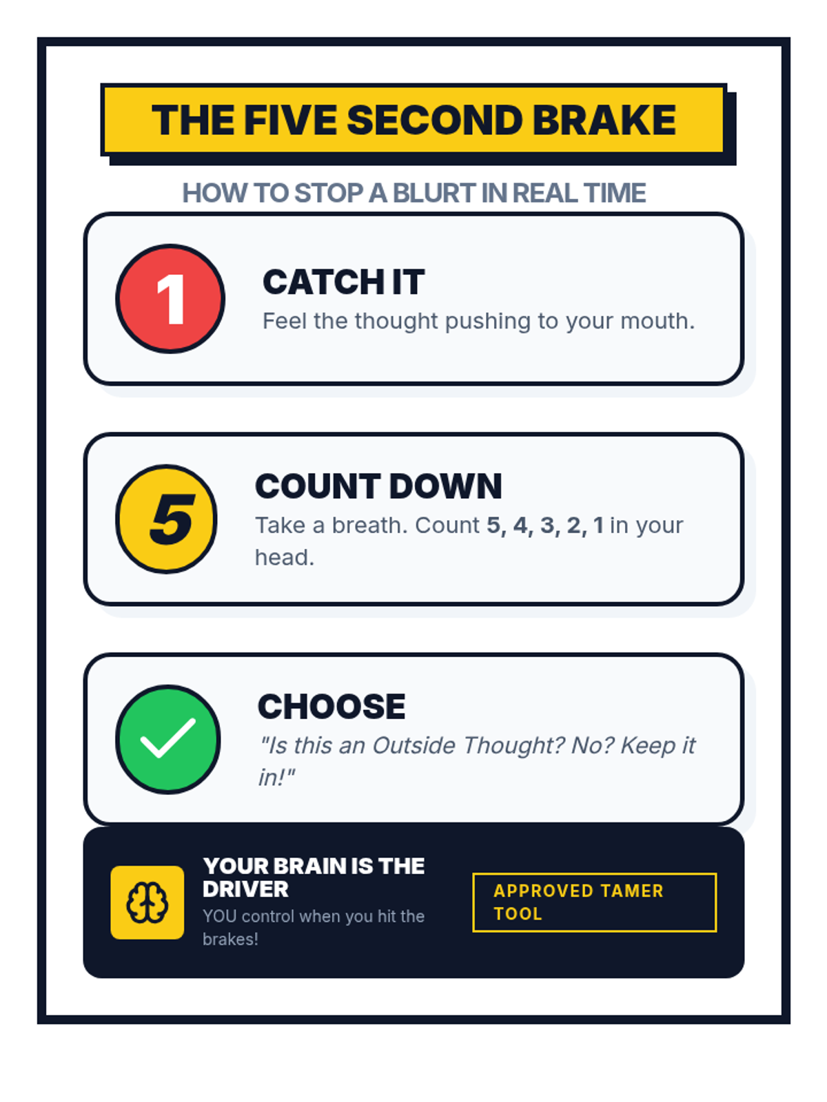 Learning the '5-Second Braking' technique to pause before a thought leaves the mouth.