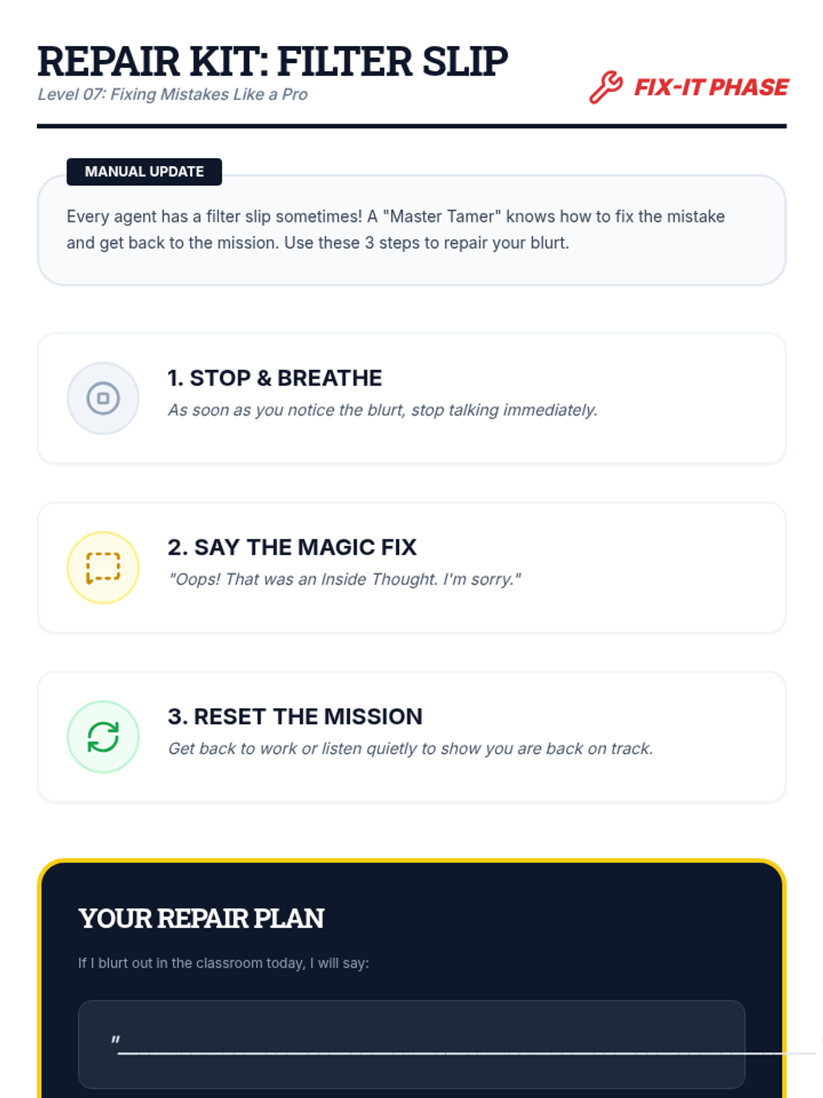 Learning how to apologize and reset after an accidental blurt occurs.