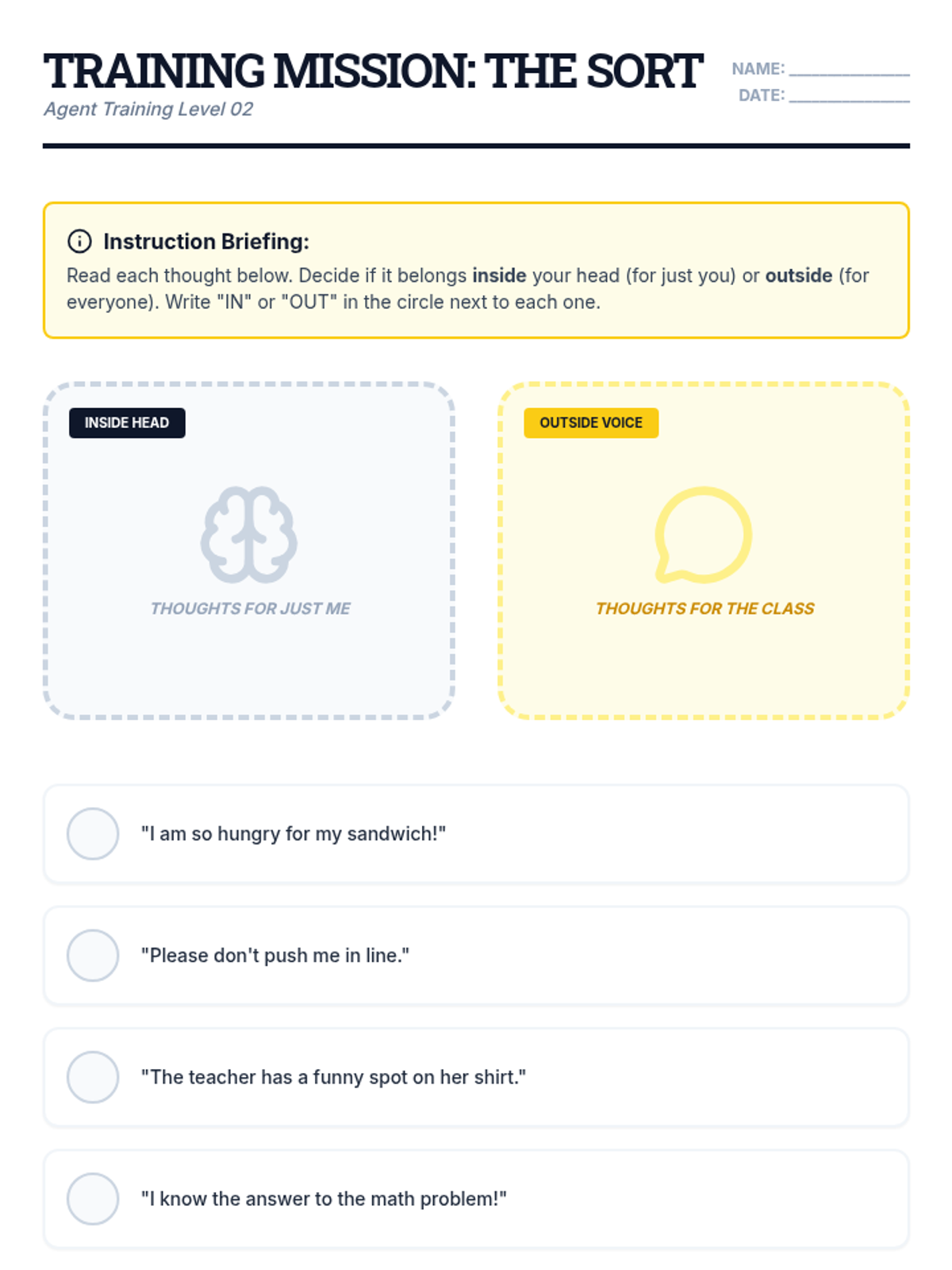 Active practice sorting various thoughts into 'stay inside' and 'can come out' categories through interactive games.