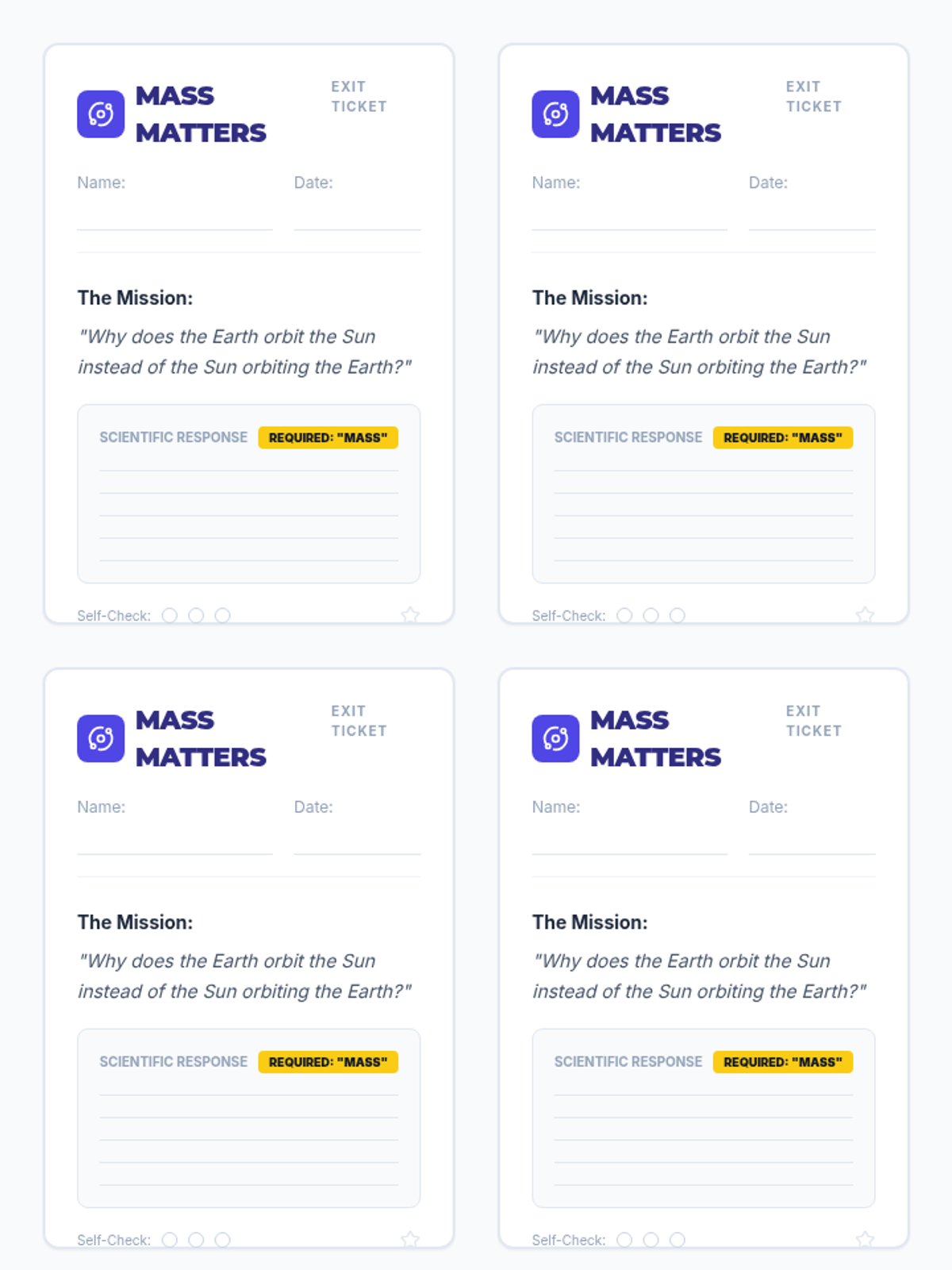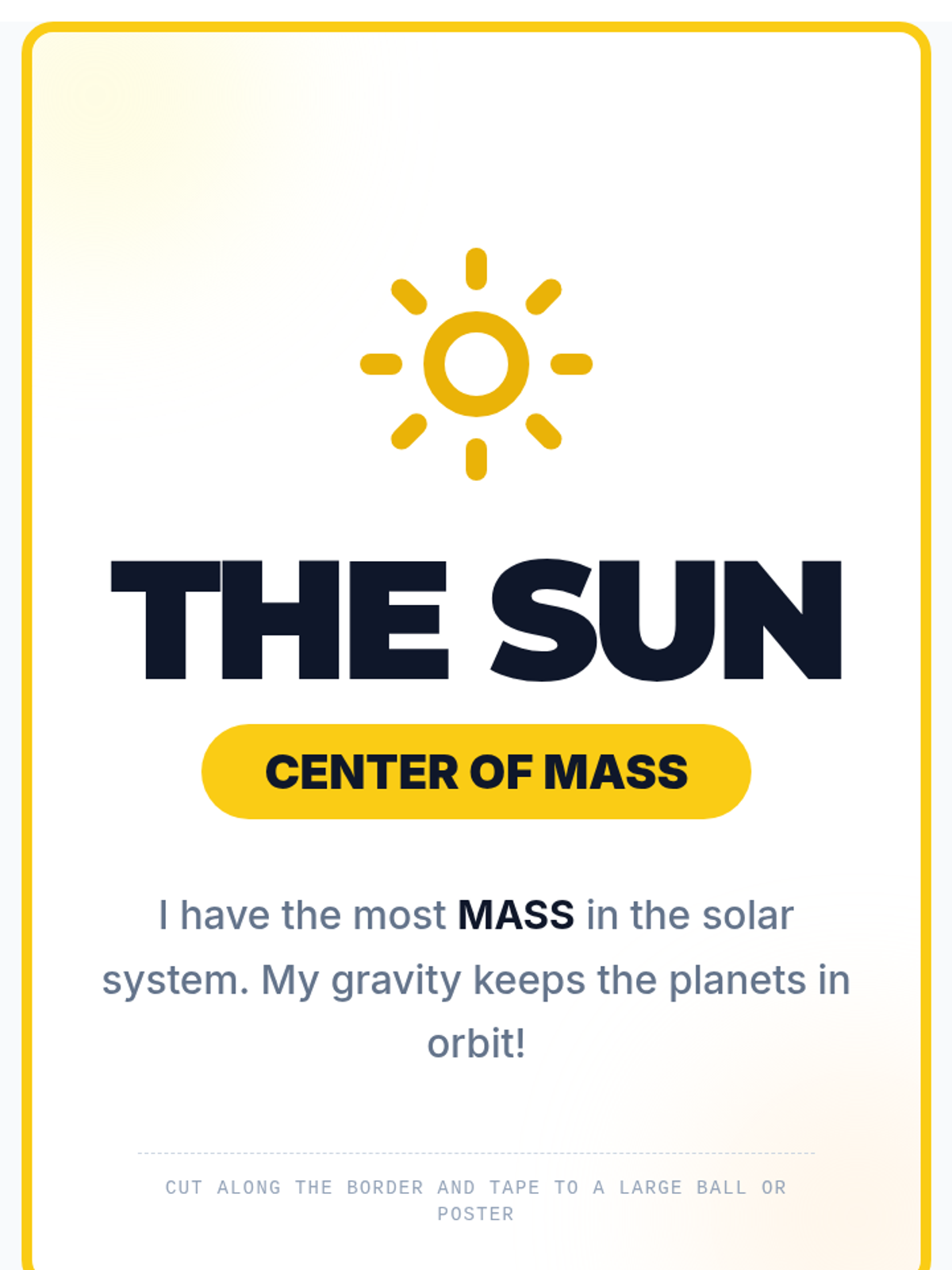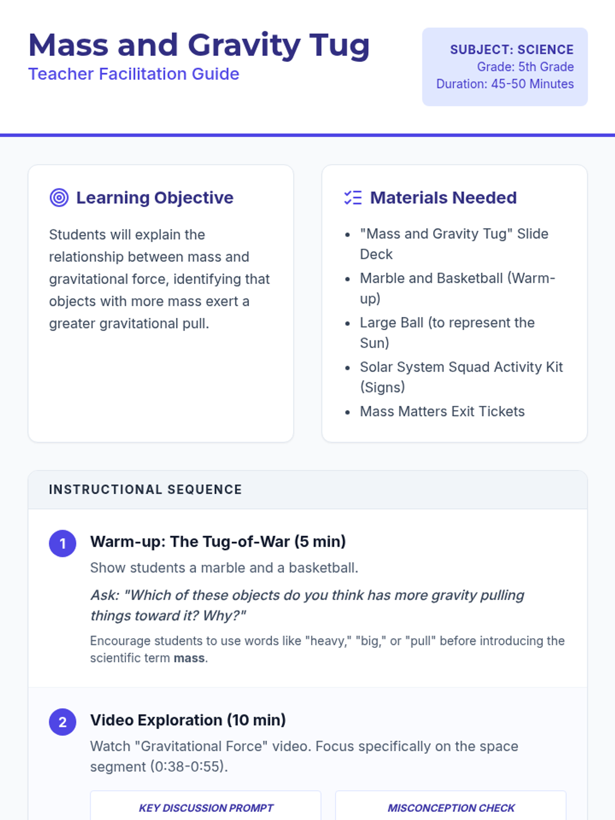 A lesson exploring how mass determines the strength of gravitational force, featuring a solar system role-play activity and video-based discussion.
