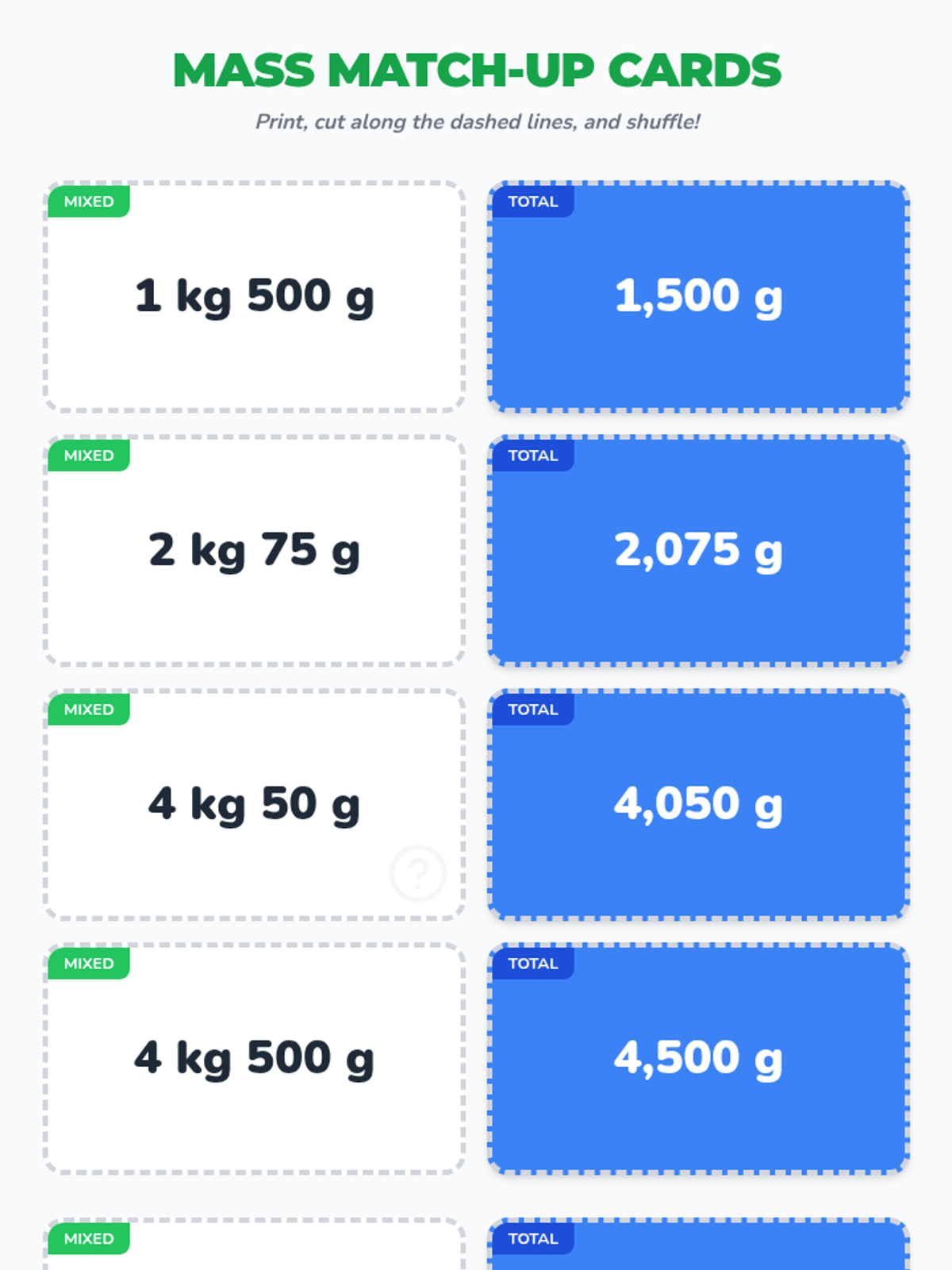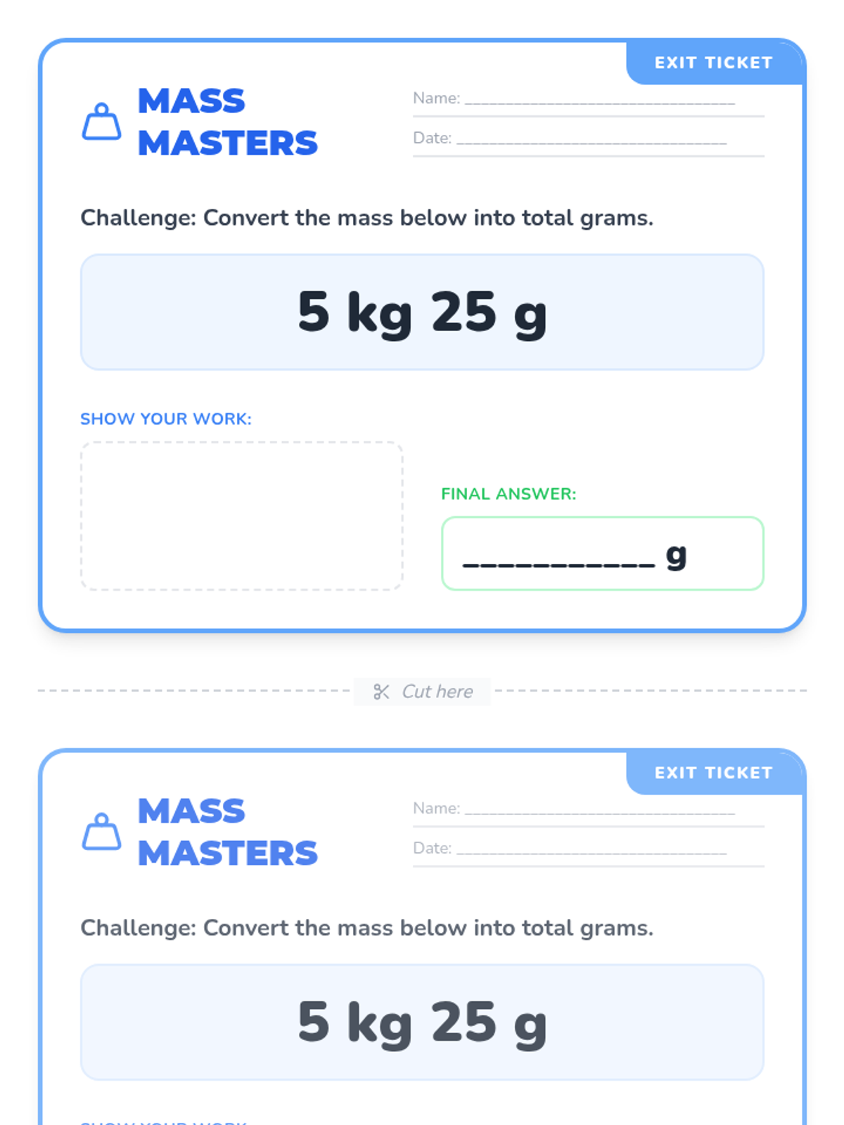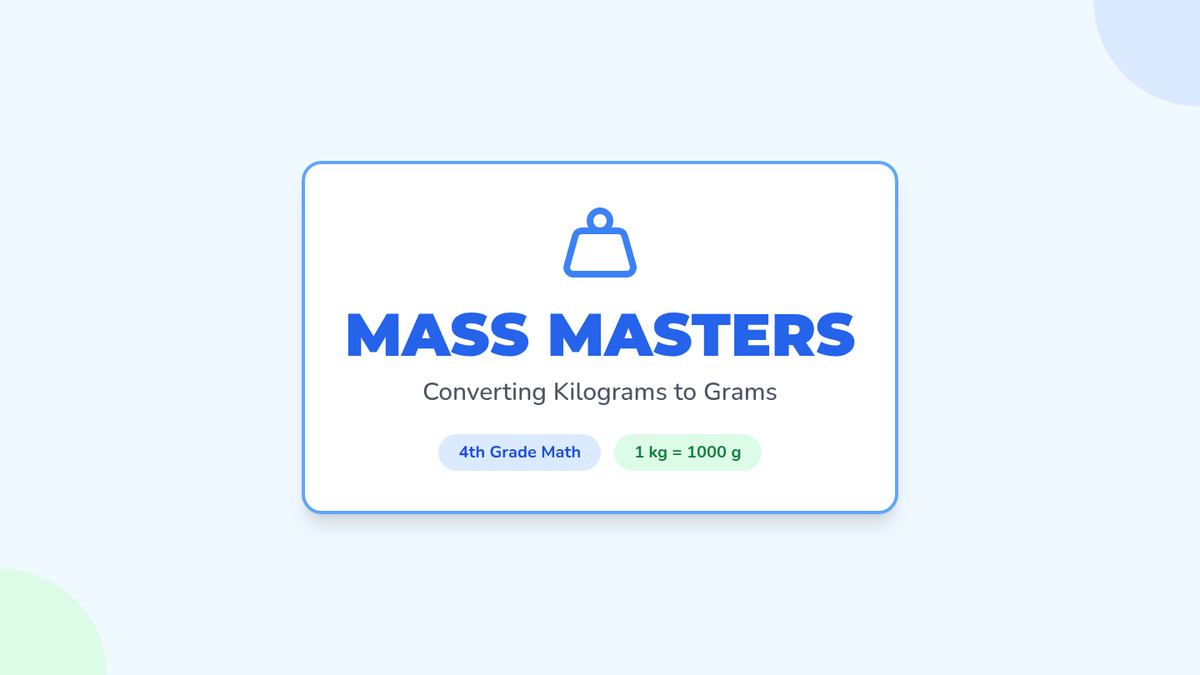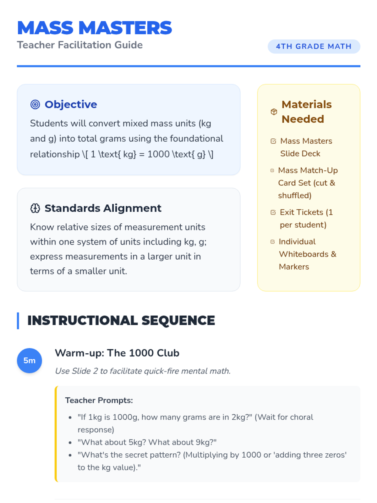 A 4th-grade math lesson focused on converting mixed mass units (kilograms and grams) into total grams using the 1kg = 1000g relationship. Includes a video-guided instruction, a matching activity, and an exit ticket.