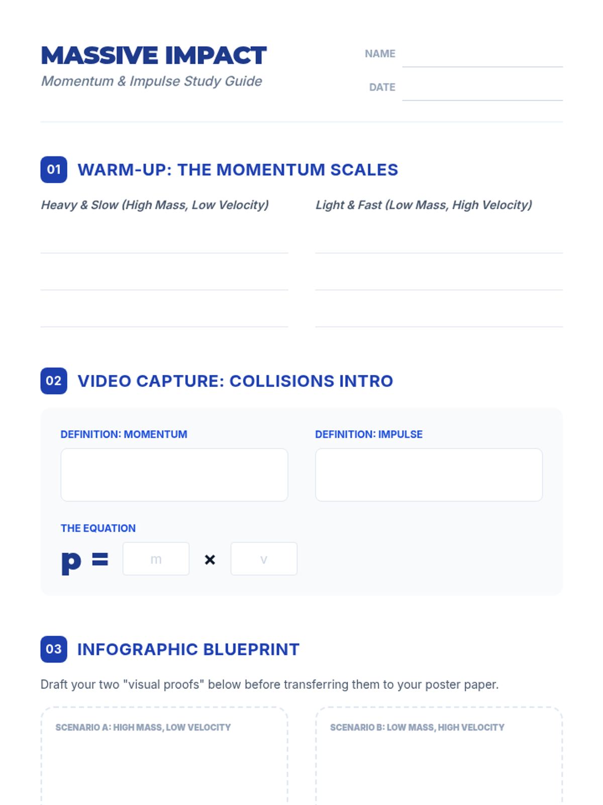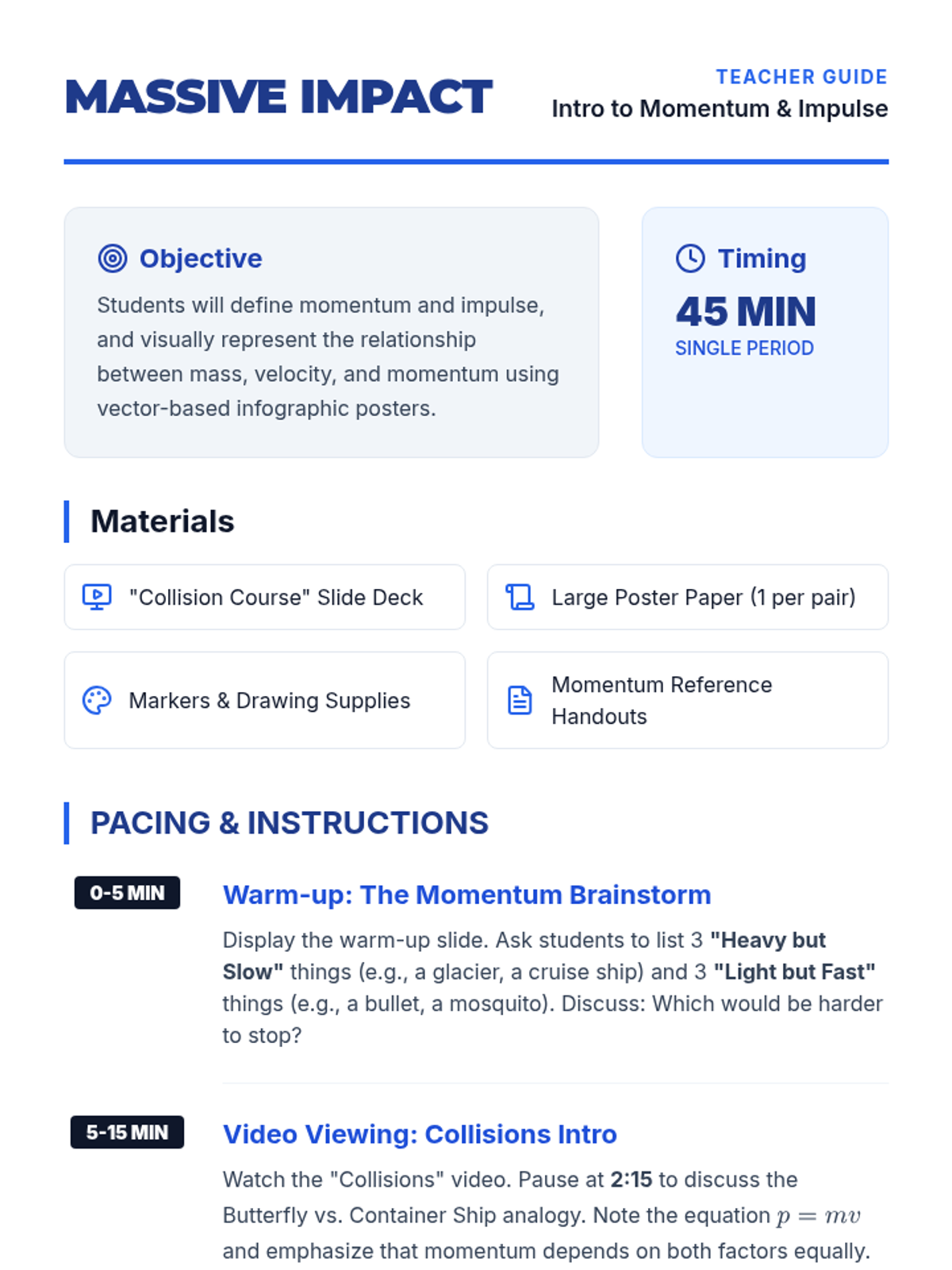 A high-impact introductory lesson on momentum, mass, and velocity relationships featuring a 'Momentum Factors' infographic activity and video-based discussion.