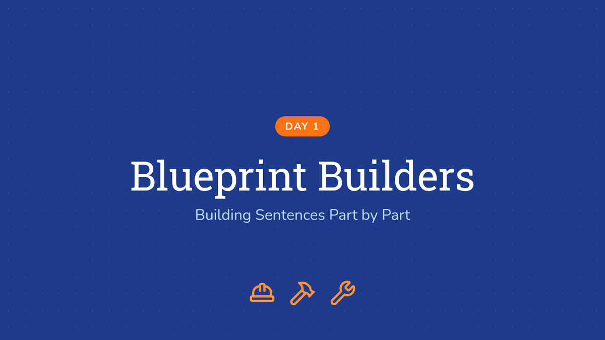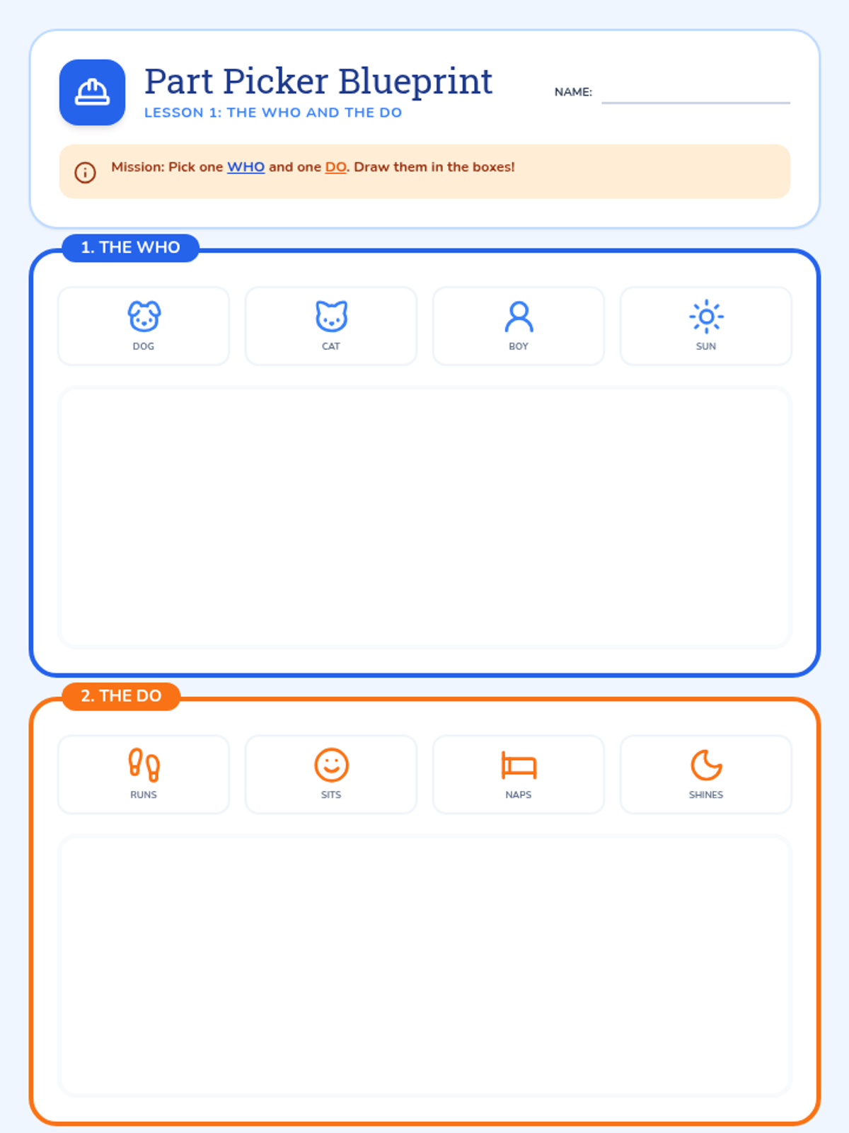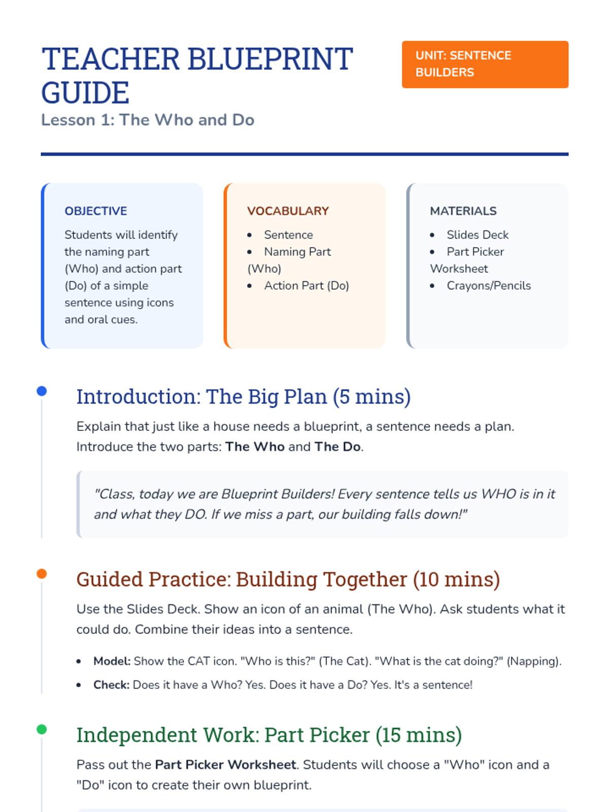 Introduces the two core parts of a sentence: the naming part (Who) and the action part (Do). Students learn to combine these orally and in simple written forms using icons.