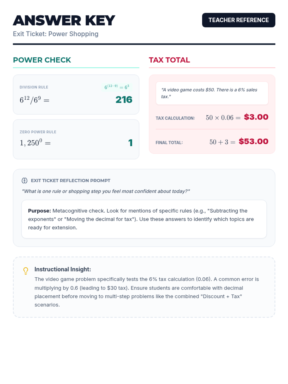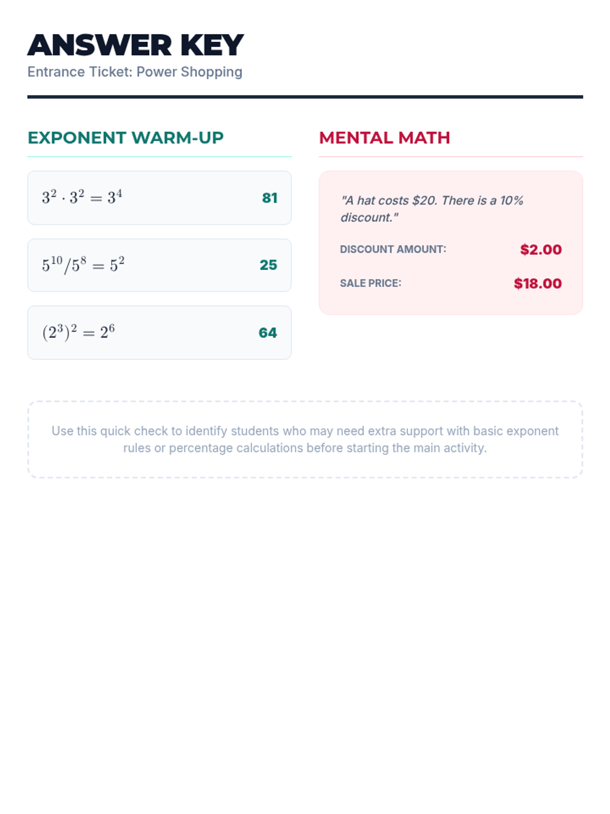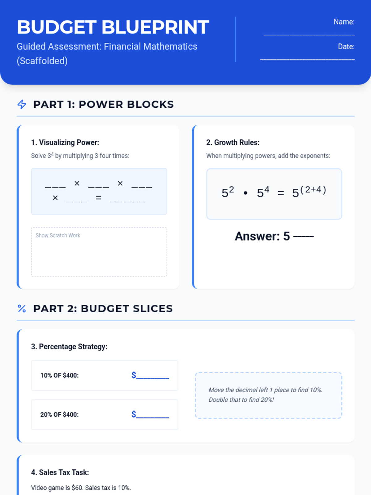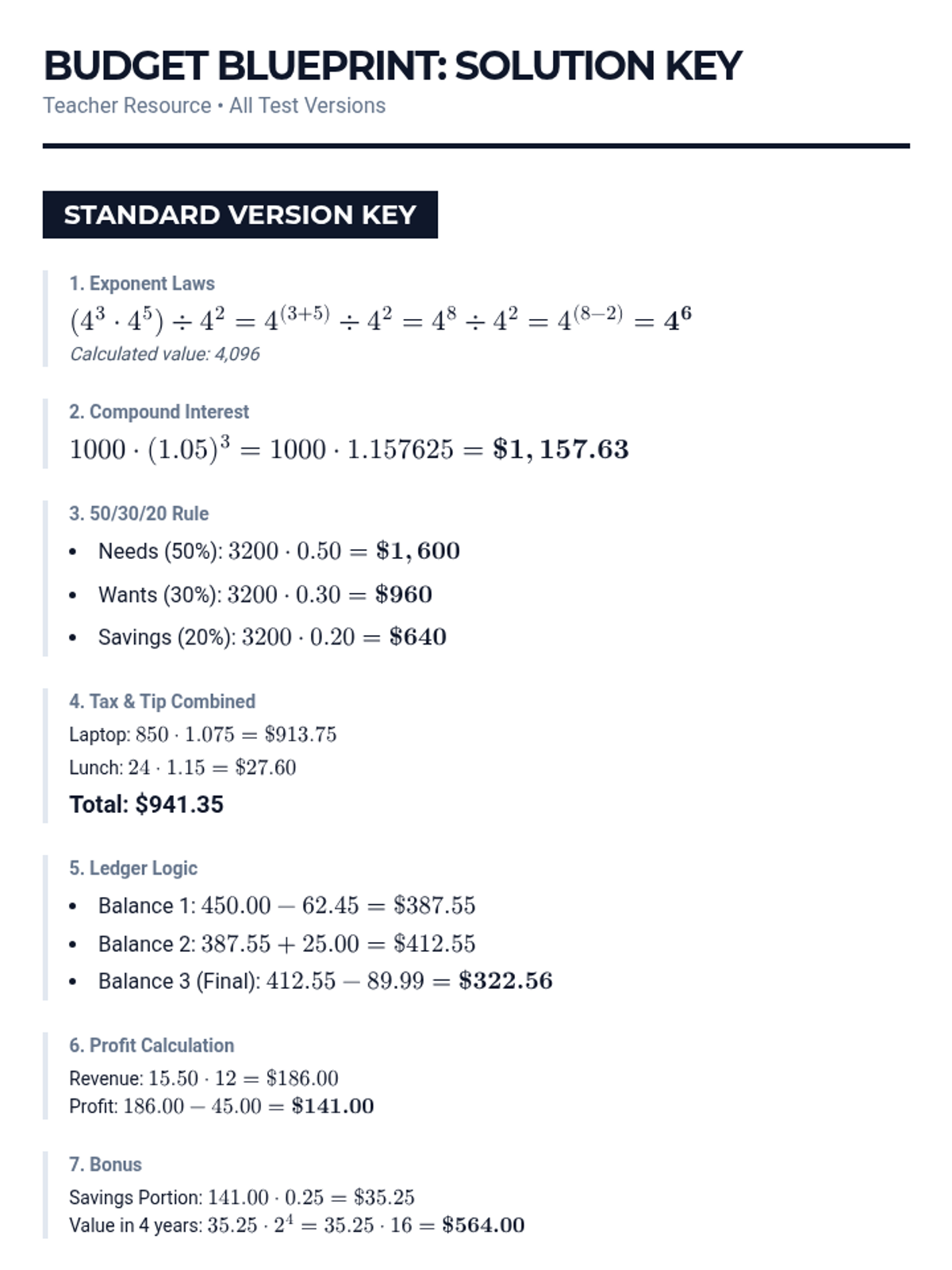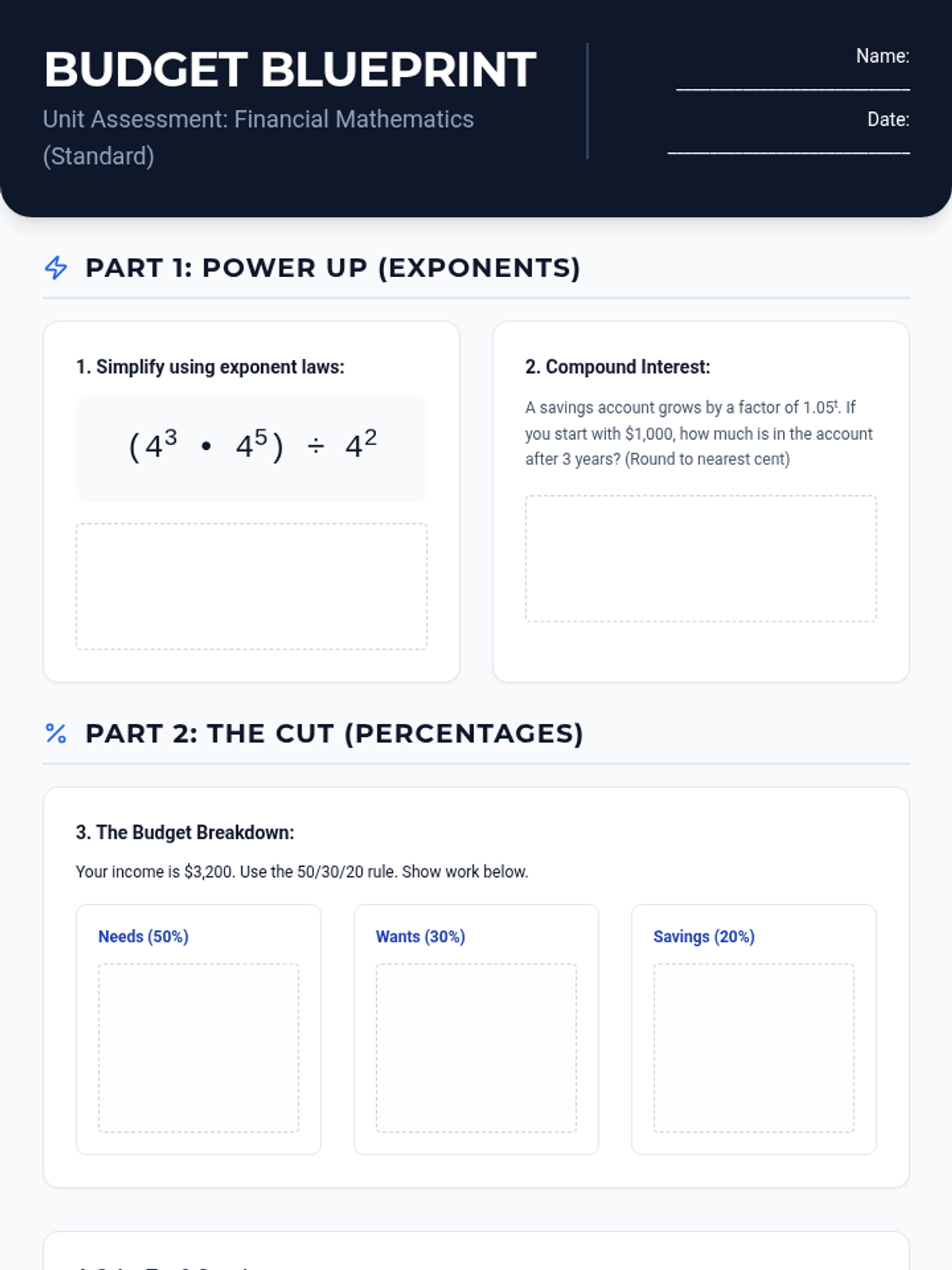 A lesson focused on applying exponent rules, percentage calculations, and basic arithmetic to real-world financial scenarios and budgeting. Includes two differentiated versions of a comprehensive unit test to support varied learning needs.