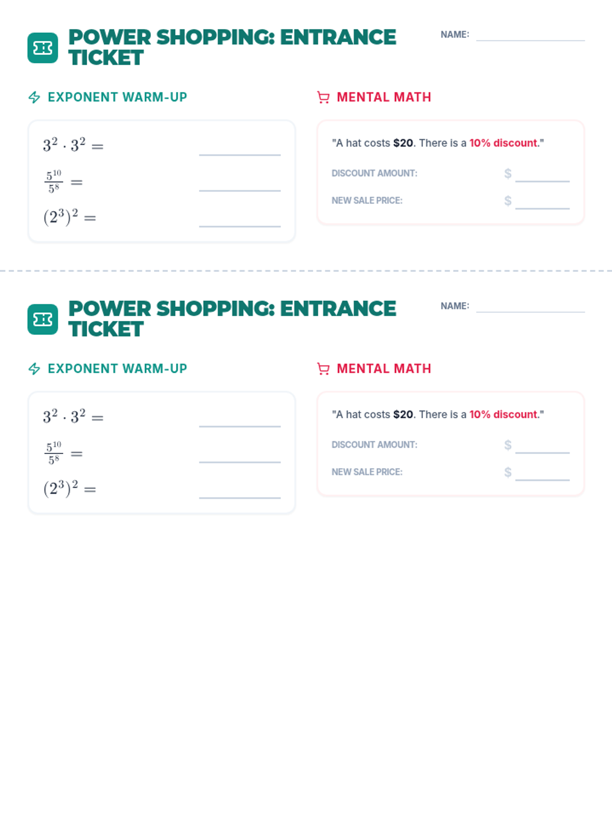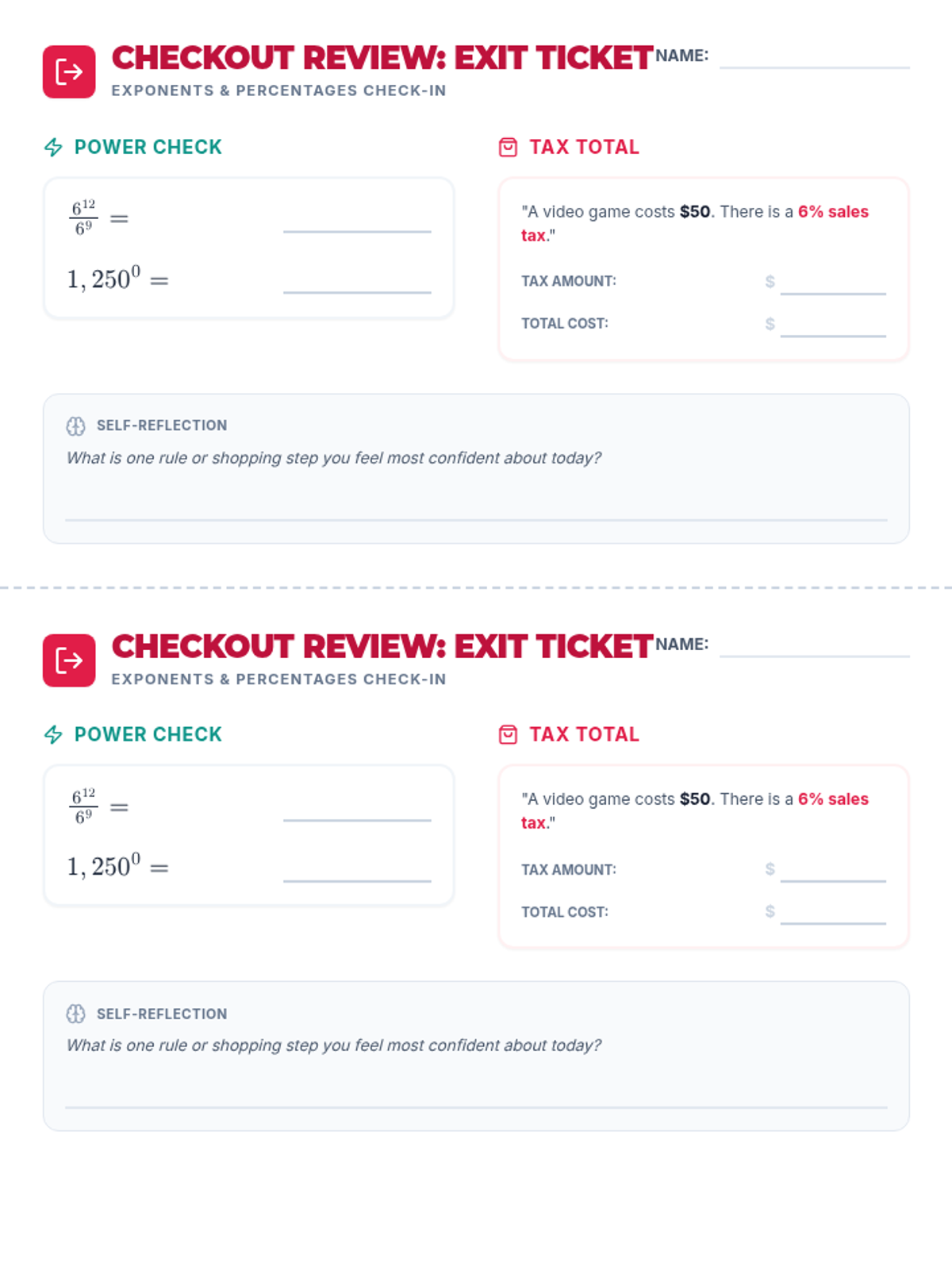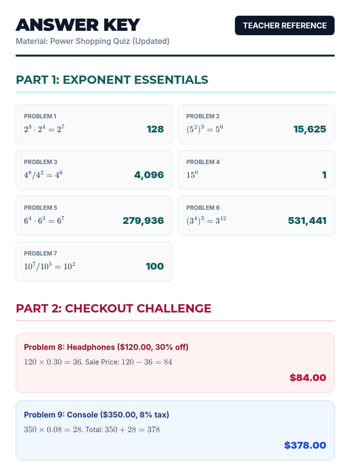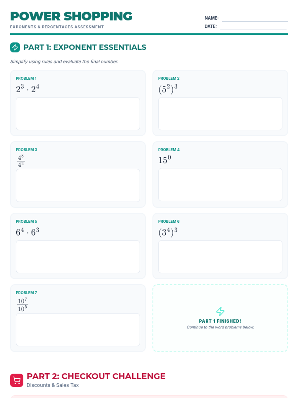 A math assessment focusing on basic exponent rules and real-world percentage applications involving sales tax and discounts.