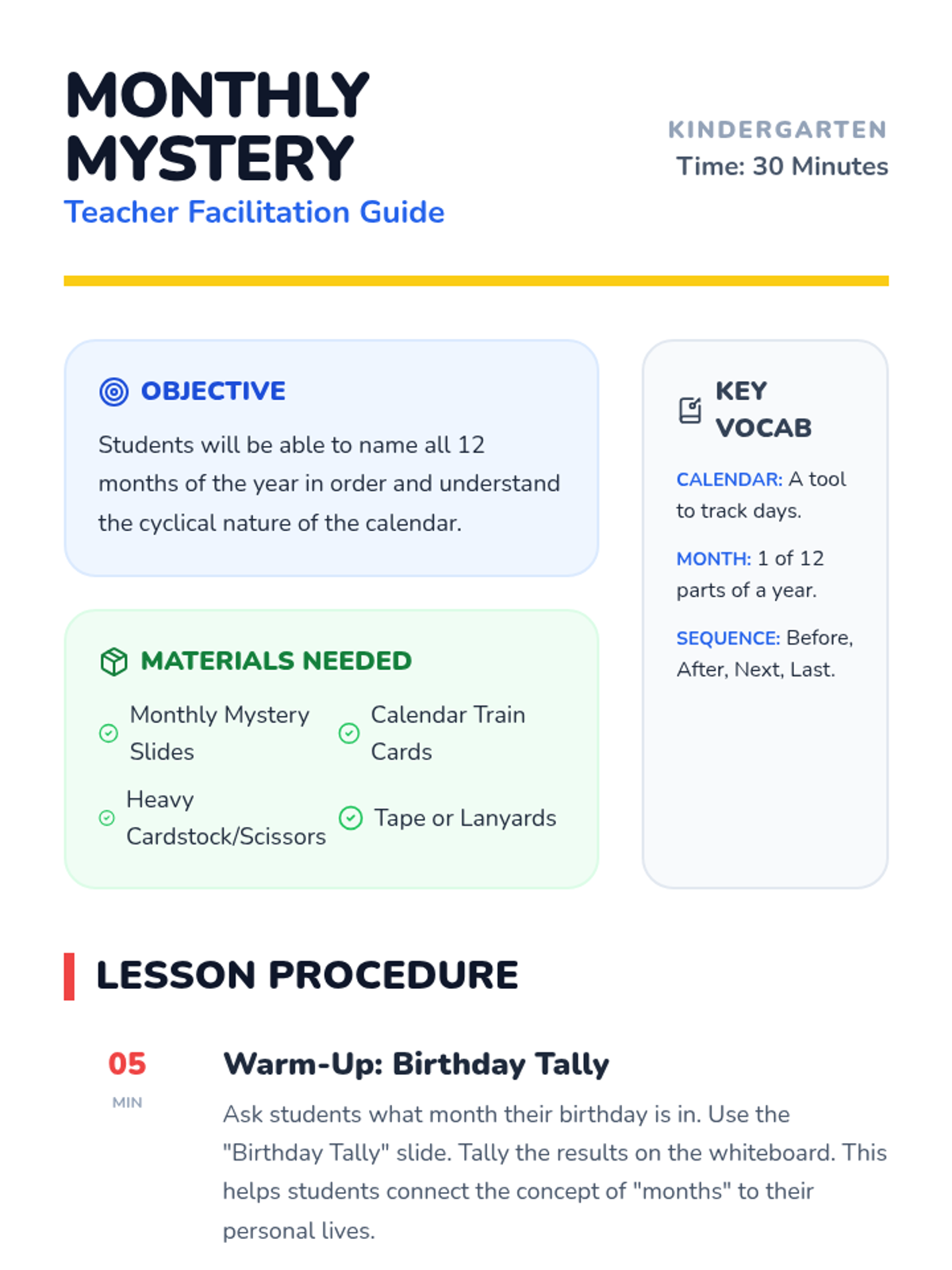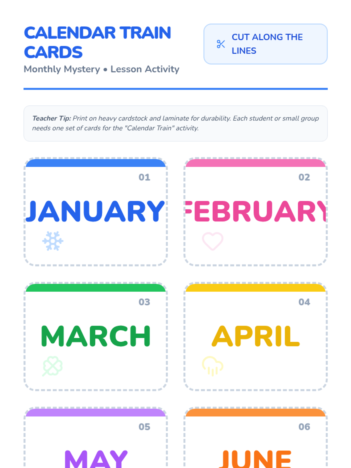 A fun, interactive lesson where Kindergarten students learn the 12 months of the year through song, movement, and a 'Calendar Train' activity. Students help Justin solve his vacation mystery while mastering the sequence of the months.