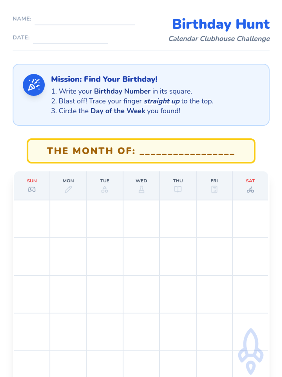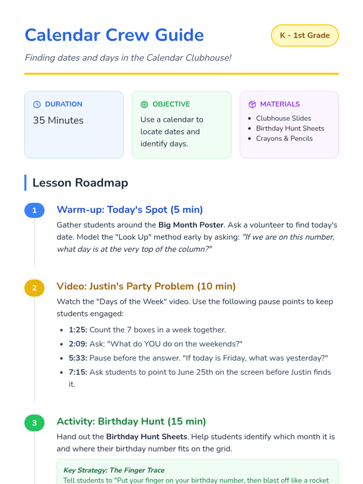 A fun, interactive lesson for K-1 students to learn how to navigate a calendar, identify days of the week, and locate specific dates using the 'look up' method.