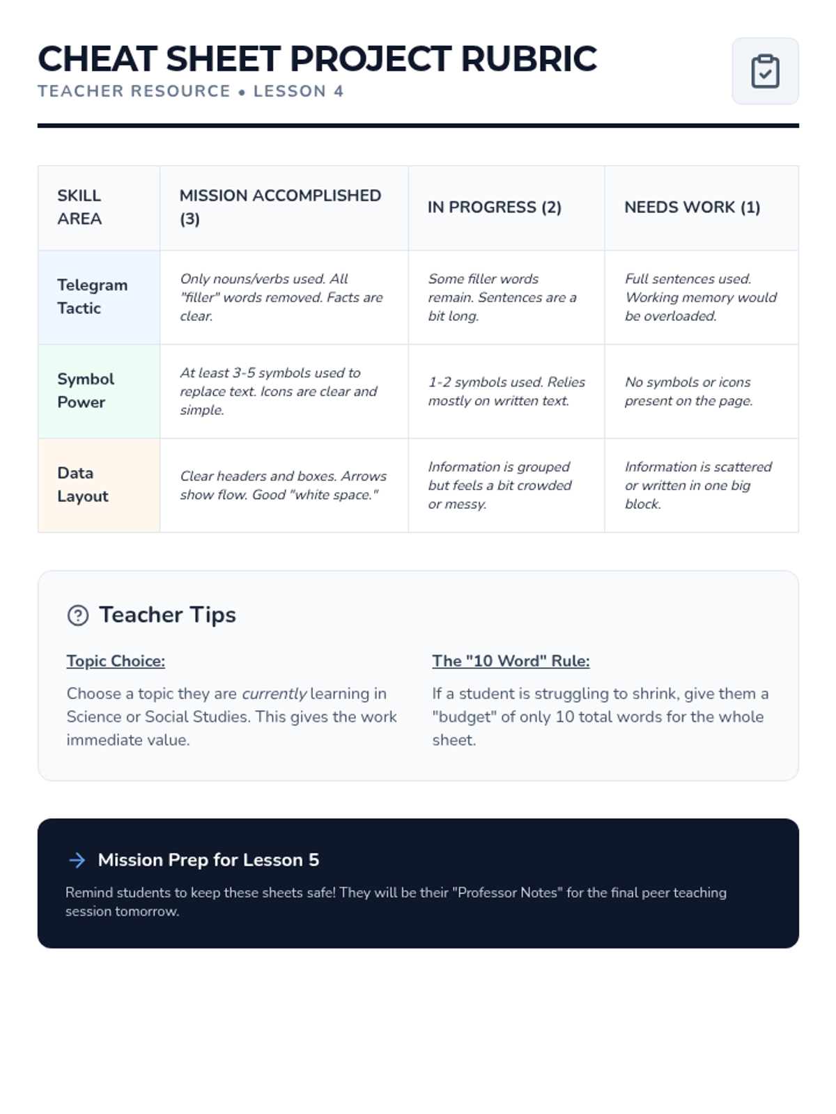 Students synthesize their summarization and symbolic skills to create a high-impact, one-page reference sheet for a complex topic.