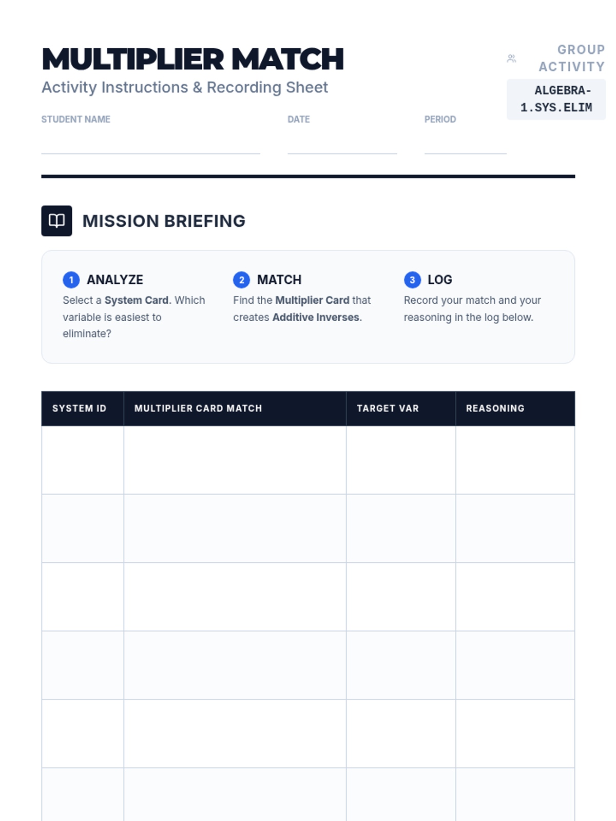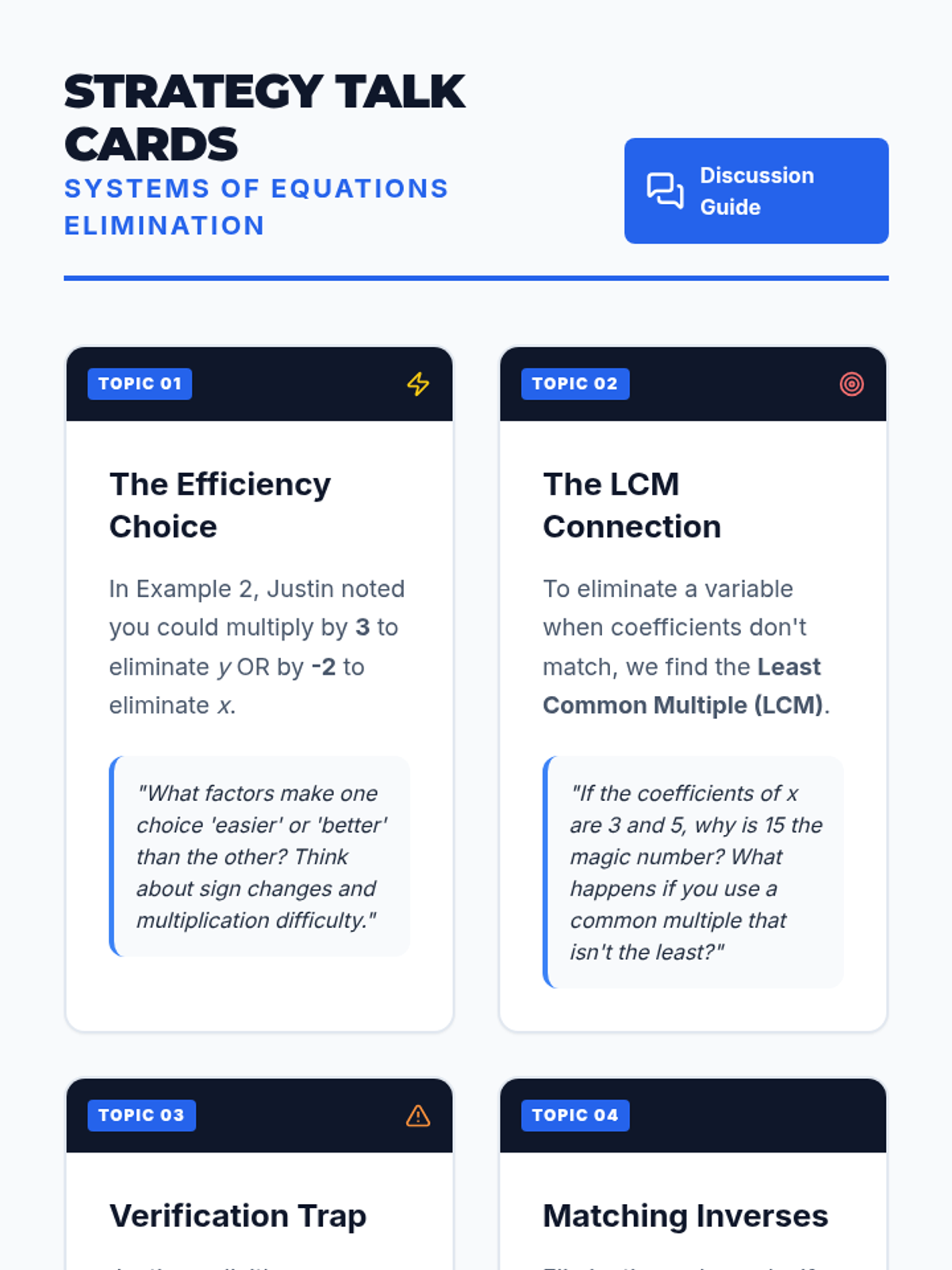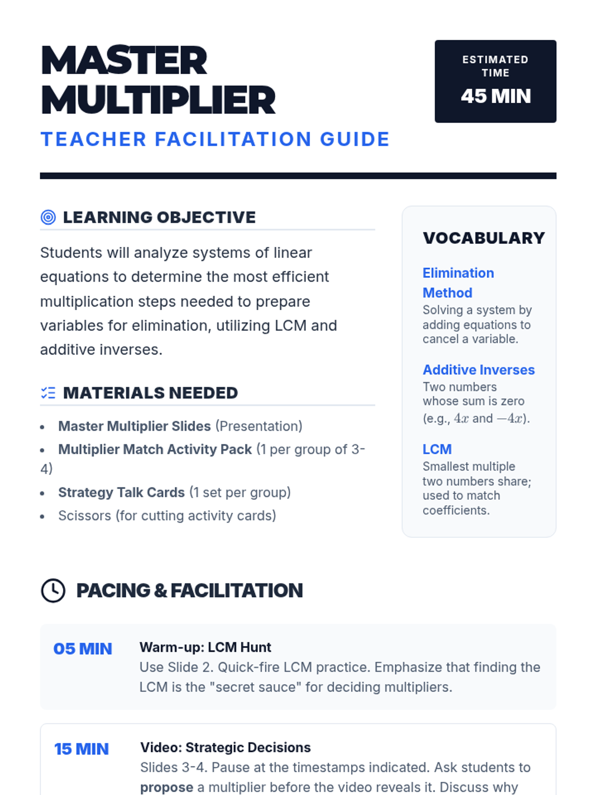 Students will learn to analyze systems of linear equations to determine the most efficient multiplication steps needed to prepare variables for elimination, including finding the Least Common Multiple (LCM) and identifying additive inverses.