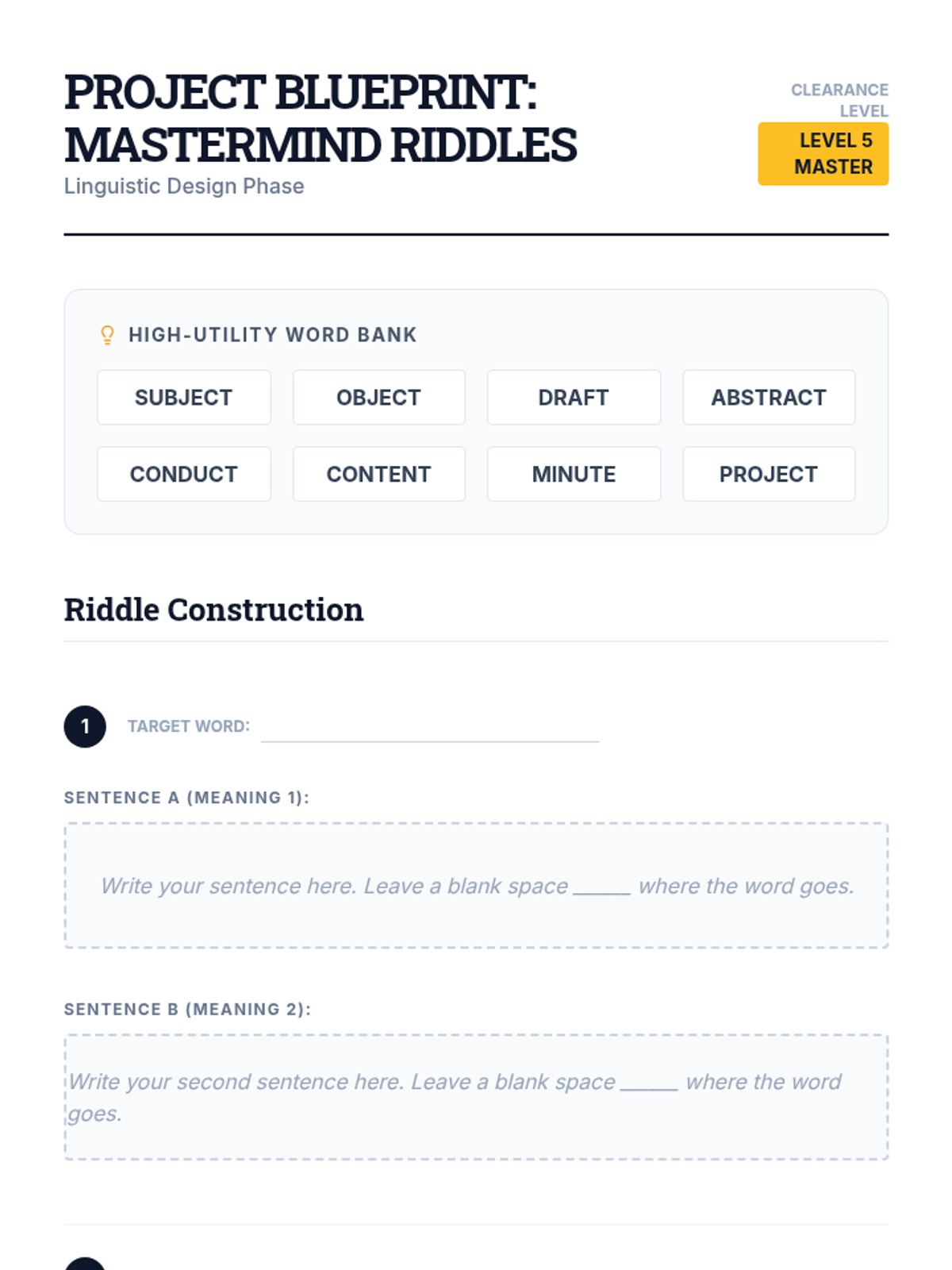 Students write their own set of sentences using high-utility academic homonyms, challenging peers to define the words based solely on provided context.