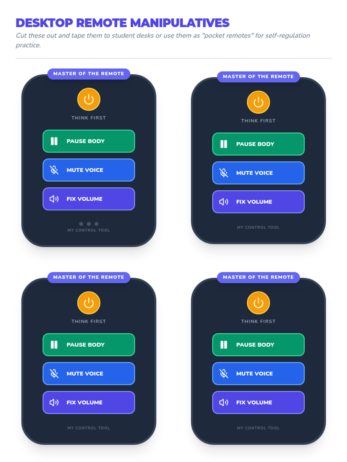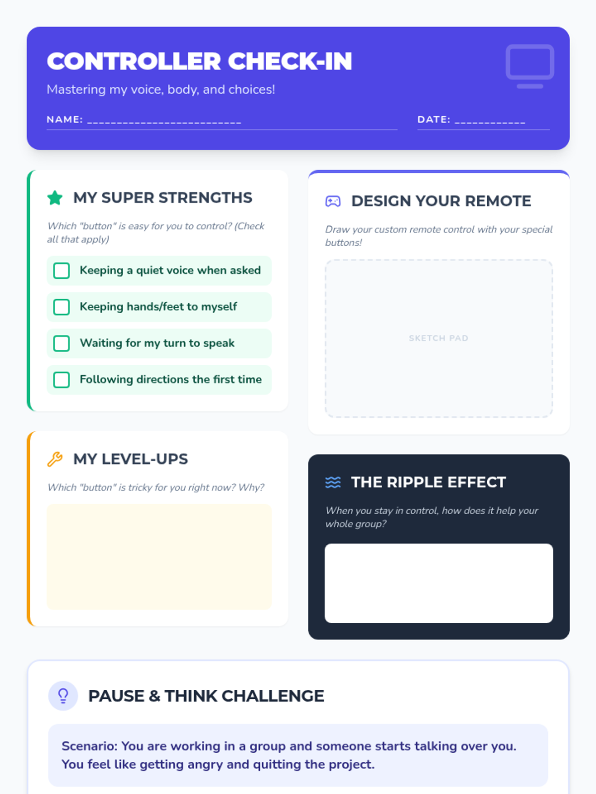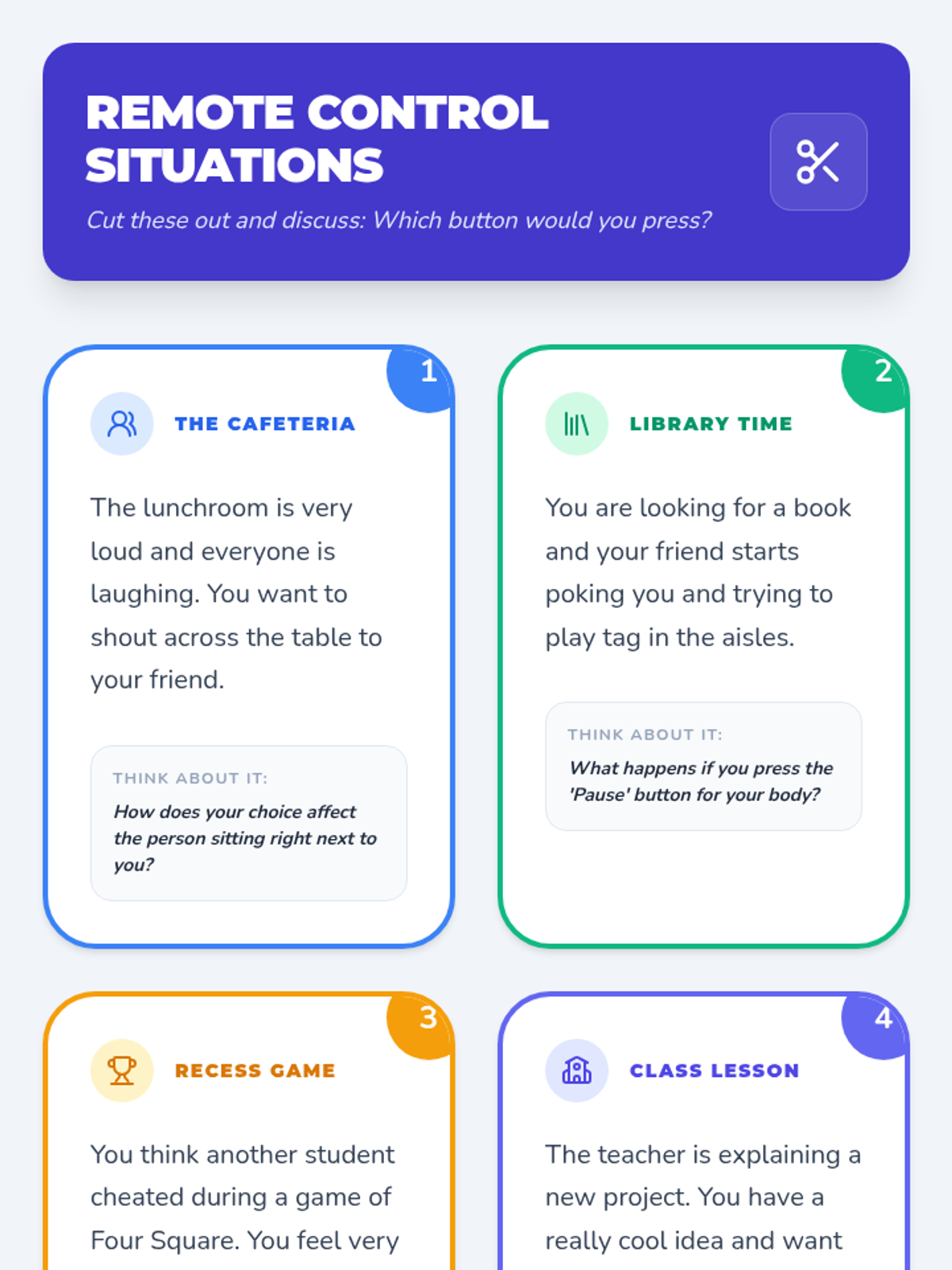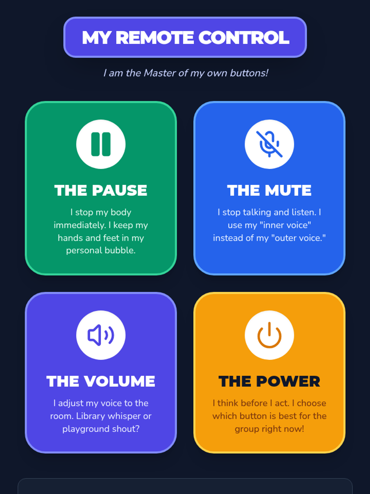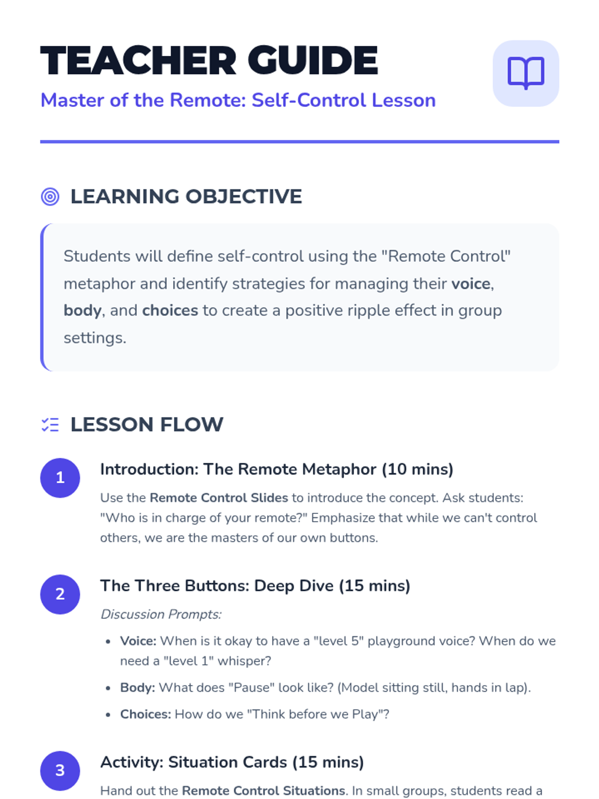 A lesson for grades 2-4 focusing on self-control as a 'remote control' for one's own voice, body, and choices, emphasizing the positive ripple effect on others.