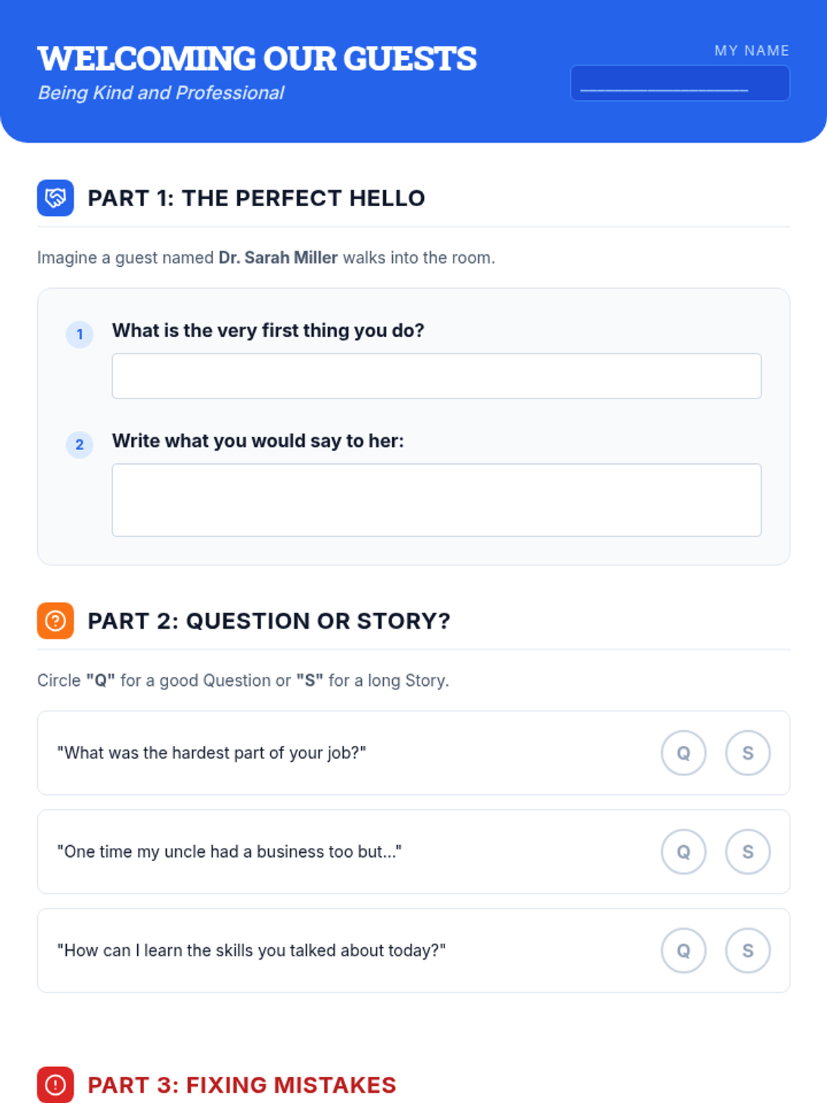 A comprehensive lesson on professional etiquette for hosting special guests, covering everything from initial greetings to active listening and appropriate conversation.