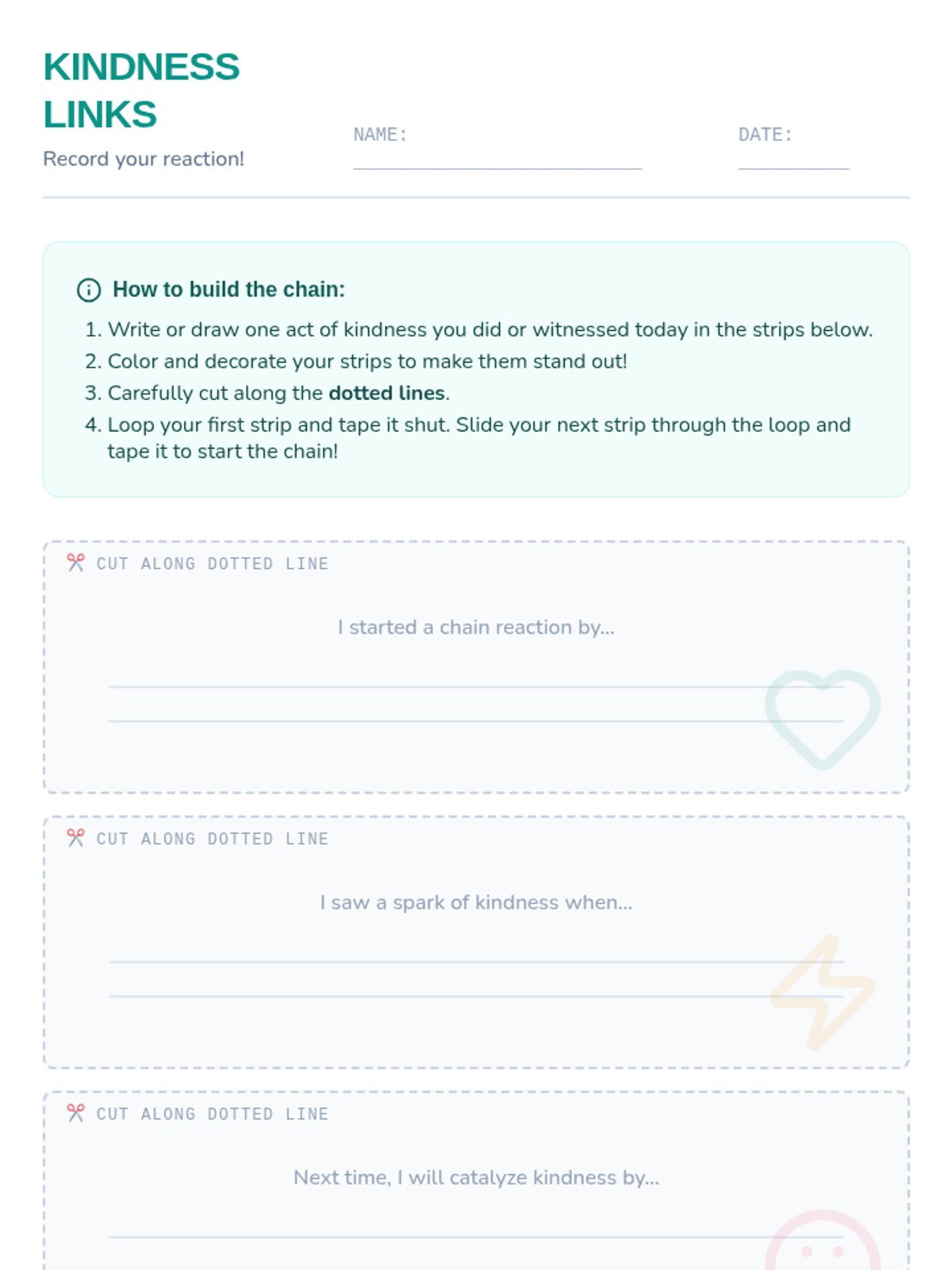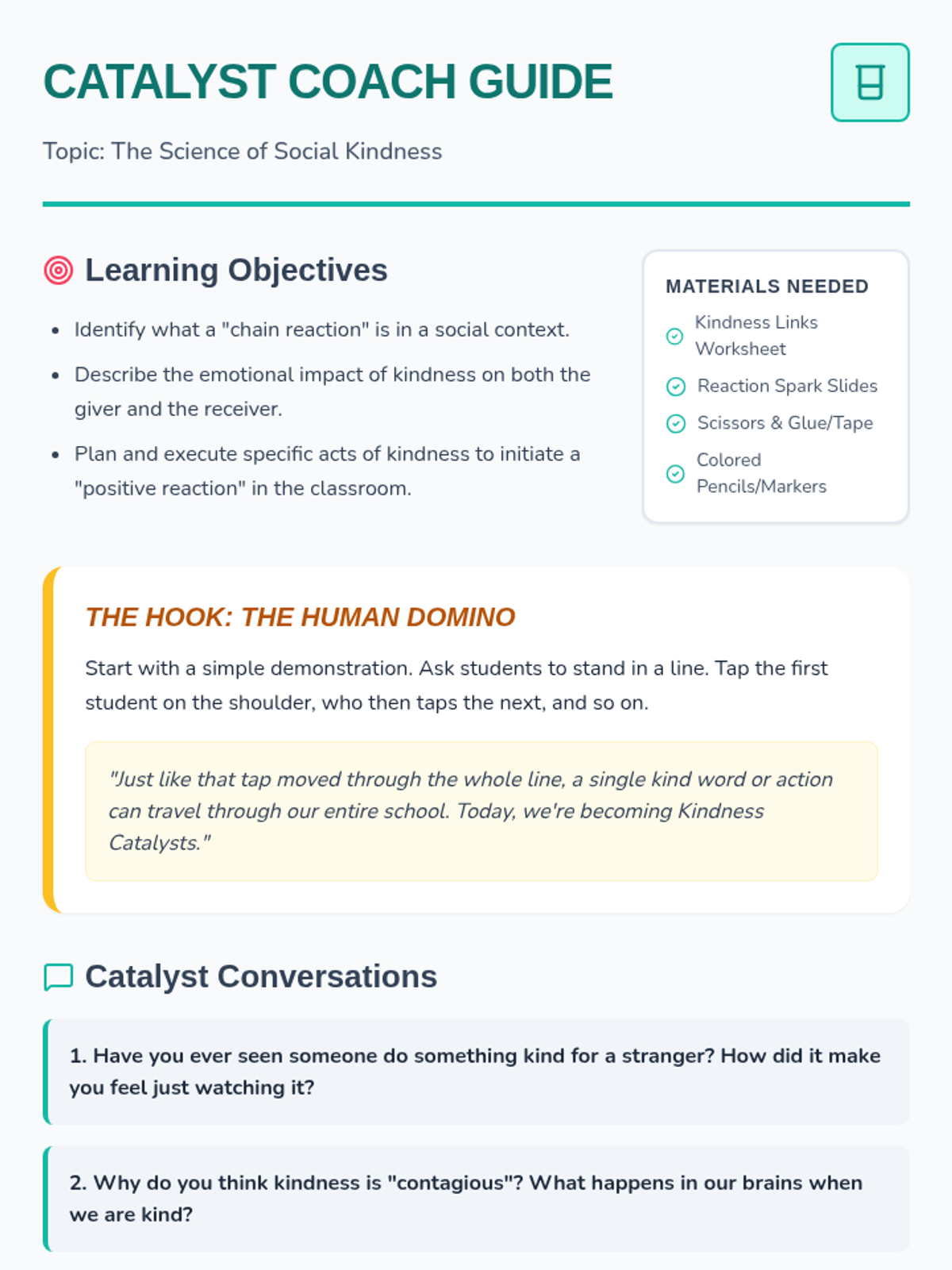 This lesson explores the concept of kindness as a chain reaction, showing students how one small act can inspire a wave of positivity through their community.